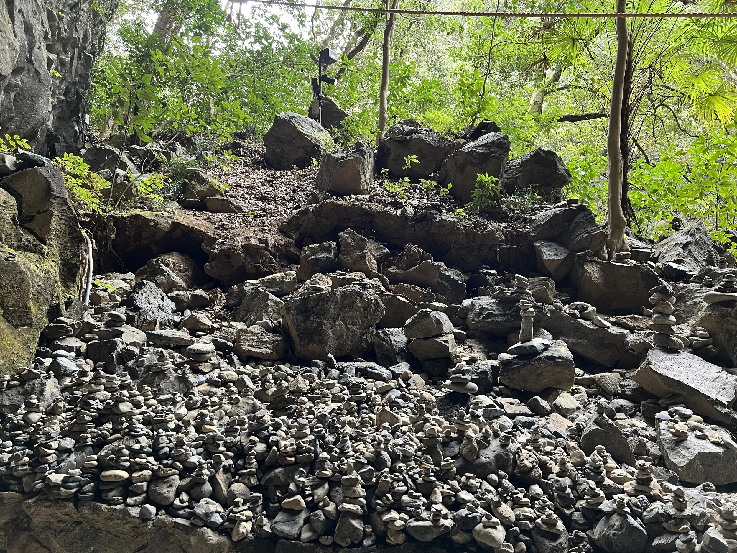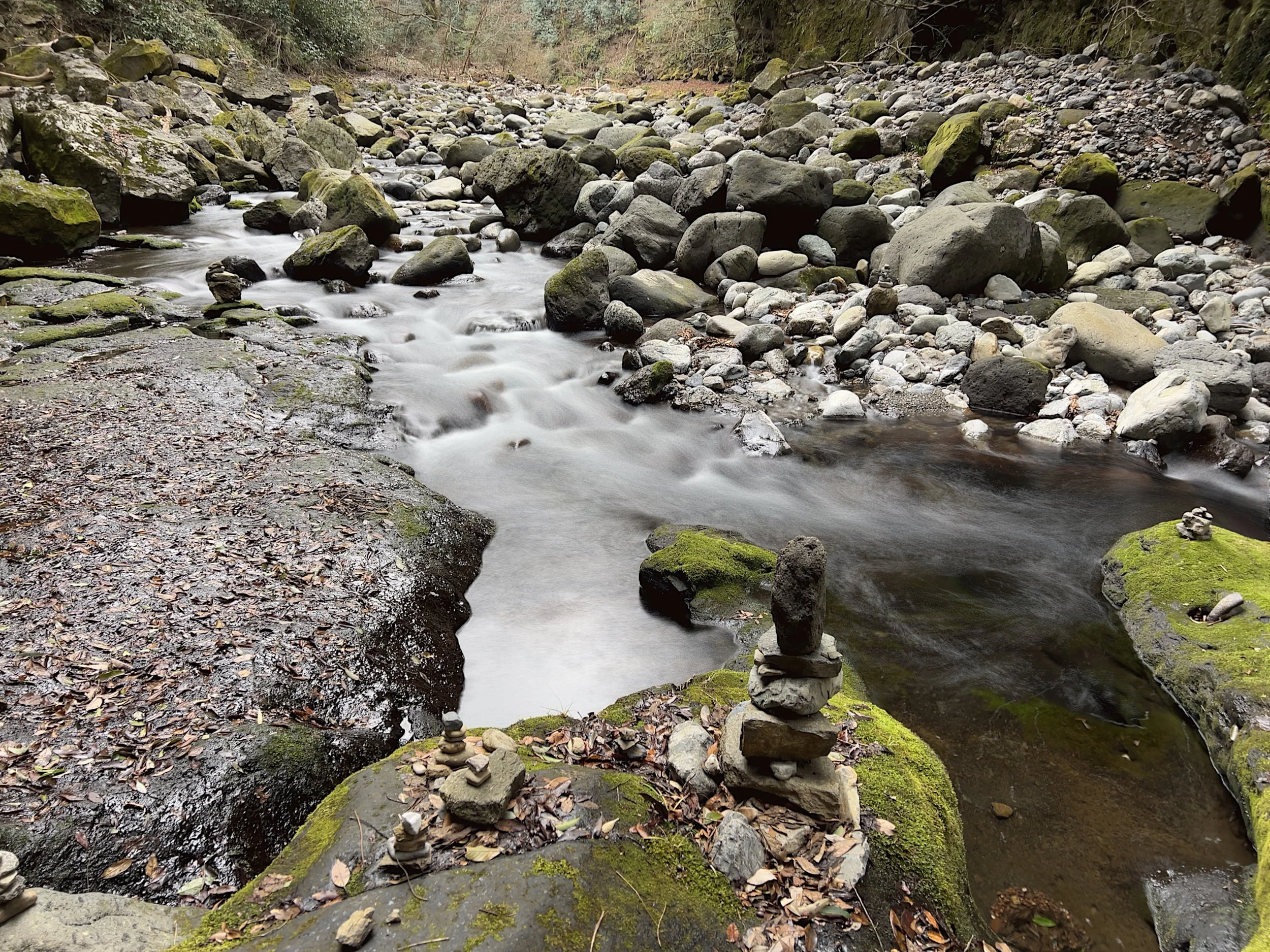 Along this path, I began to notice stone stacks placed beside the trail—offerings left behind by pilgrims marking their visit. At the end of the path lies a shallow cave with a simple shrine inside, surrounded by hundreds of carefully stacked stones. This place is known as Amano Yasukawara and is believed to be where the gods and goddesses gathered to discuss how to lure Amaterasu out of her hiding place.