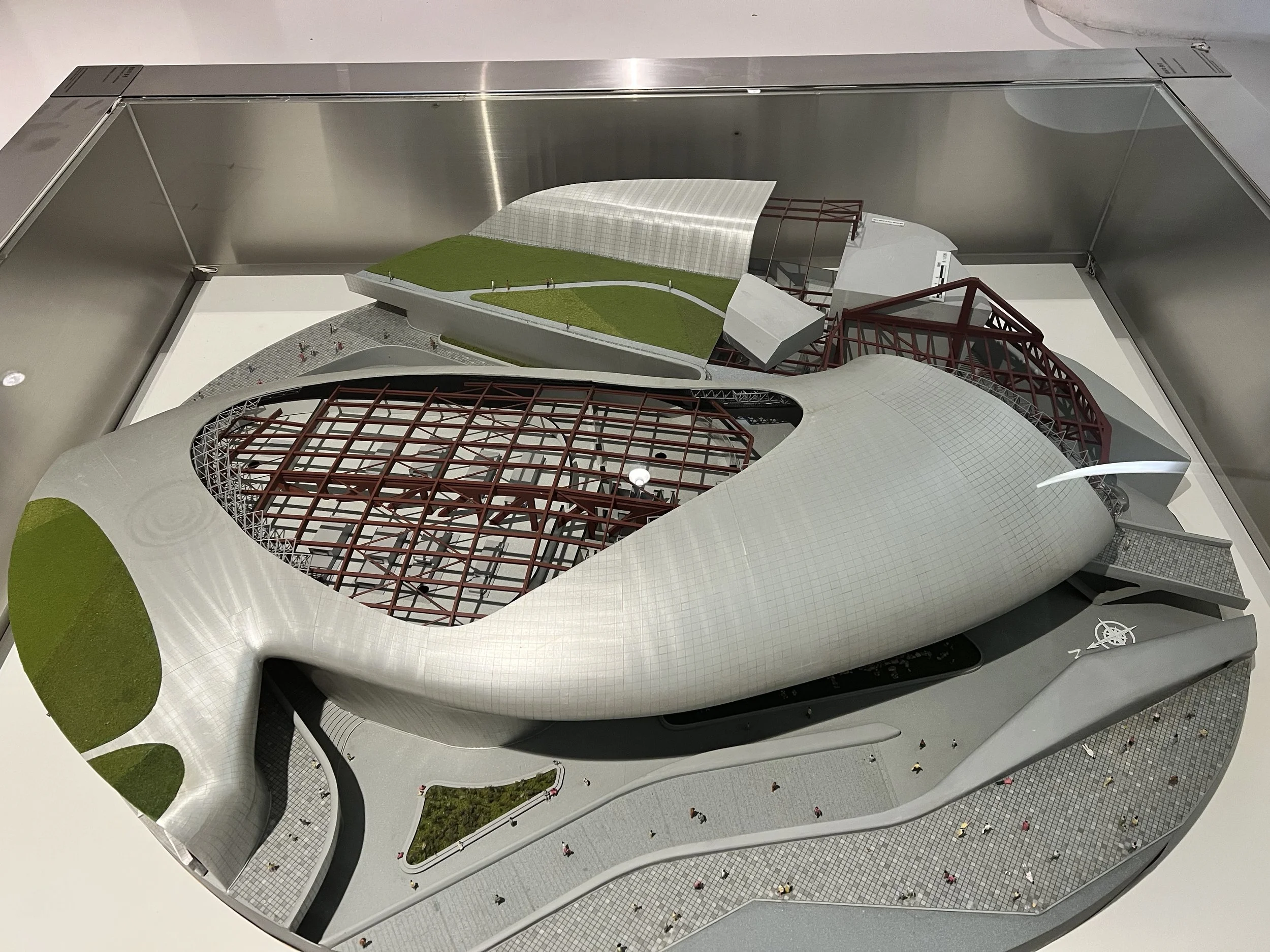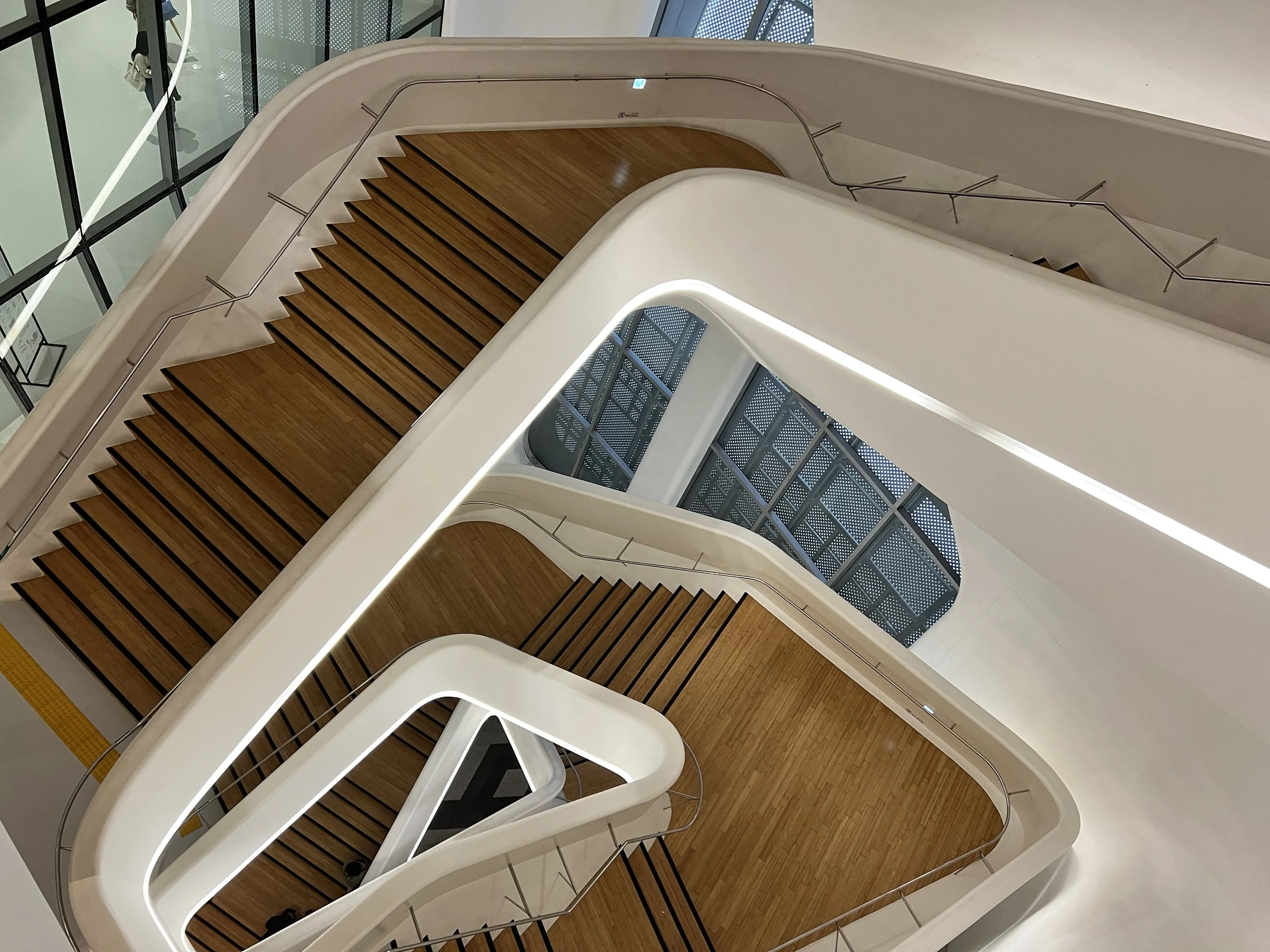One of my favourite features was the staircase design. It has all the hallmarks of Zaha Hadid’s work—fluid lines, raw concrete, and perforated metal panels that create a futuristic, almost sculptural look. I loved the top-down view of the curving stairwells, and walking through the winding interior corridors felt like exploring an endless maze. The tour also showcased an exhibition of architecture students’ models, which added a fun glimpse into creative design concepts.