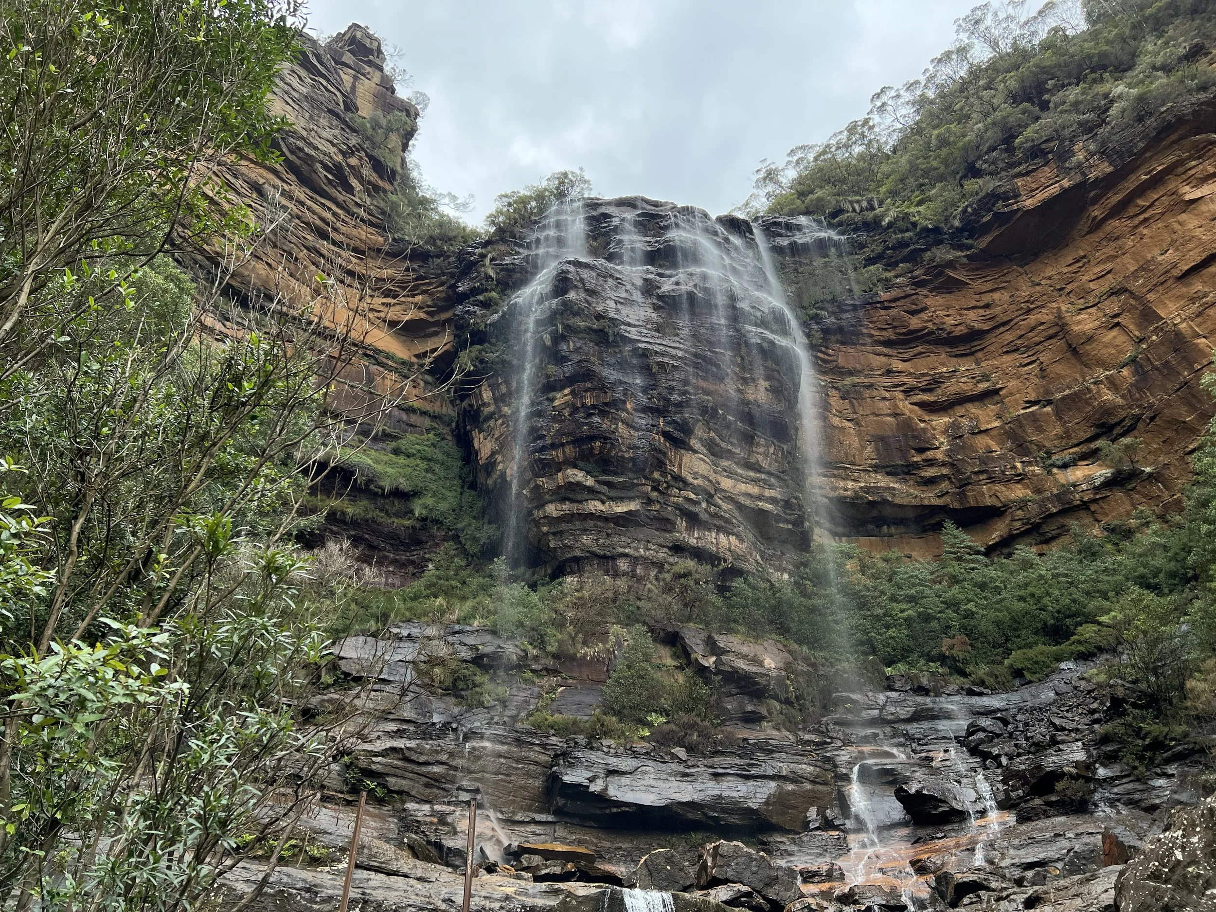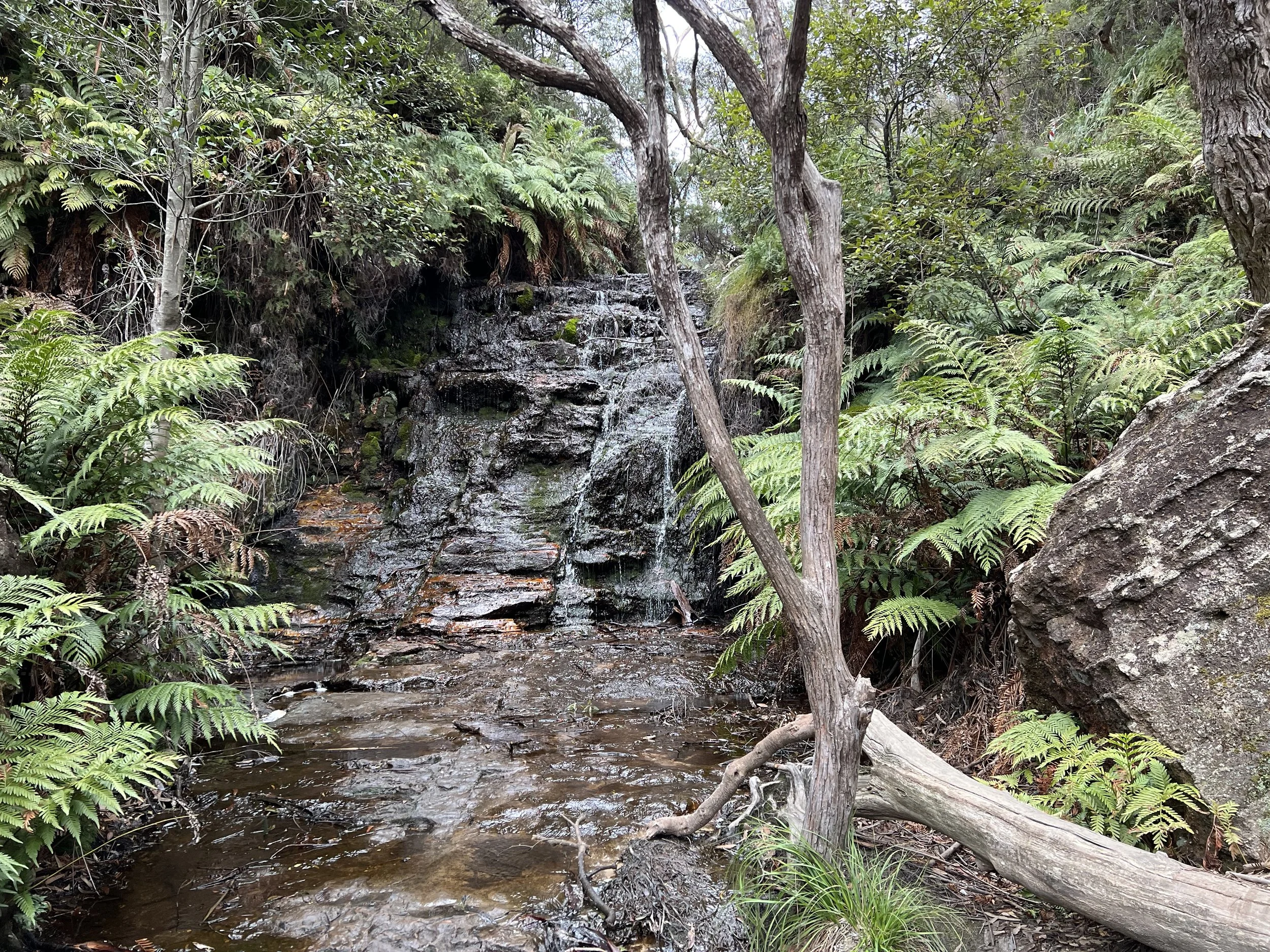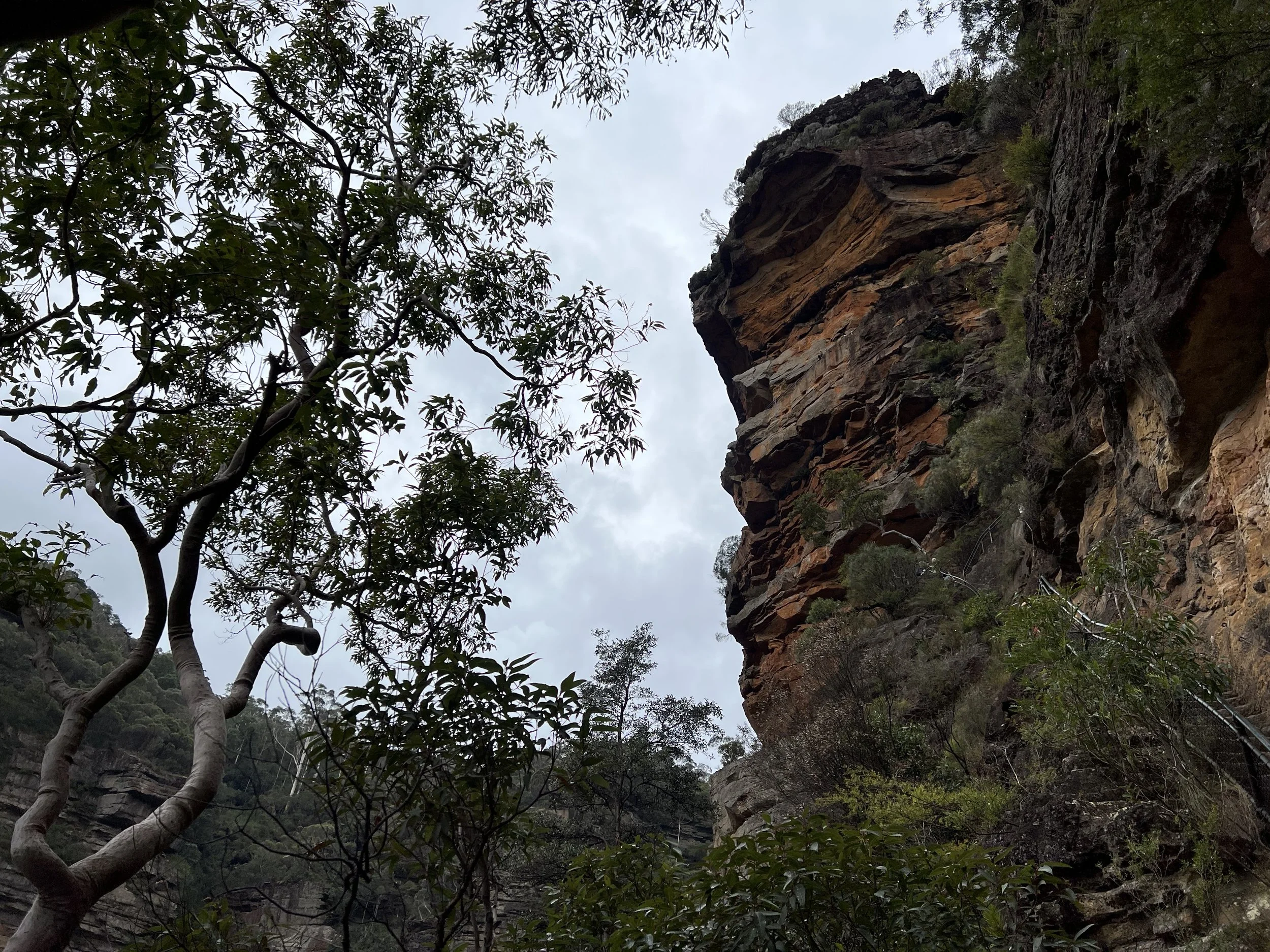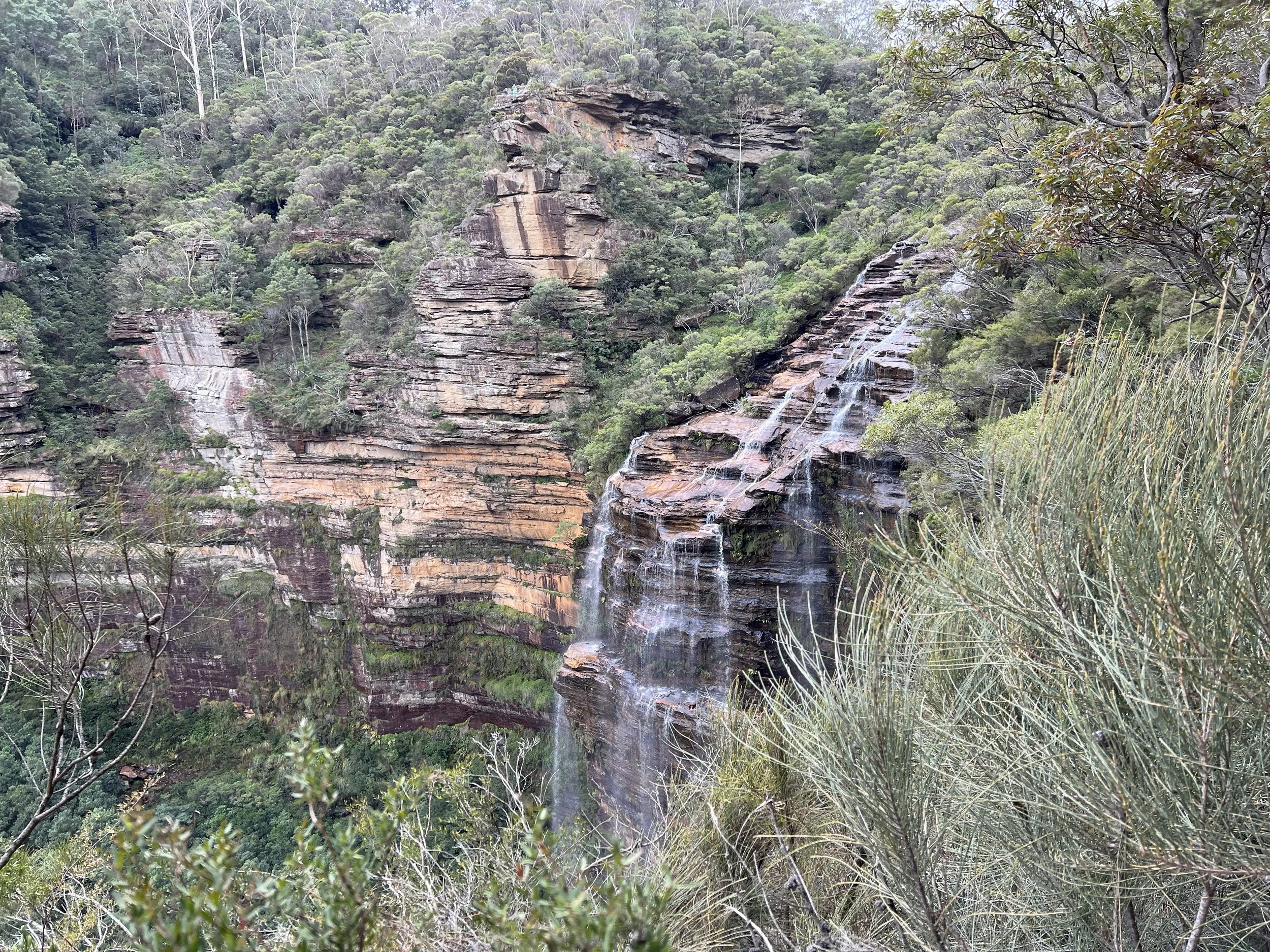 Our group walked the Overcliff–Undercliff Track, a trail known for its low overhangs, hanging tree roots, and a series of lookouts that open up to sweeping valley views. As we made our way along the track, our guide shared stories and history about the region. From Wentworth Falls Lookout, we enjoyed our first full view of the waterfall, then continued to Fletchers Lookout where the views of the sandstone cliffs and the plateau were even more striking. Here, the guide offered the option to continue further down the trail. Only a few of us took him up on it, and I’m glad I did—I wanted to see the falls up close. The descent was steep, but the climb back up was the true workout. Still, the photos and the perspective were well worth the effort.
