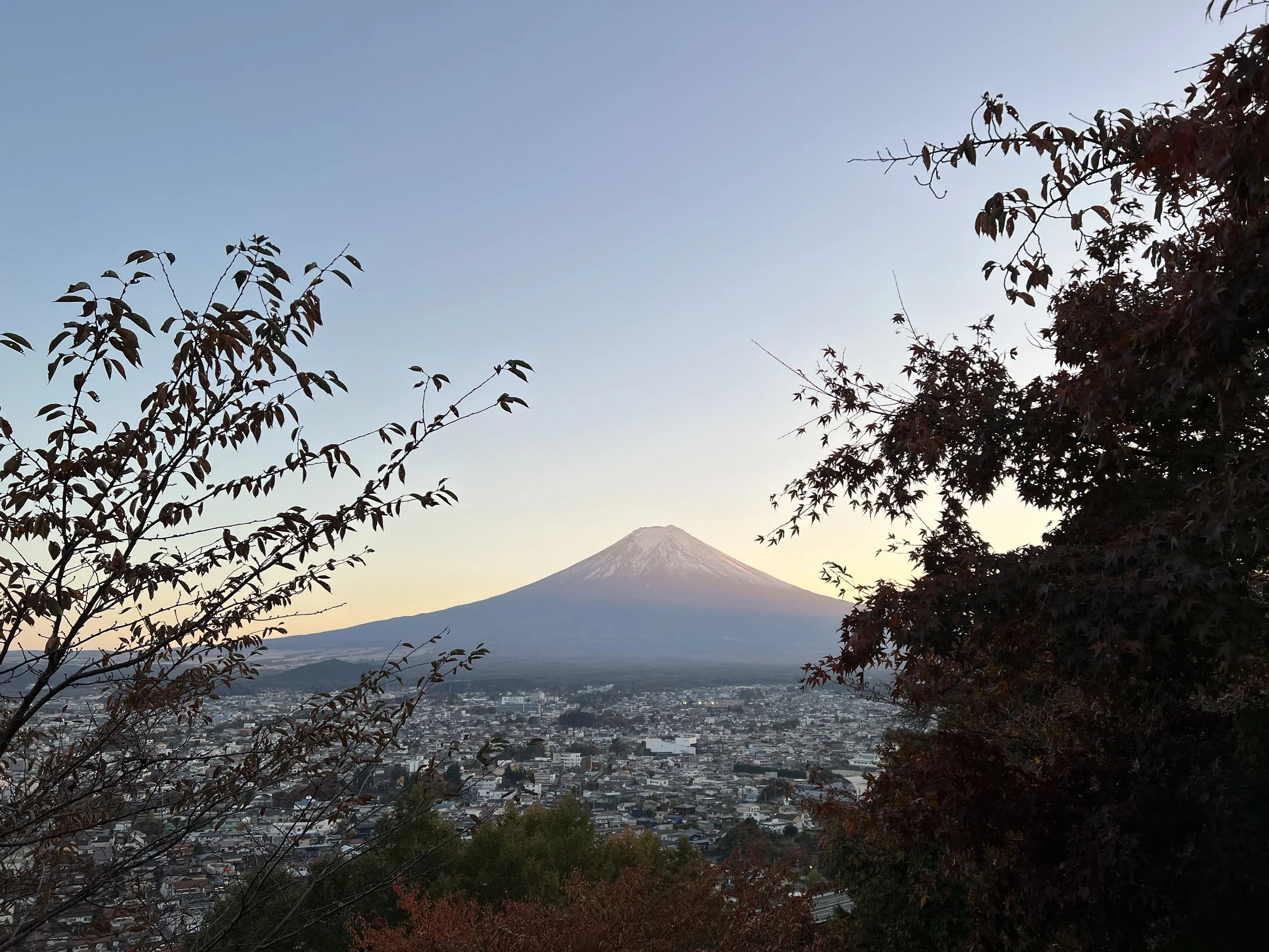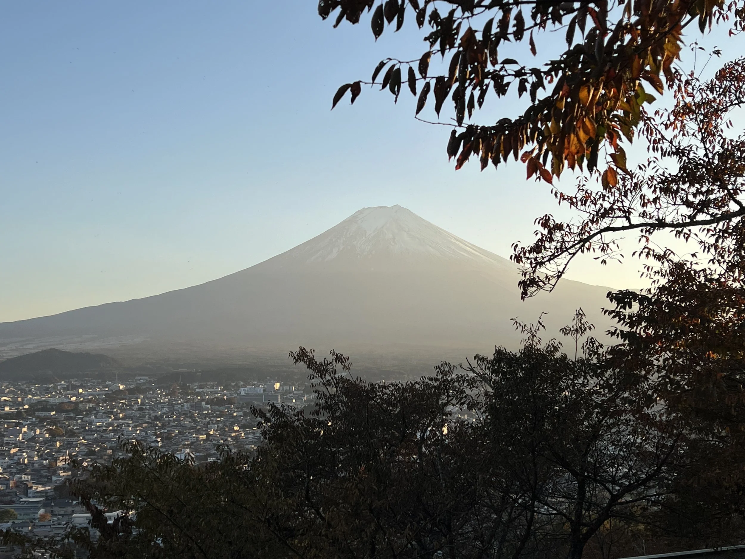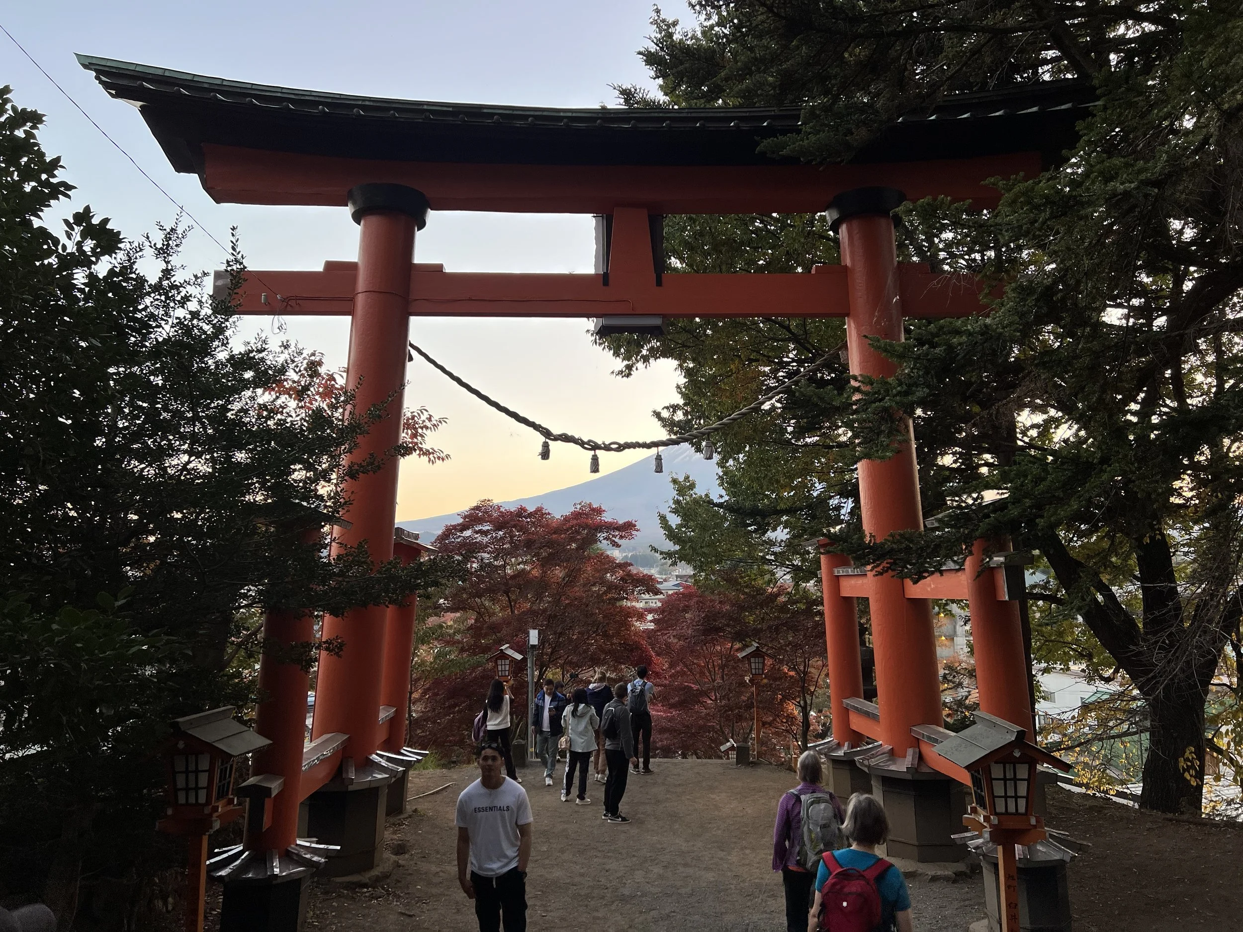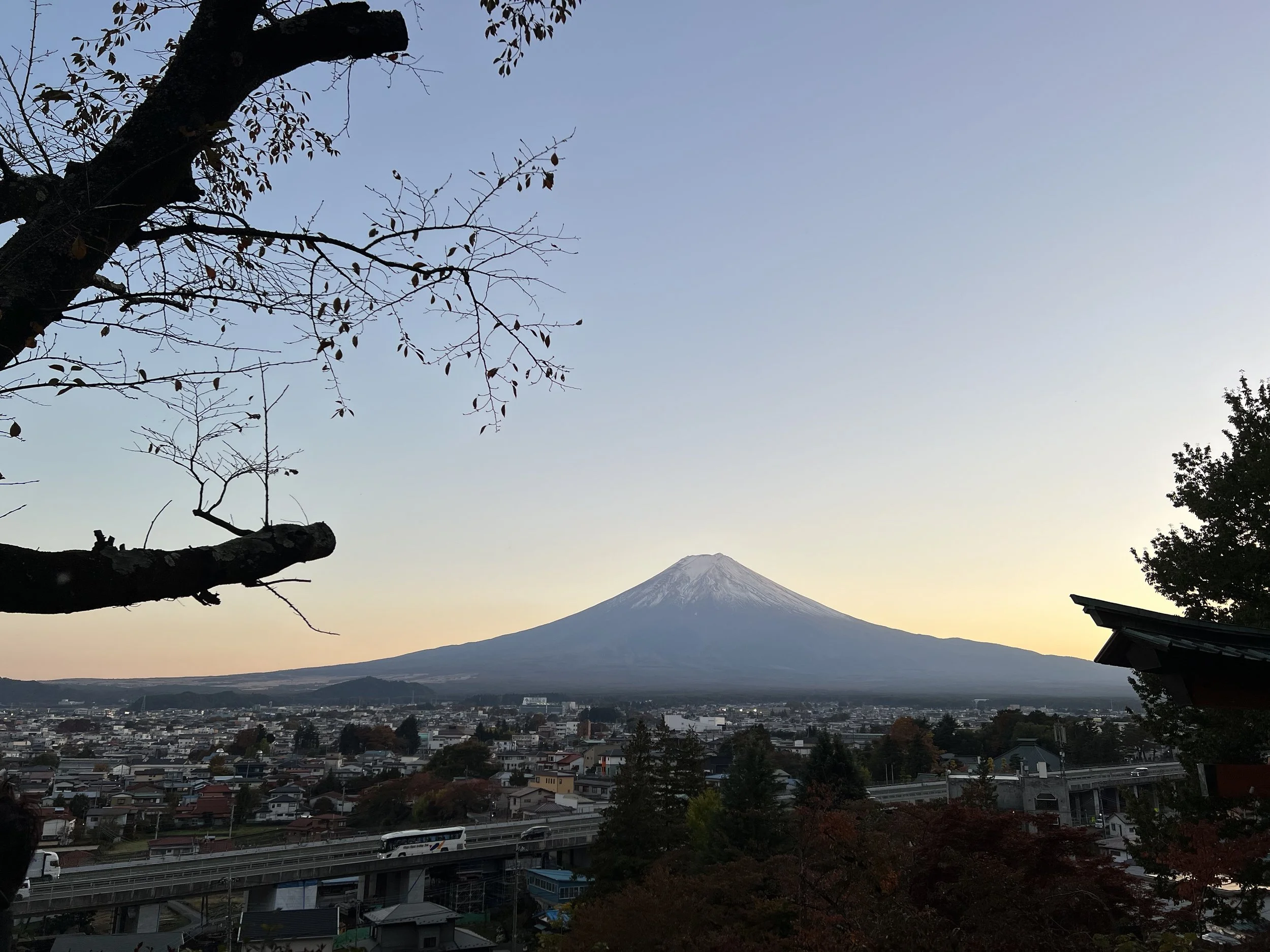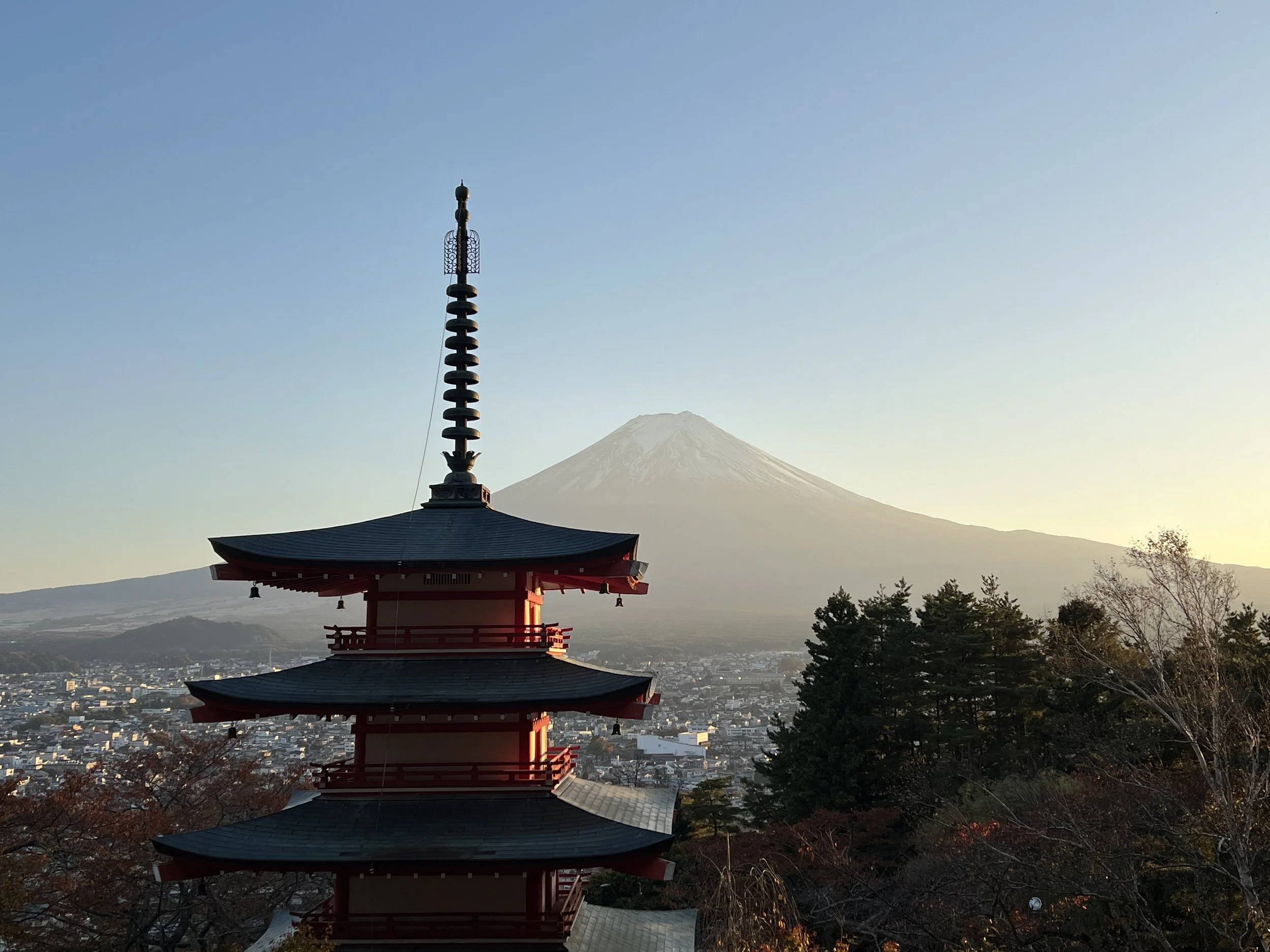 My knee was still sore from an earlier hike, so I climbed slowly while a group of local school kids sped past, running up and down the steps as part of their training. At the top, there’s a small seating area where I finally caught my breath. The view was absolutely stunning — the iconic five-story pagoda perfectly framed against Mount Fuji. The sun didn’t set directly behind the mountain, but the warm orange glow that spread across the sky made the scene feel almost surreal.
