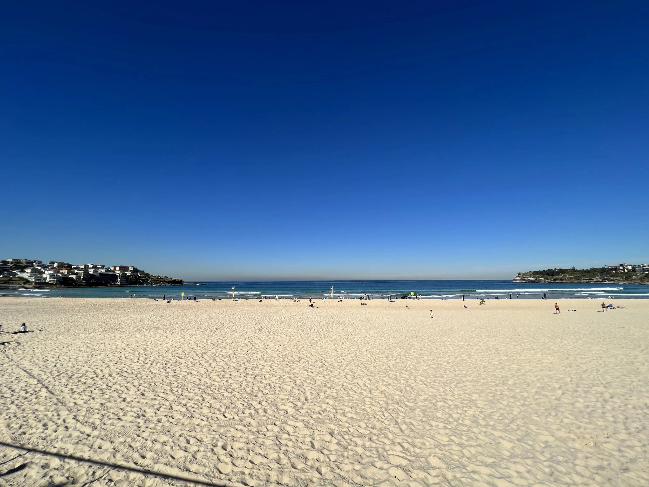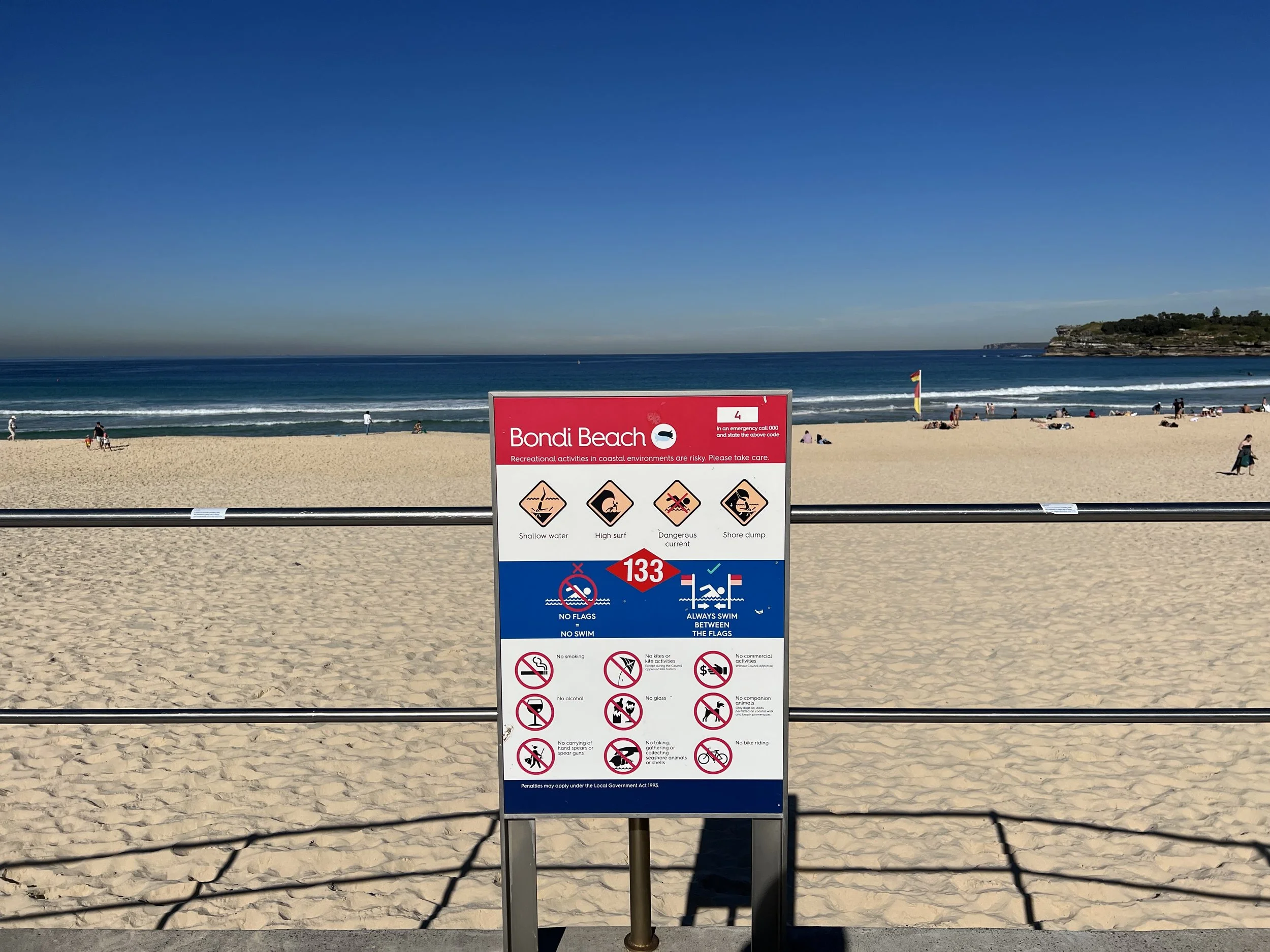 About 10 minutes later, I reached my goal for the day—Bondi Beach. The sand here was even whiter and finer than the other beaches I had passed, which made walking across it surprisingly tiring. Numerous signs along the beach warn visitors of changing conditions and potential hazards, a reminder of the strong currents Bondi is known for.