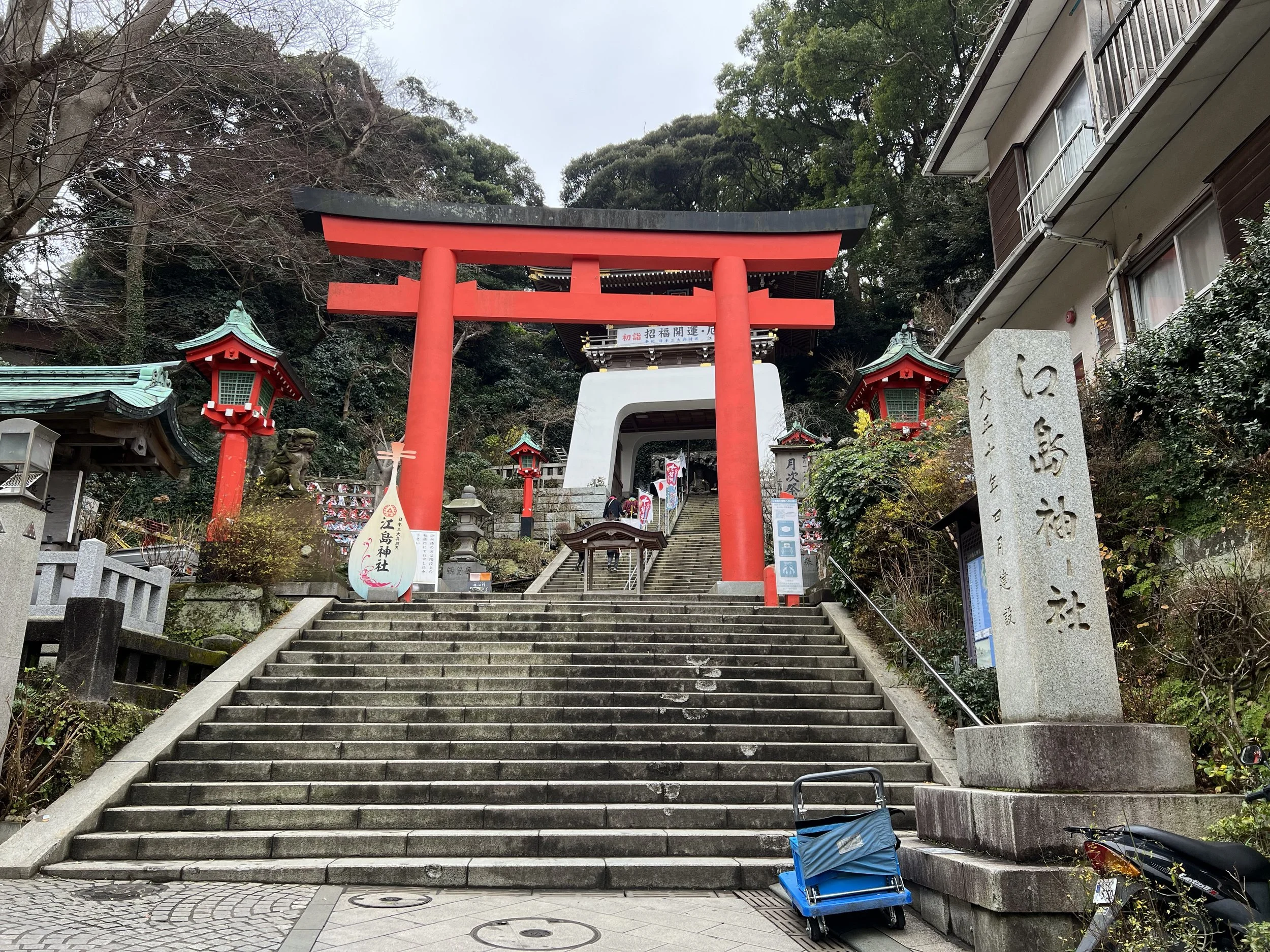 I made my way from Kamakura Station to Enoshima Station and continued on foot toward the island. Crossing the bridge, one of the first landmarks you encounter is a bronze torii gate marking the entrance to Enoshima Shrine. From there, the path leads through a lively shopping street filled with food stalls and souvenir shops before reaching the striking vermilion torii gate and staircase that lead up into the shrine grounds.