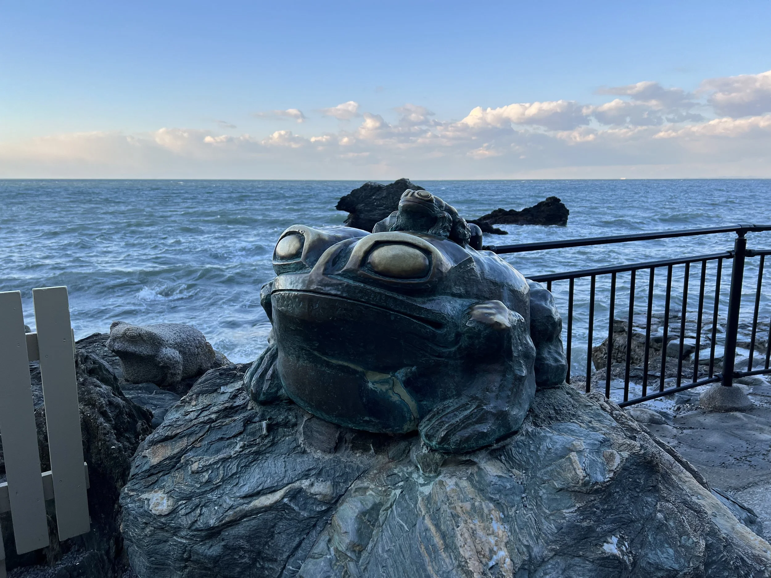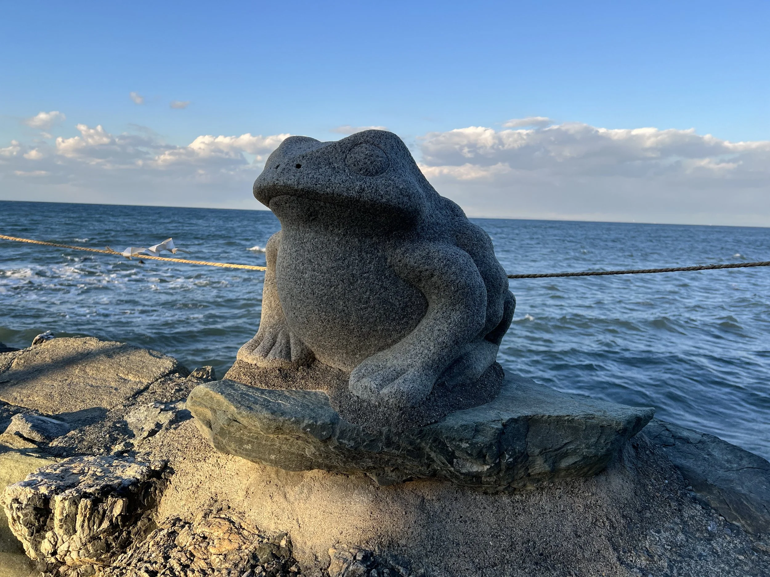 The shrine is also known for its numerous frog statues, symbolizing safe return and protection for travellers—a theme that aligns with its historical role as a place of cleansing before continuing onward to Ise.