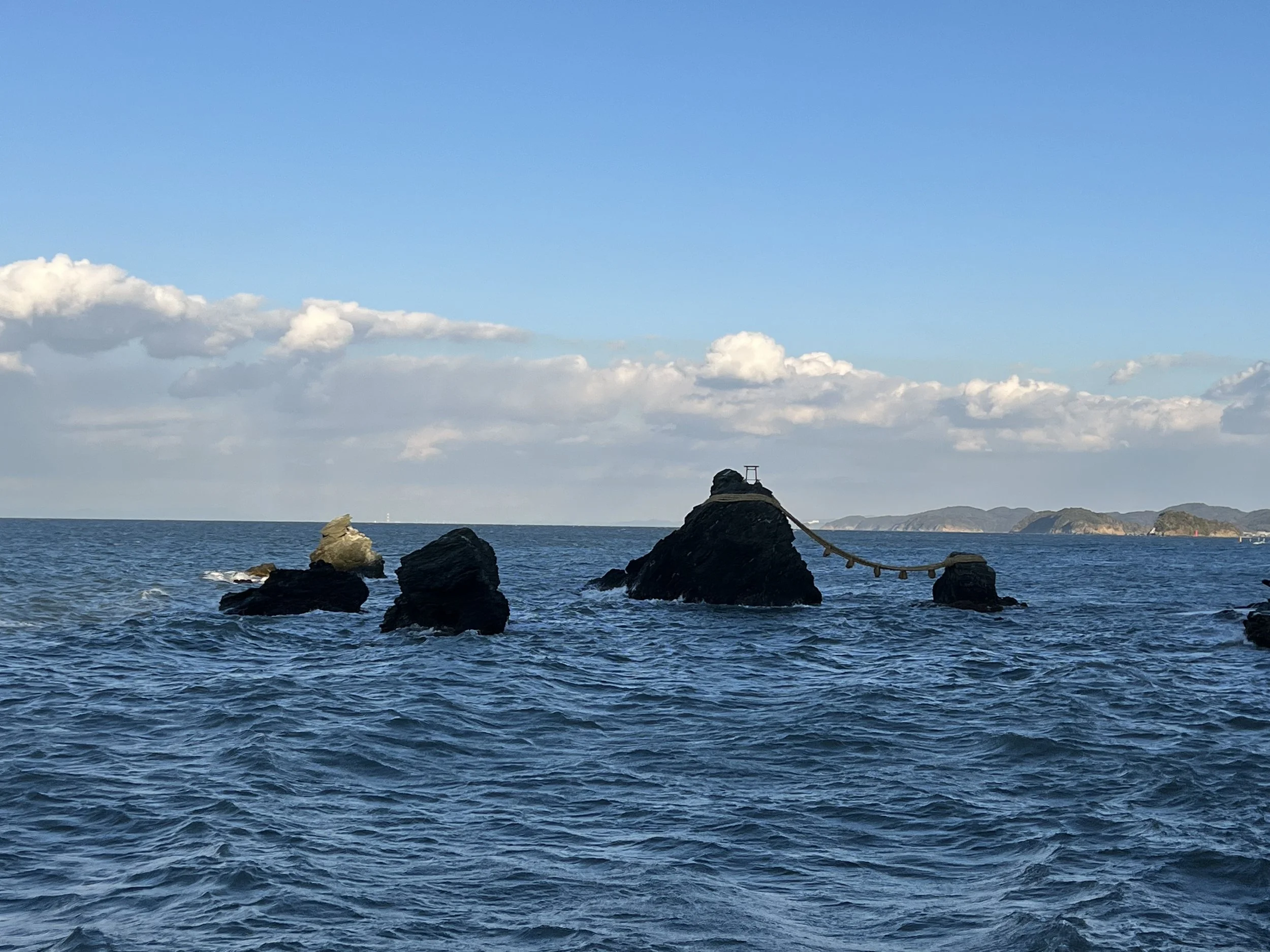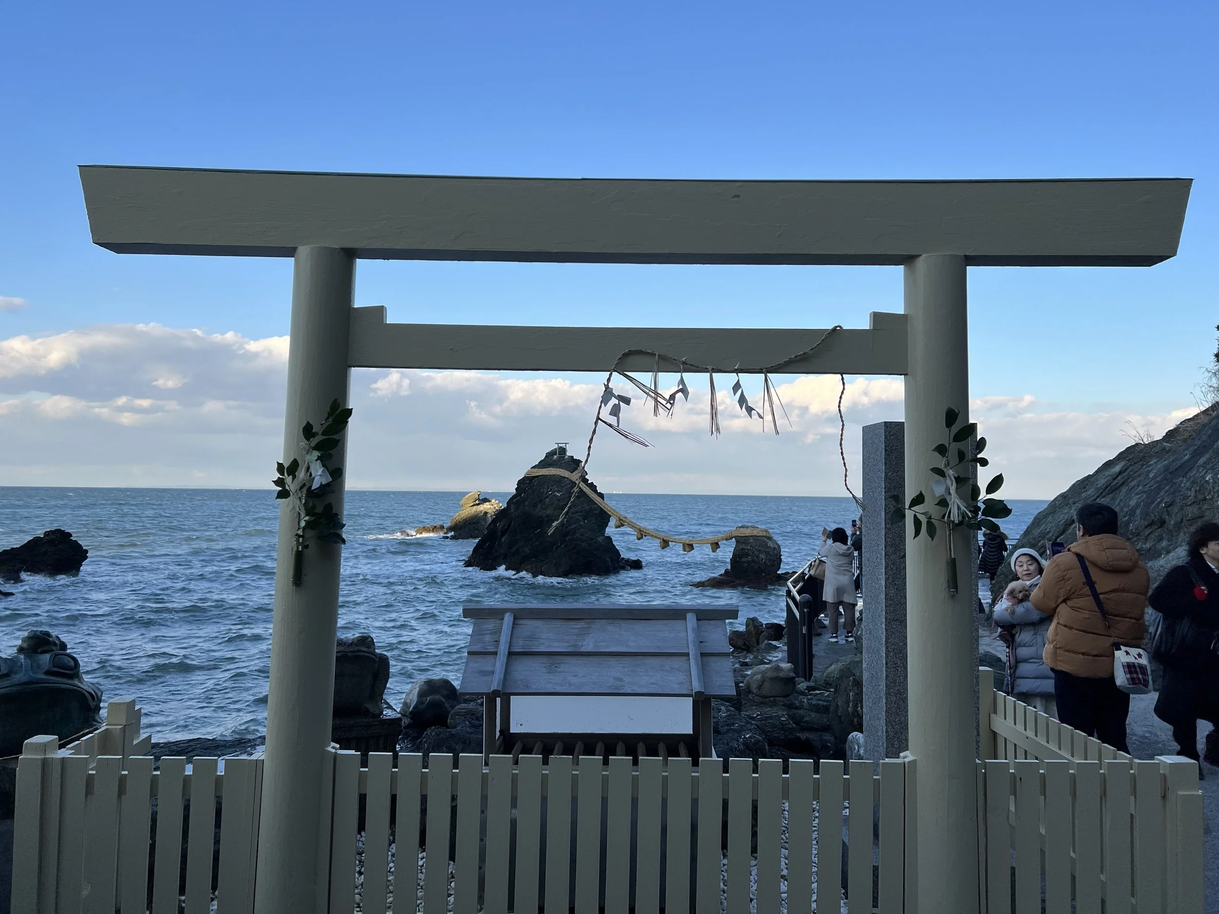 I ended my day with a visit to Futami Okitama Shrine for its iconic coastal view. The shrine is best known for the Meoto Iwa, or “wedded rocks.” Rising out of the sea, the larger rock represents the husband, while the smaller one represents the wife. The two are bound together by a thick shimenawa rope, symbolizing the connection between them—as well as the boundary between the human and divine worlds.