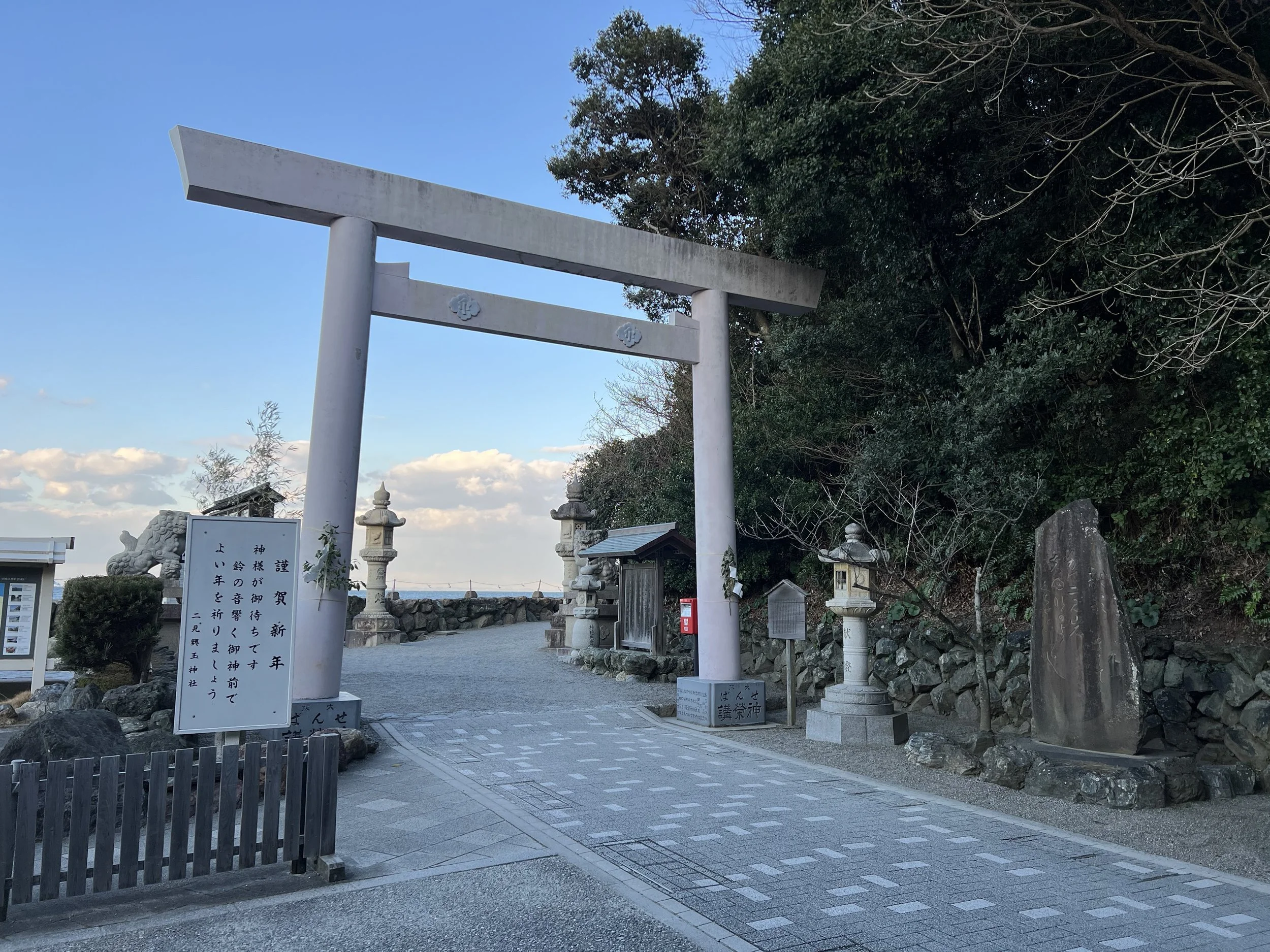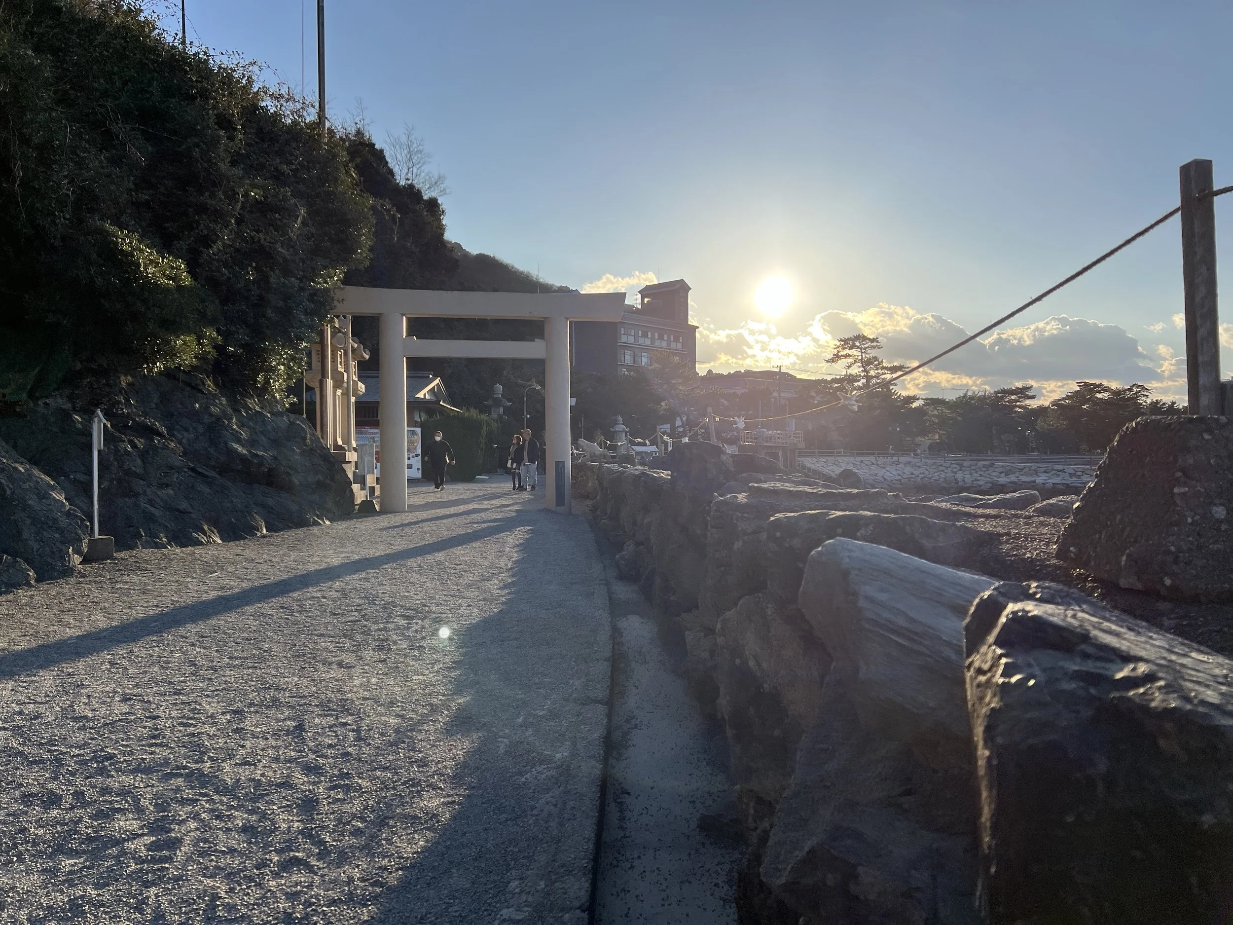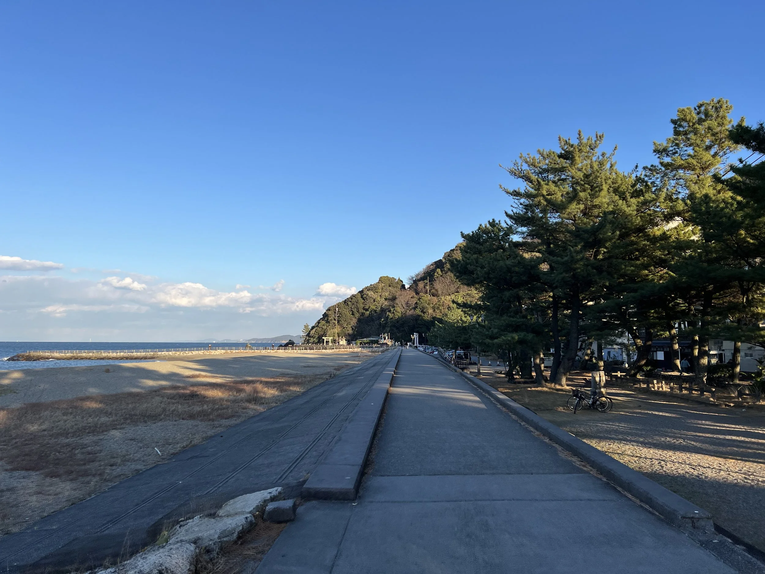 I timed my visit toward the end of the day, hoping to catch the sunset. From Toba Station, I took a short train ride to Futaminoura Station, then began the walk toward the shrine. It’s not far, but it’s one of those walks that you don’t mind taking your time with. The path leads along the coastline through Futaminoura Beach and a small park area, lined with pine trees and open views across Futaminoura Bay.
