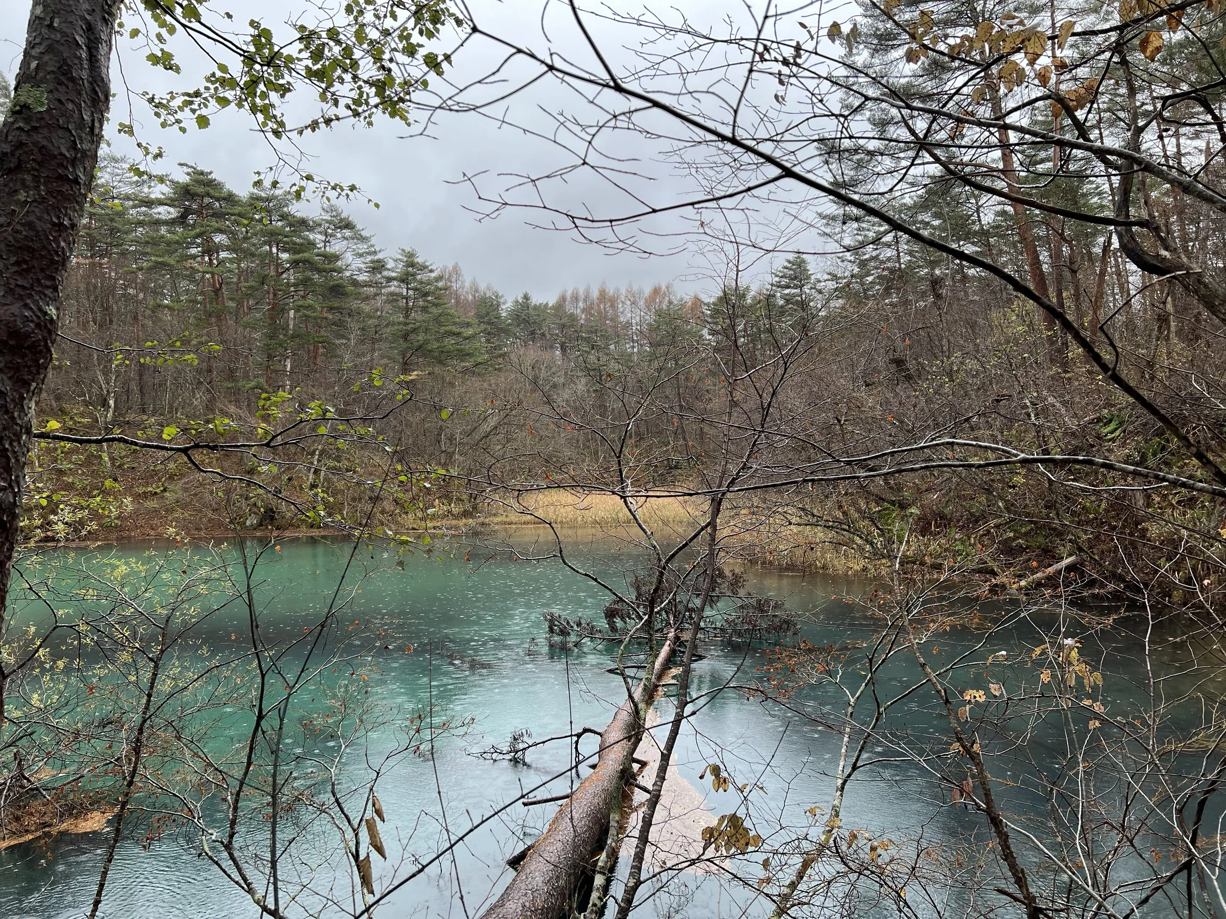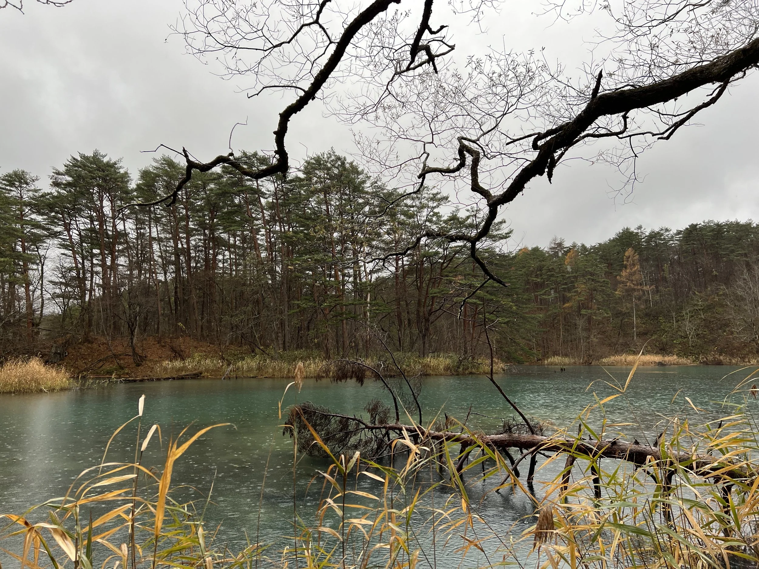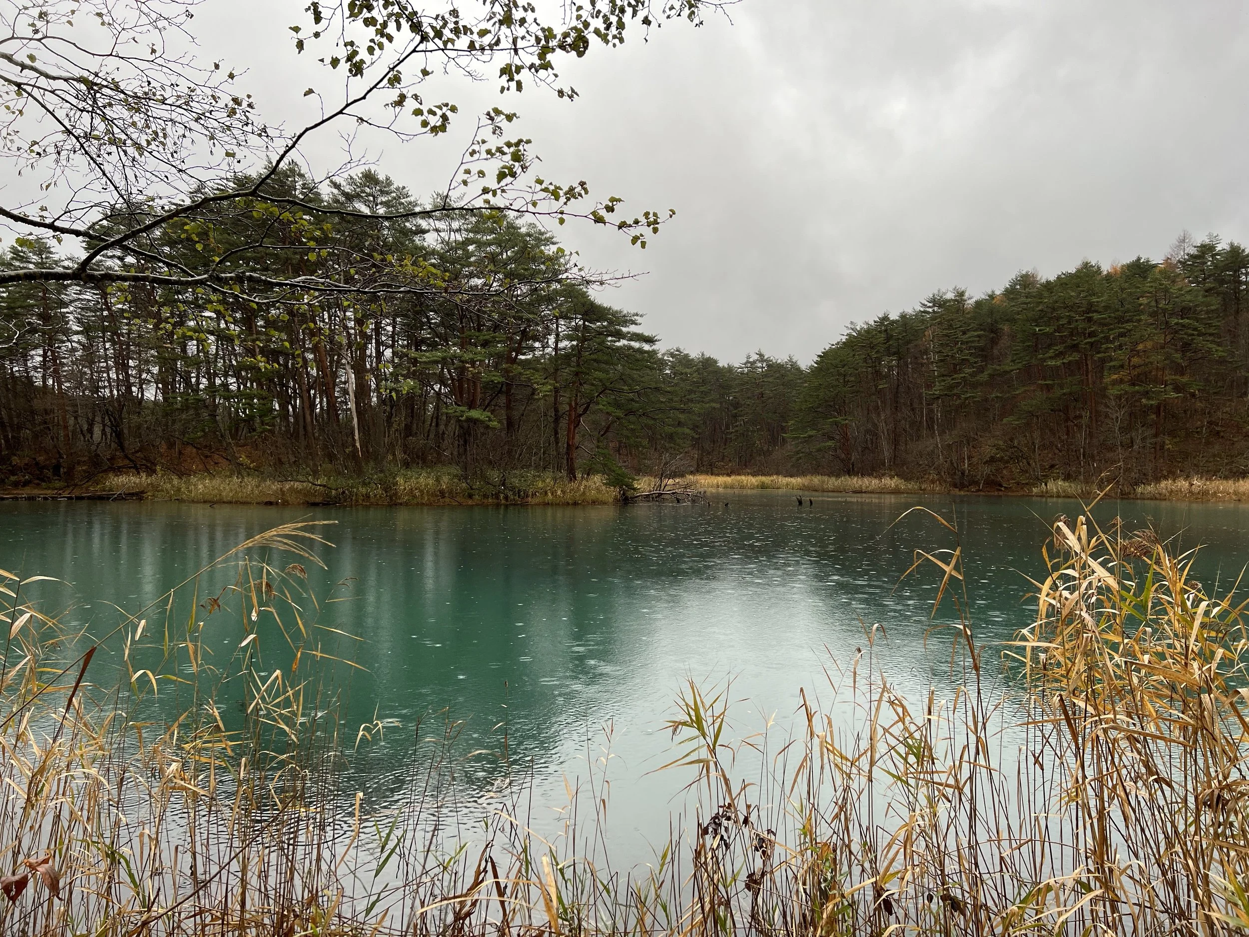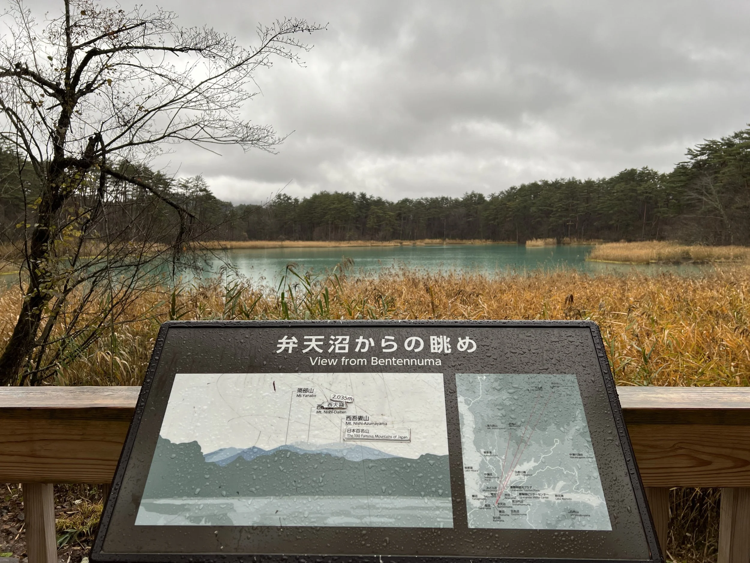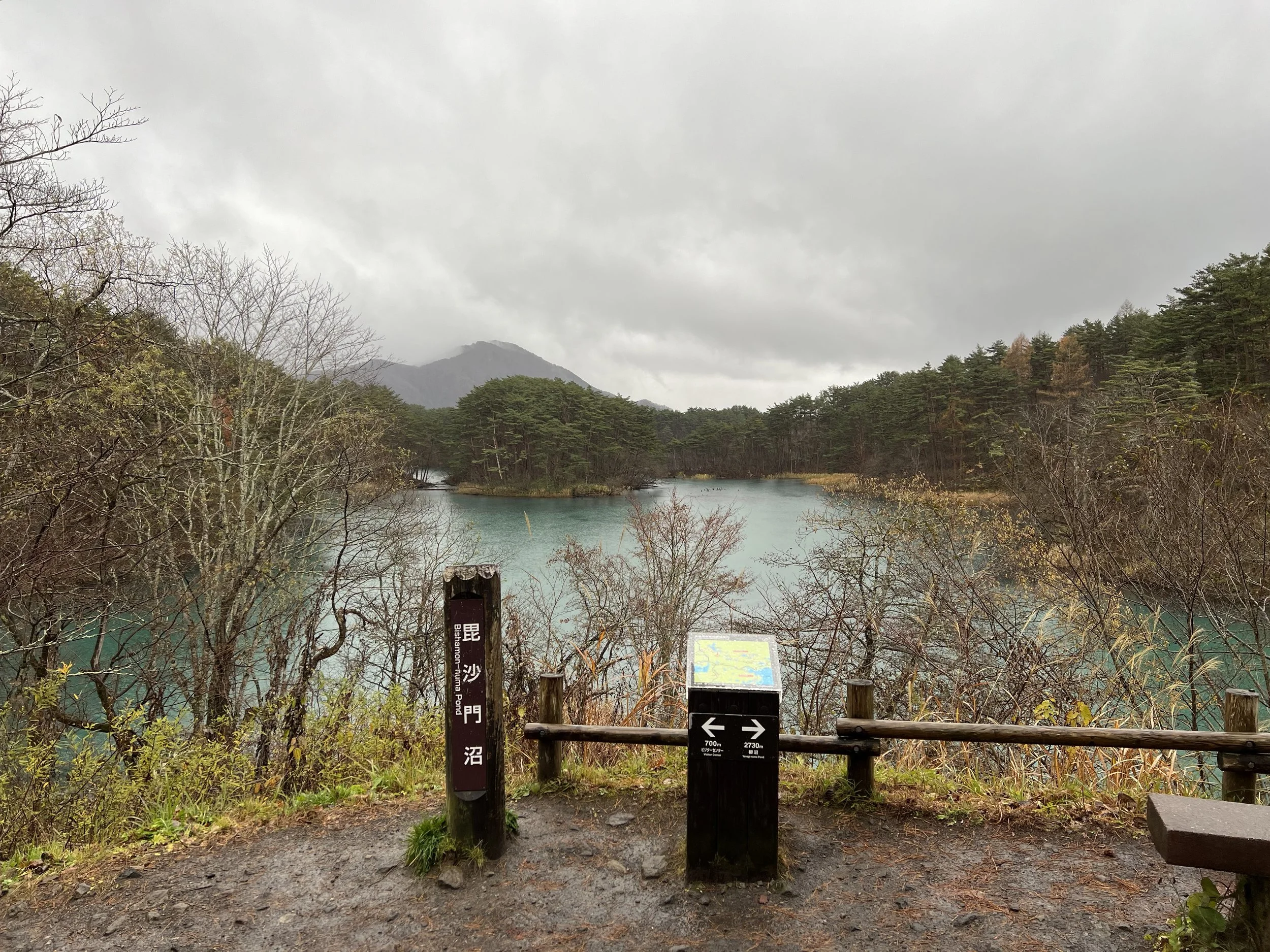 The trail is well maintained and immediately leads to Yanaginuma (Willow Pond). This pond is typically clear and transparent, sometimes appearing green, and during my visit it leaned distinctly toward green. From there, the path continues to Aonuma (Blue Pond), where the water appeared bright blue and remarkably clear. Further along is Bentennuma Pond, the second largest of the group. On clear days, this area offers views of Mount Nishi-Azuma and Mount Yanabe, but under grey skies, those views were completely obscured. The pond itself, however, displayed a beautiful turquoise hue that subtly shifted toward green as I walked around it.
