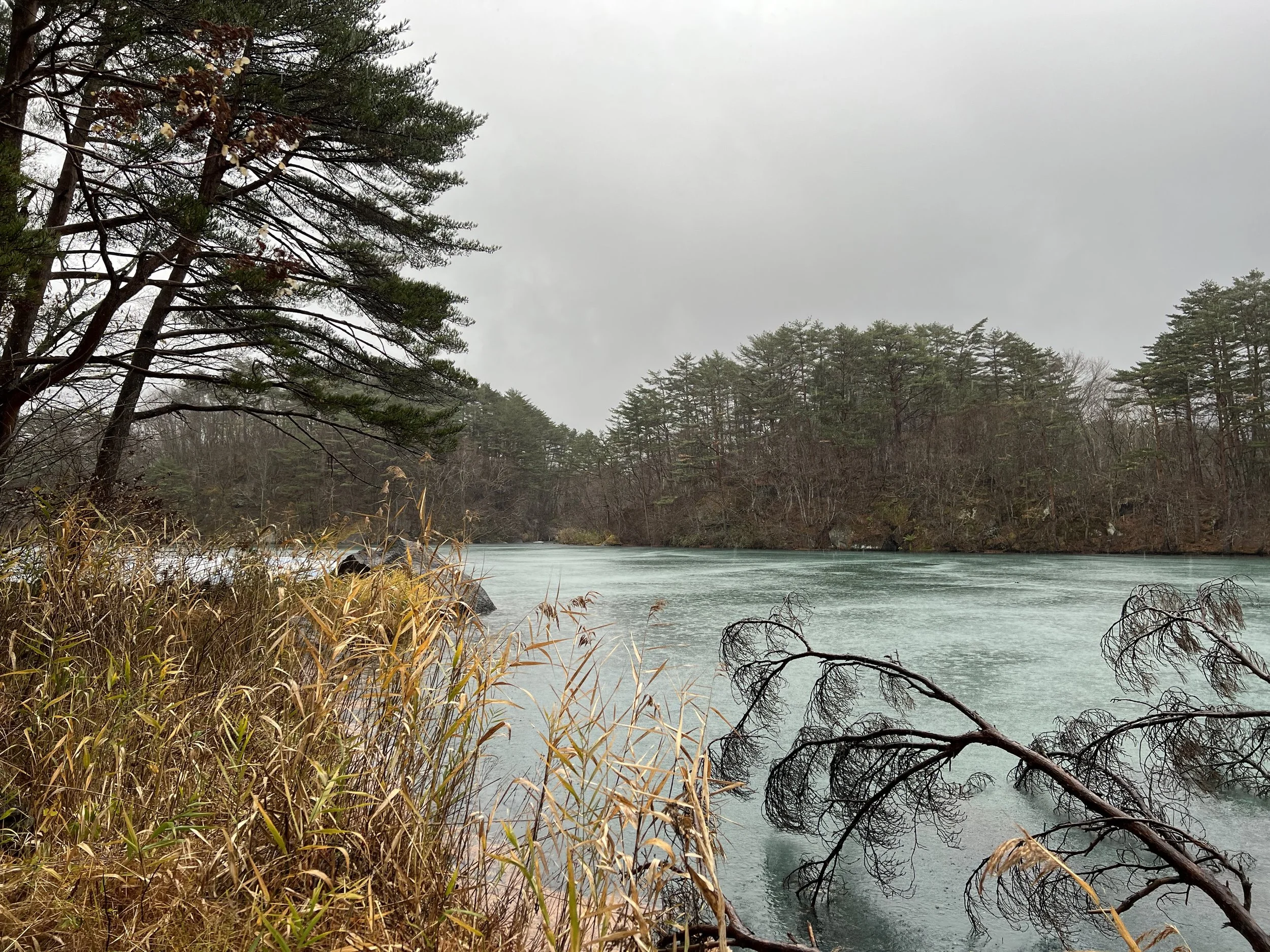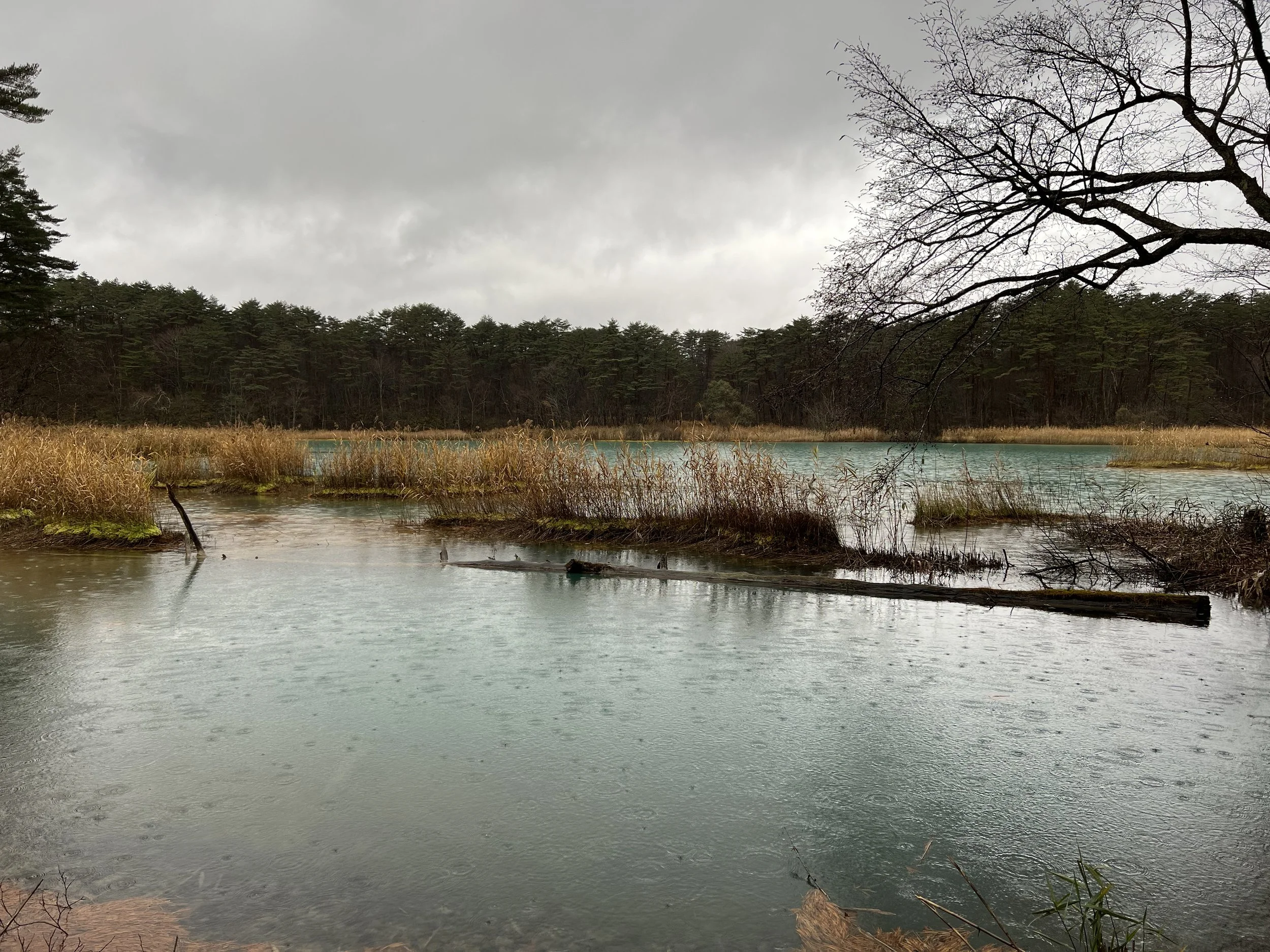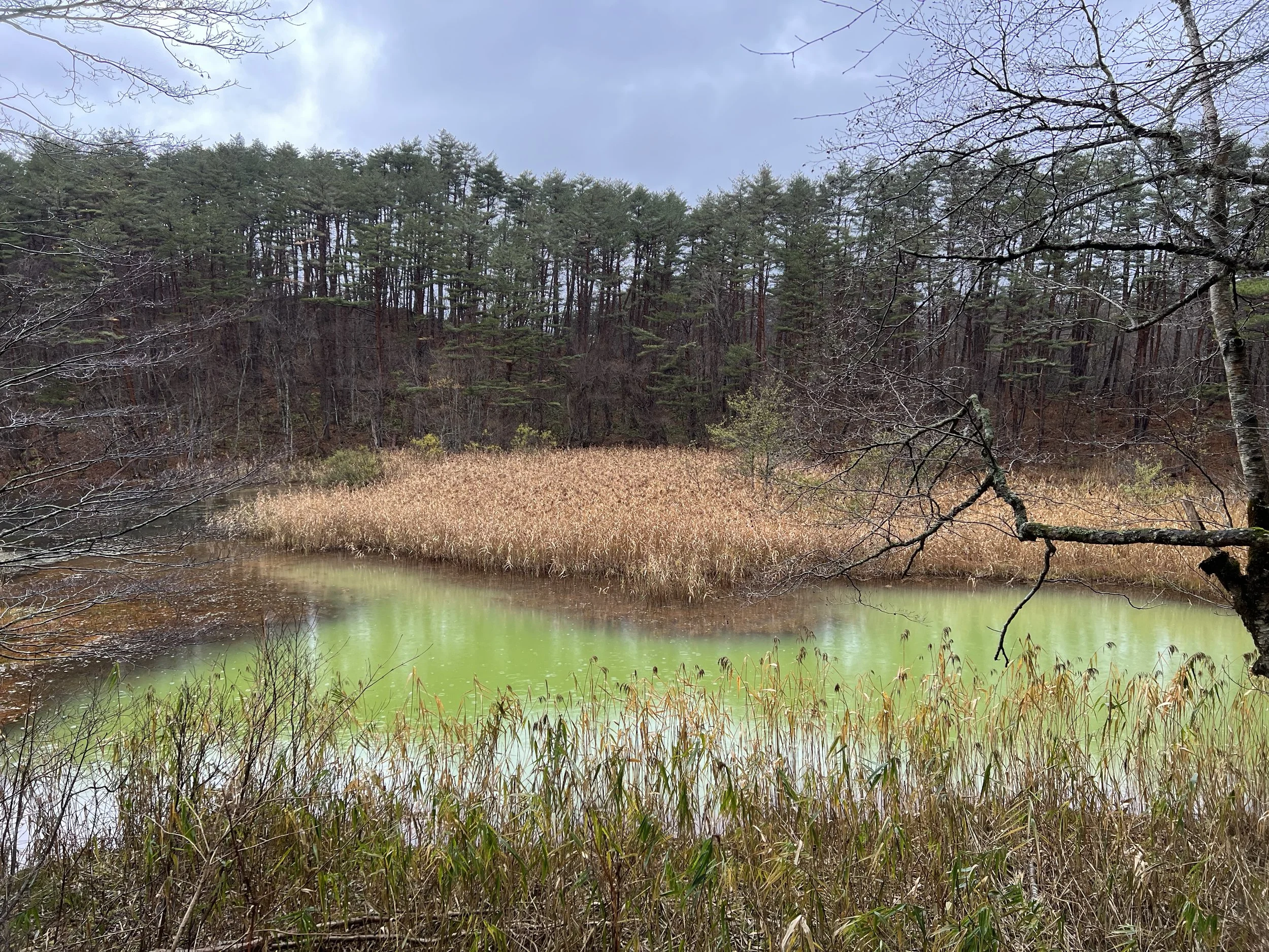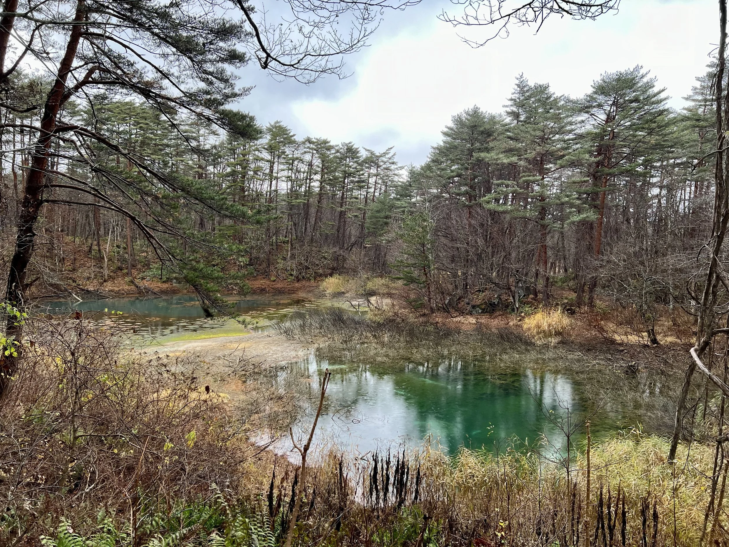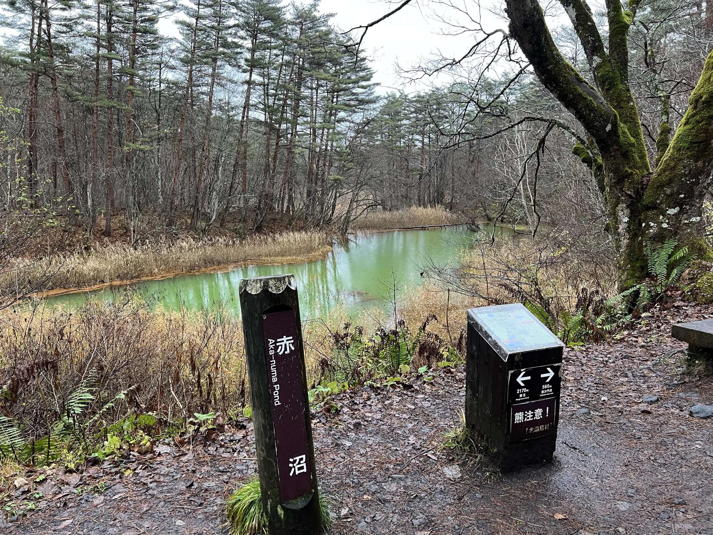 Continuing onward, I reached Tatsunuma (Dragon Pond), which is known for its vibrant green colour under ideal conditions. During my visit, the pond appeared darker and blended more into the surrounding vegetation. Nearby, Midoronuma (Deep Mud Pond) stood out with a striking emerald green, offering one of the most vivid colours in the area despite its smaller size. This pond is often contrasted with Akanuma (Red Pond), which—despite its name—is typically green or blue with occasional reddish tones. On this day, the two ponds appeared as slightly different shades of green, muting the usual contrast.