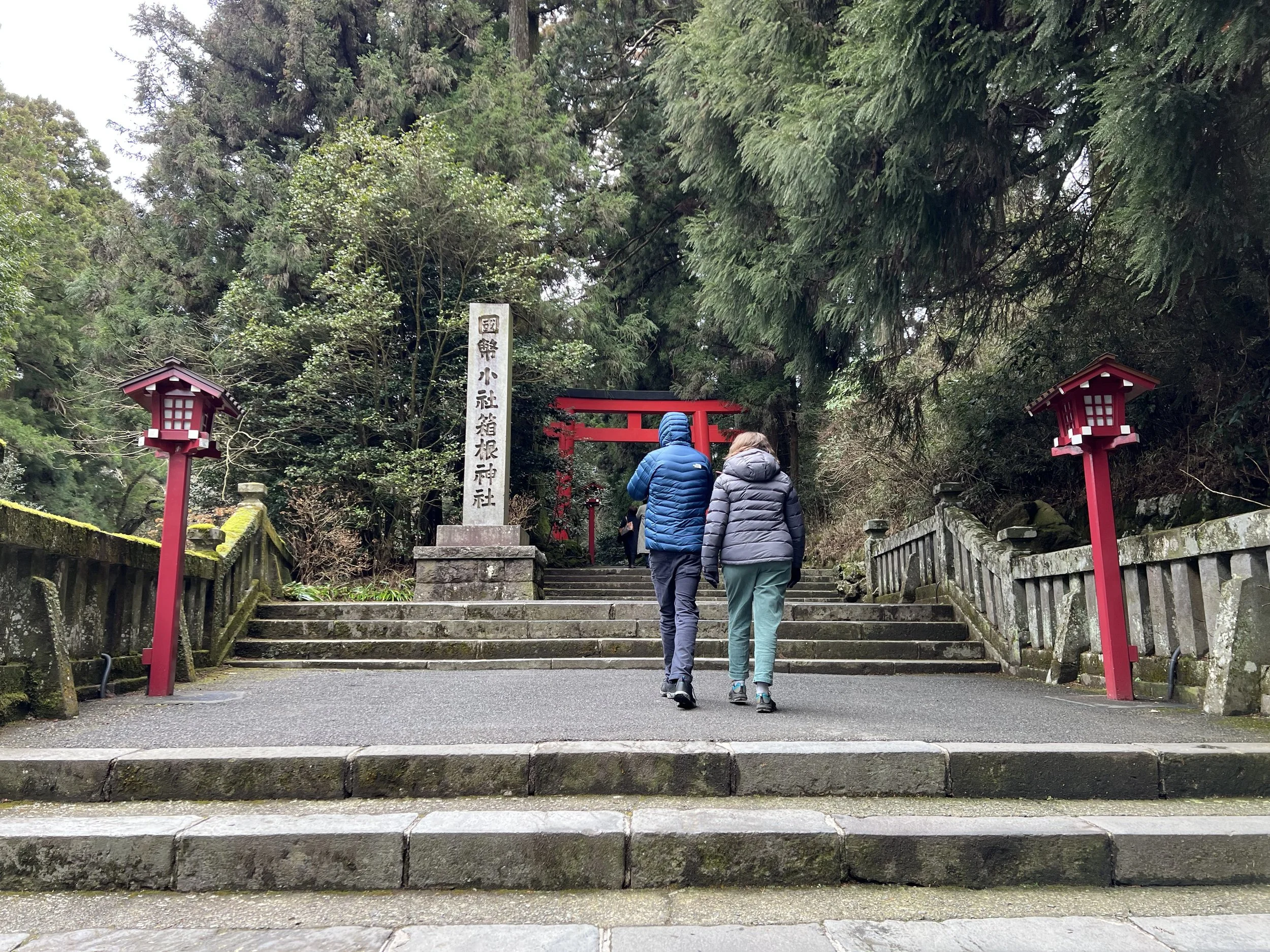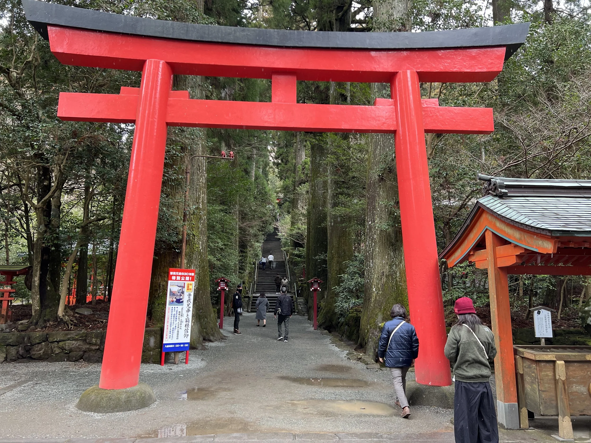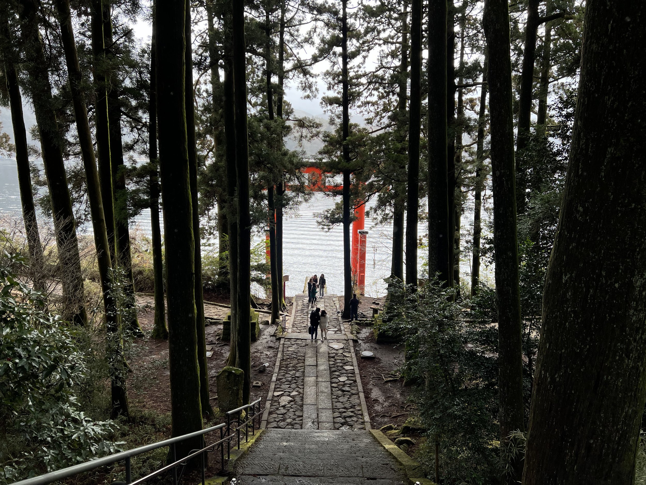 I arrived on foot after completing the Old Tokaido Cedar Avenue, following the trail down toward the lakeside. The entrance to the shrine is marked by a large vermillion torii gate, and stepping through it felt like crossing into a different space. The towering cedar trees closed in around the path, and the atmosphere shifted to quieter, cooler, and more grounded.