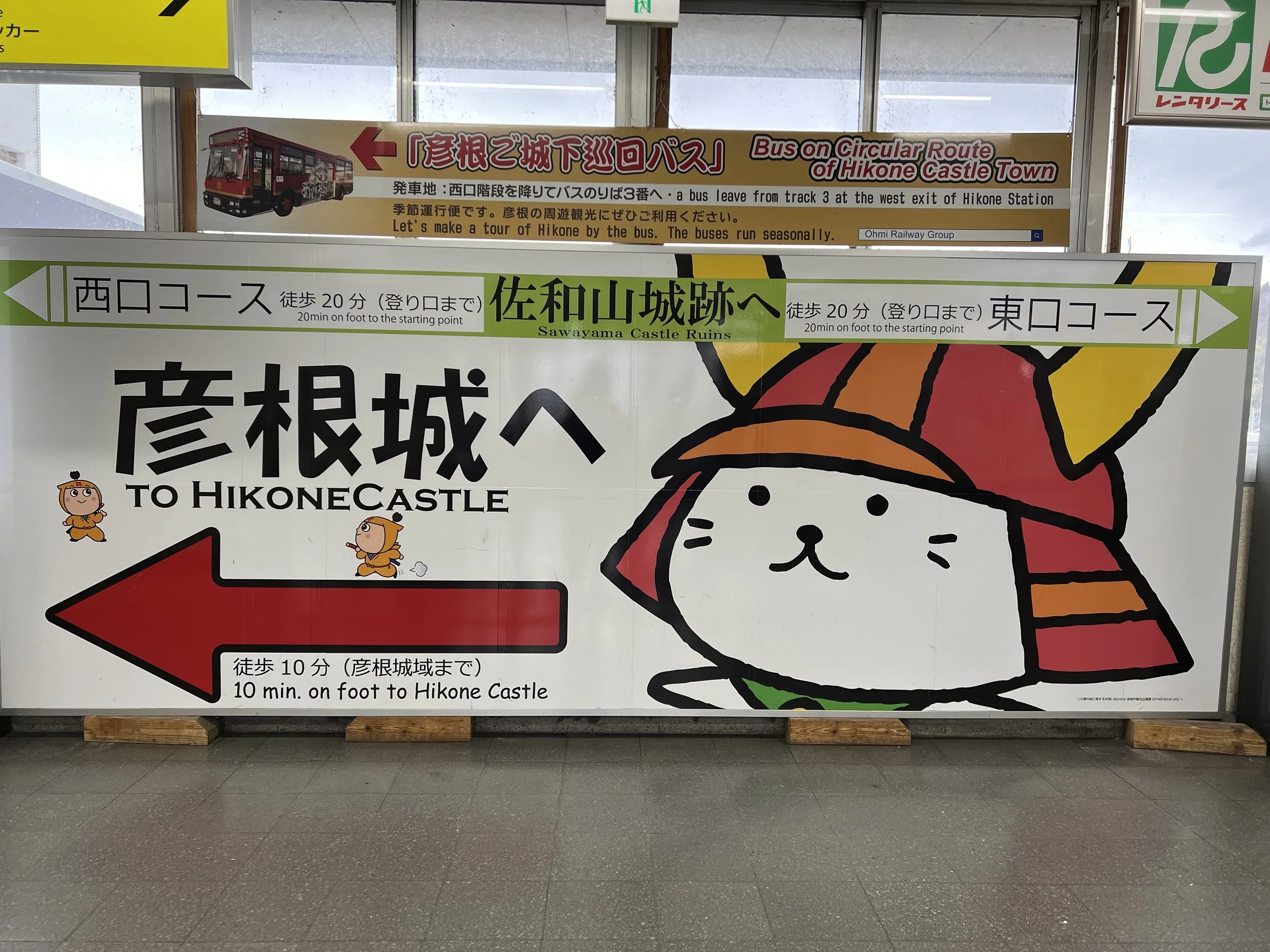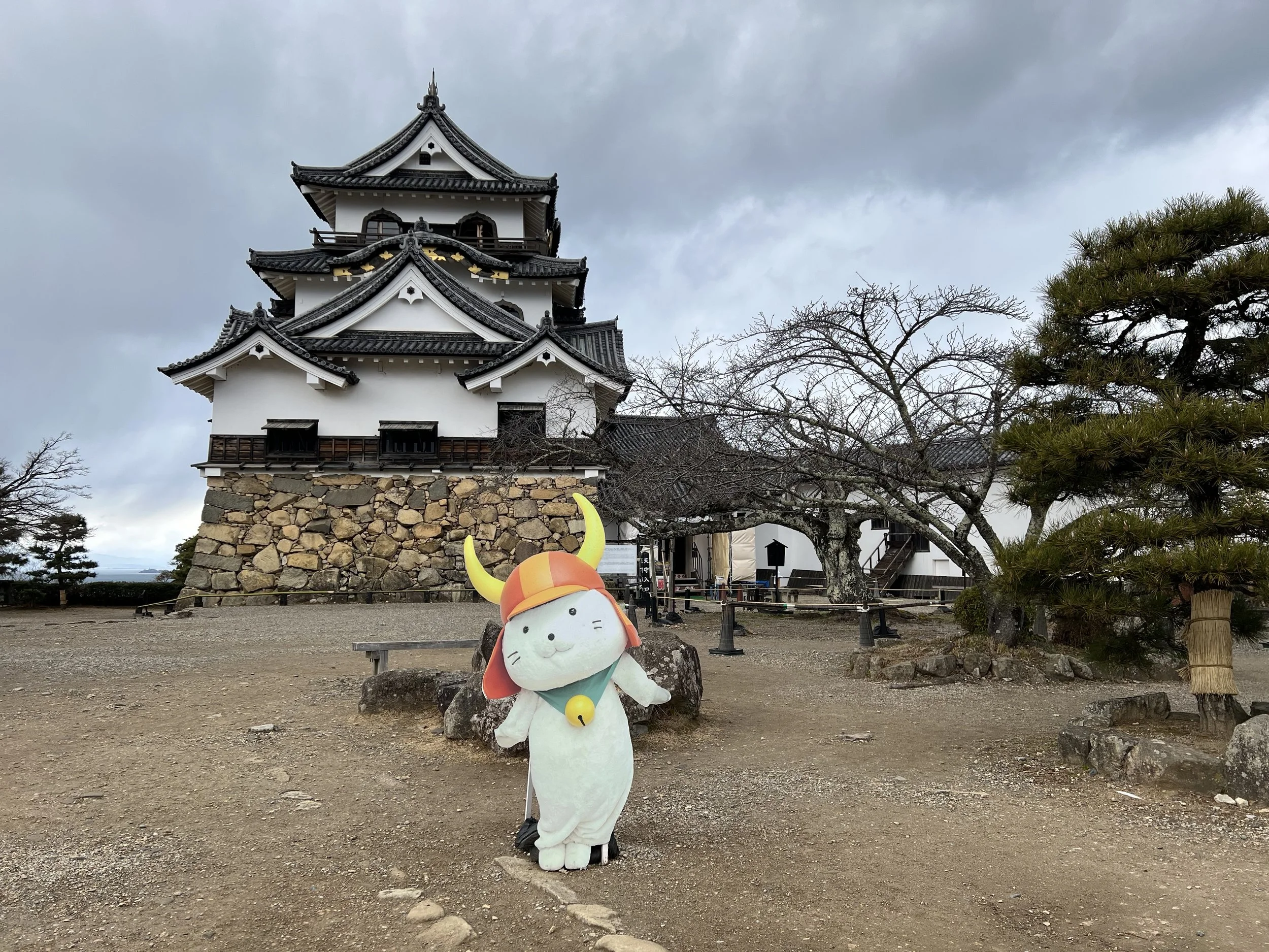 Just before reaching the castle, I crossed a defensive feature that immediately stood out: a curved ramp leading to a wooden bridge designed to be easily dismantled in the event of an attack. There weren’t many visitors, and the open space allowed the castle to dominate the landscape. Hikone’s beloved mascot, Hikonyan, also makes an appearance around the grounds, with photo spots set up for visitors.