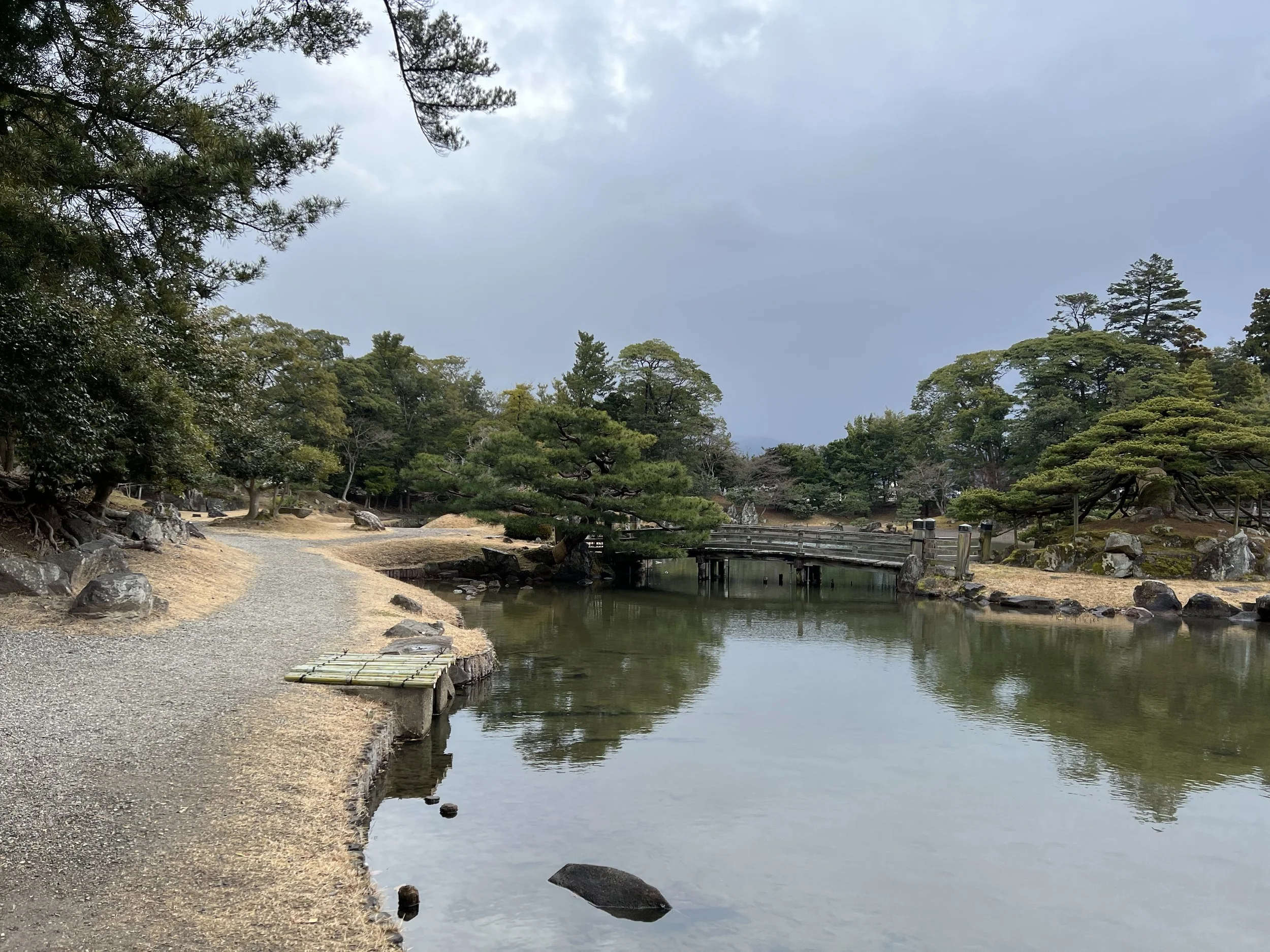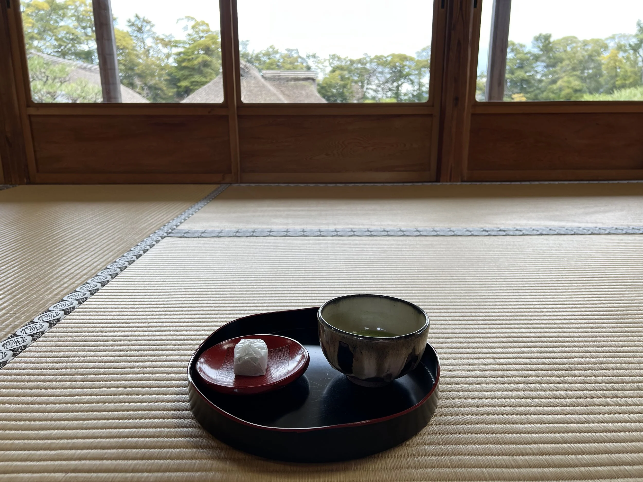 Once I finished exploring the keep, I wandered through the surrounding castle grounds and nearby park. Hikone Castle also offers yakatabune “houseboat” rides along the moat, though they weren’t operating during my visit. These boats are especially popular for seasonal outings and commemorative photos. I then stopped by a nearby teahouse, where I was shown into a tatami room and ordered a set of matcha and traditional sweets. Sitting quietly, looking out at the gardens, it was a perfect way to slow down after exploring the castle.