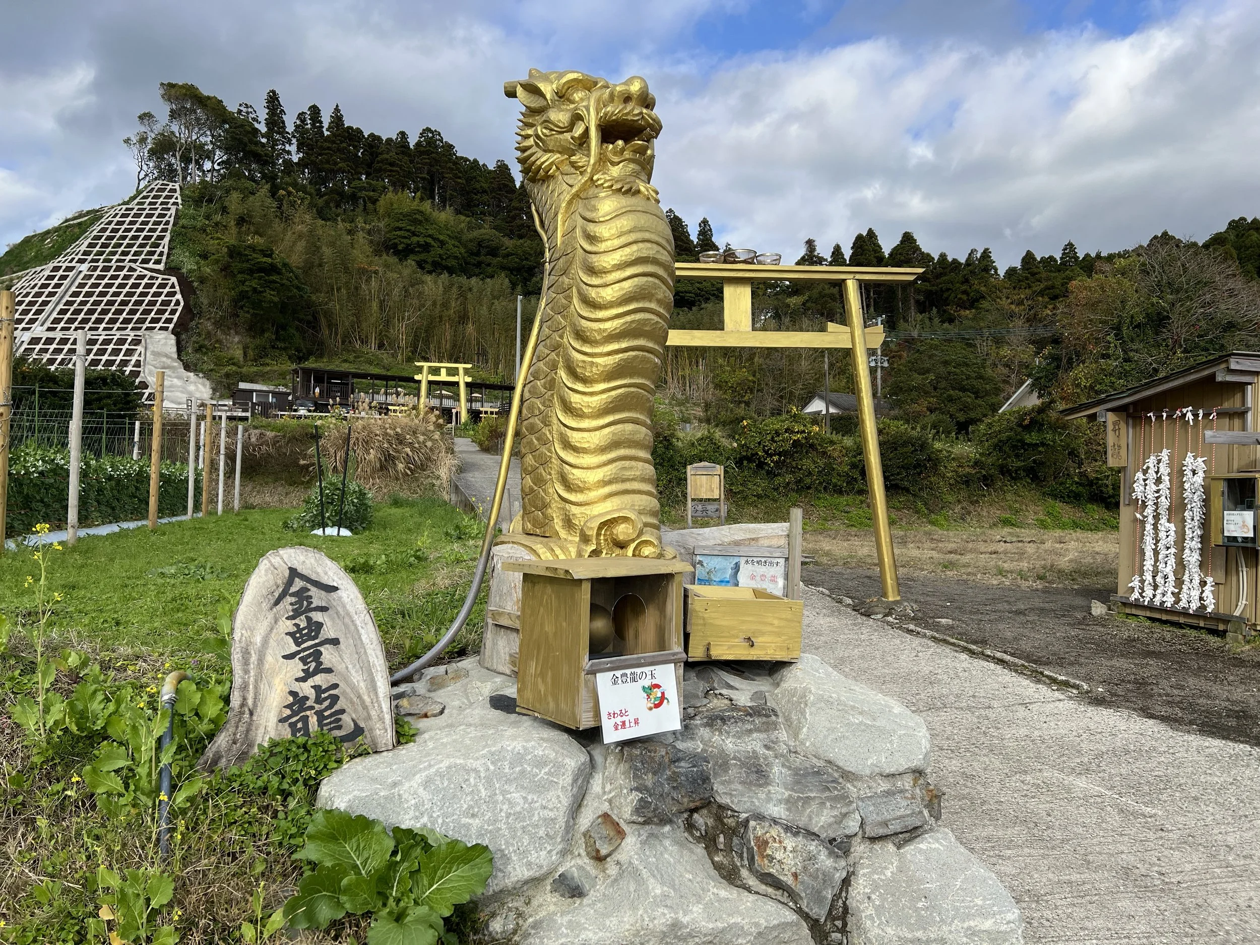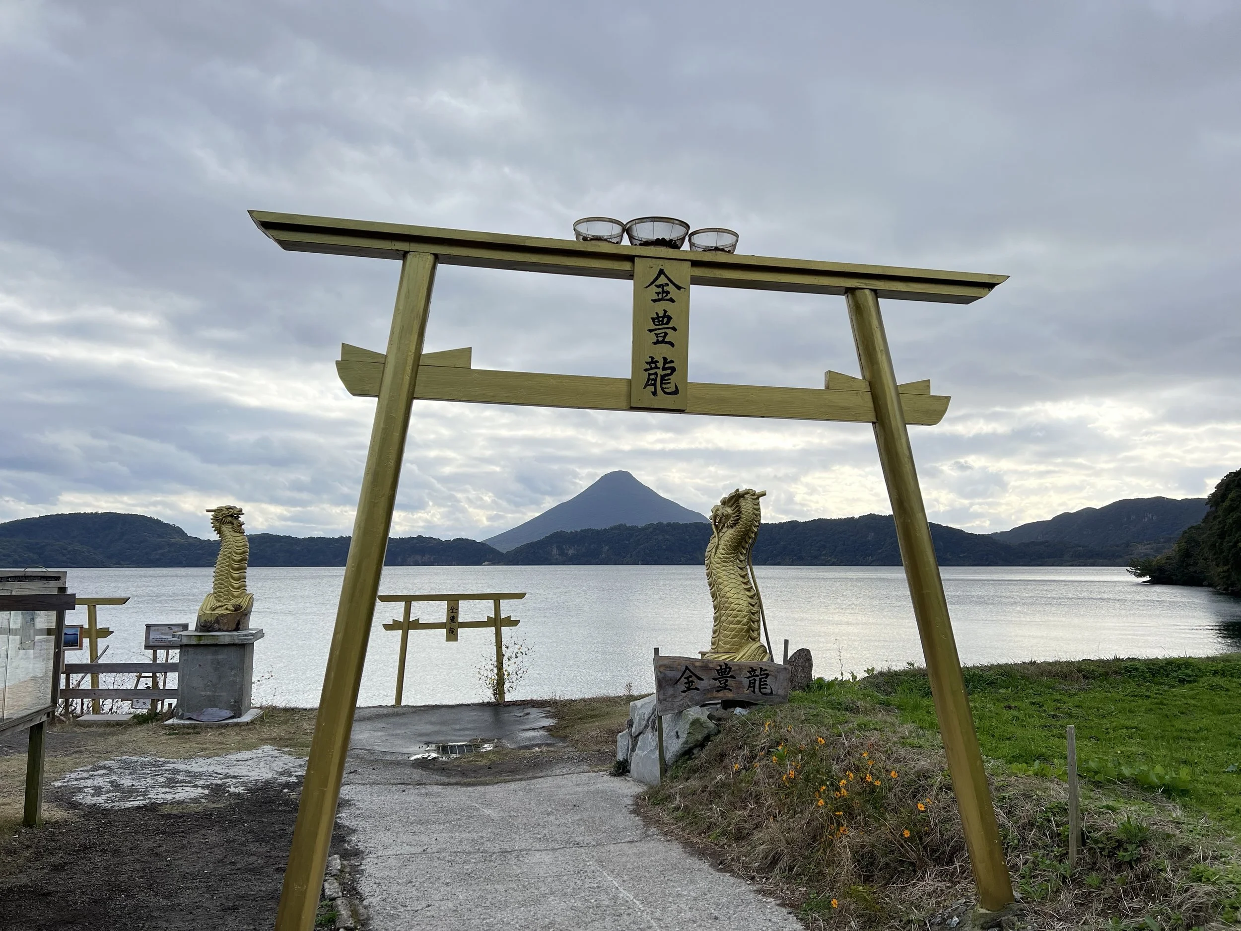 The Golden Torii (黄金の鳥居) near Lake Ikeda is a relatively modern installation that has gained popularity for its striking appearance and unique photo composition with Kaimondake in the distance. Unlike traditional vermillion torii gates seen across Japan, this one is painted gold and adorned with decorative golden dragons. It reflects a blend of Shinto symbolism and contemporary tourism appeal. While small in scale, it has become a recognizable roadside stop for visitors exploring the Ibusuki area.