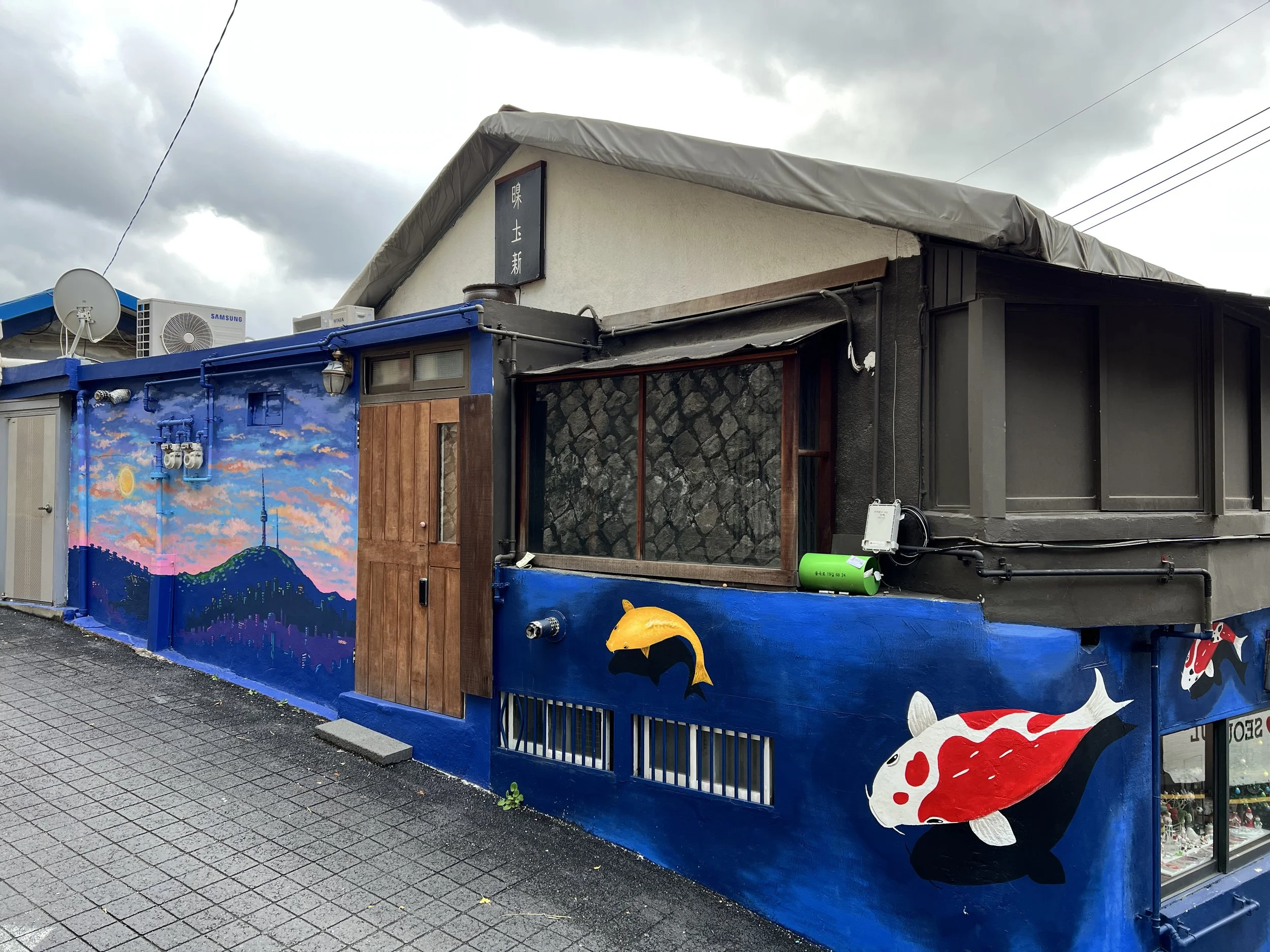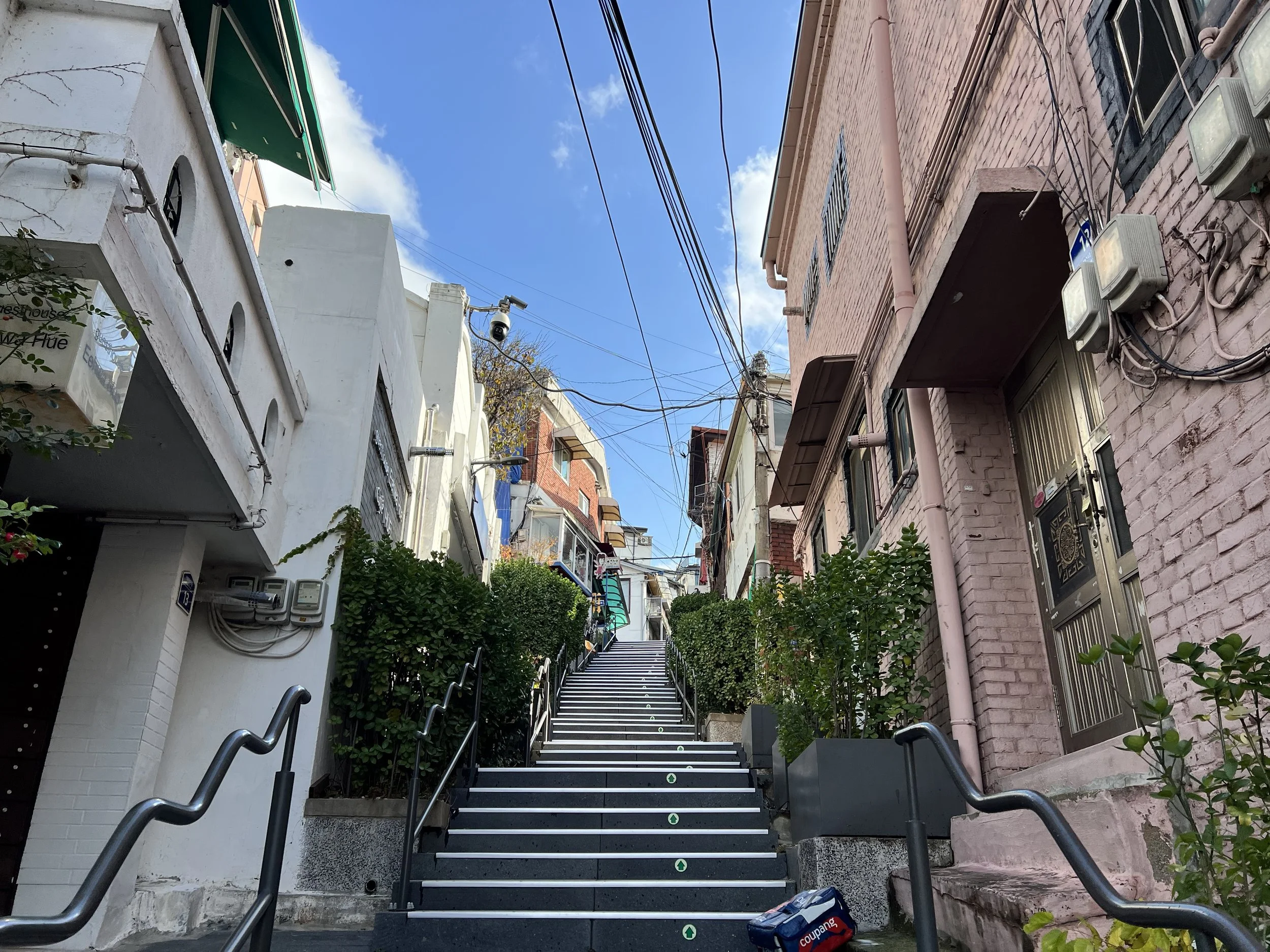 The narrow pathways were lined with bright, playful artworks. I stopped frequently to admire and photograph the mosaic-tiled staircases, painted walls, and quirky sculptures that seemed to pop up at every turn. Between the art-filled alleys, there were cozy cafés, small artisan shops, and viewpoints that opened up to panoramic views of Seoul. Despite the clouds, the atmosphere was lively and creative—a perfect mix of art and everyday life.