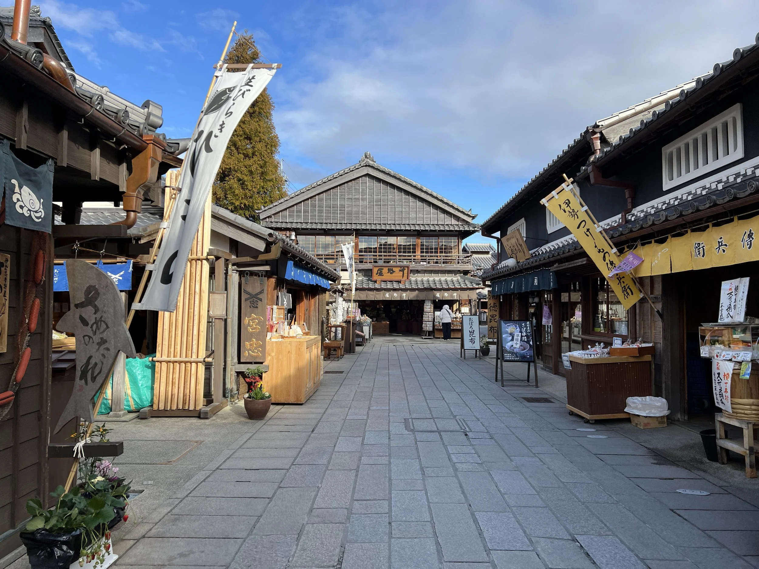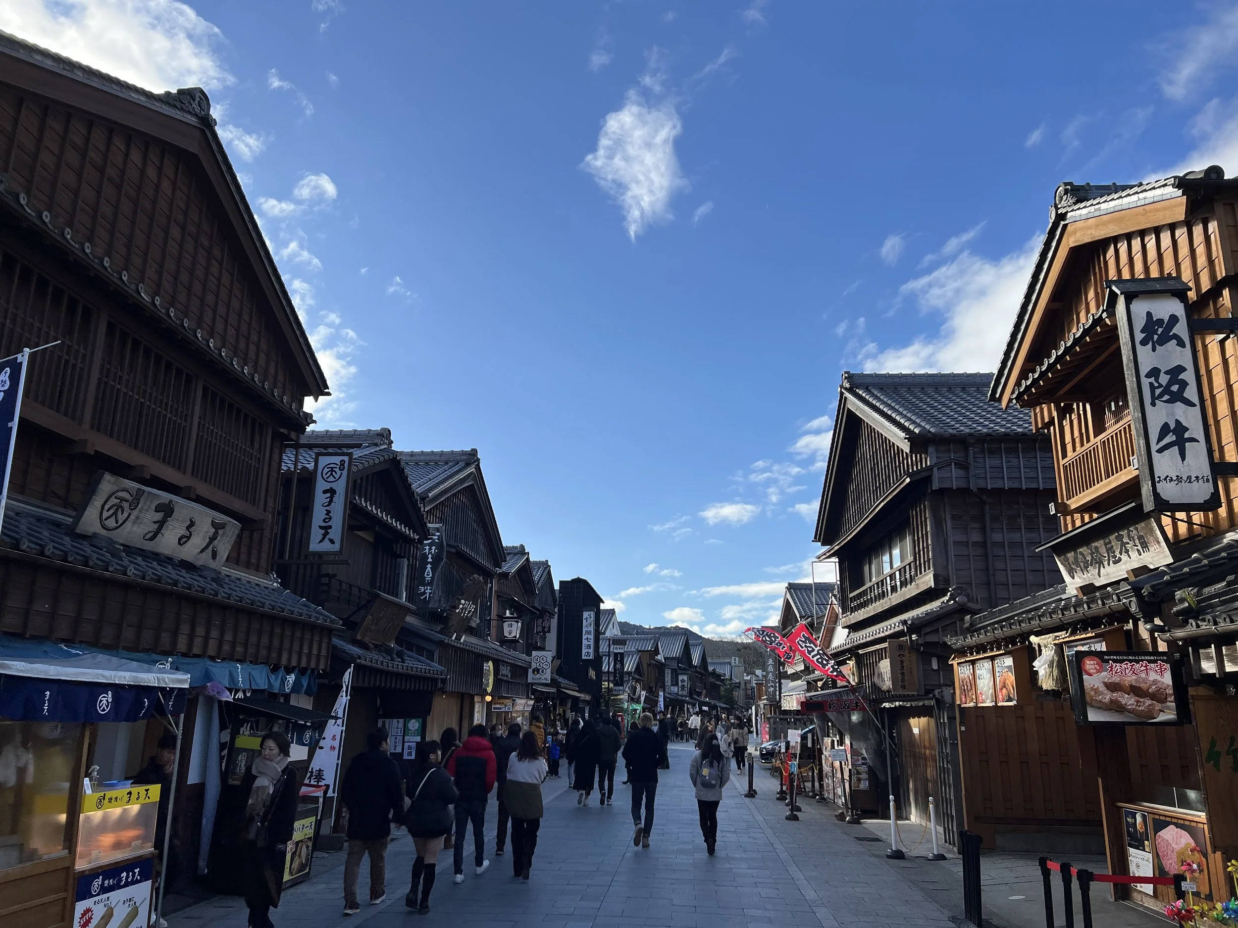 This street feels like a step back in time. Traditional-style buildings line both sides, many housing shops and restaurants that have served pilgrims for generations. It’s lively, but in a way that complements the shrine experience rather than distracting from it. About halfway through, I reached Okage Yokocho, a small area designed to recreate the townscape of the Edo to early Meiji period. There were benches scattered throughout, people sitting, eating, and relaxing. I picked up a simple skewer and found a spot to sit, taking in the atmosphere.