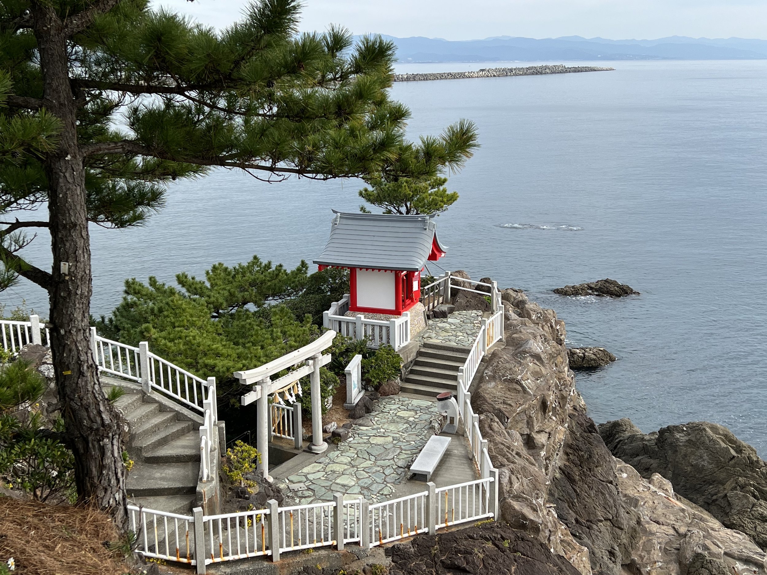 Watatsumi Shrine sits on a hill overlooking the Pacific Ocean and is dedicated to the sea deity Watatsumi, often depicted as a dragon god who governs the ocean and tides. With red shrine buildings framed by pine trees and set against the deep blue of the ocean, the contrast of colours is especially striking. From the shrine, I continued along the trail toward Kochi Lighthouse. Although the lighthouse itself is not open to visitors, it’s possible to get close enough to see it clearly.