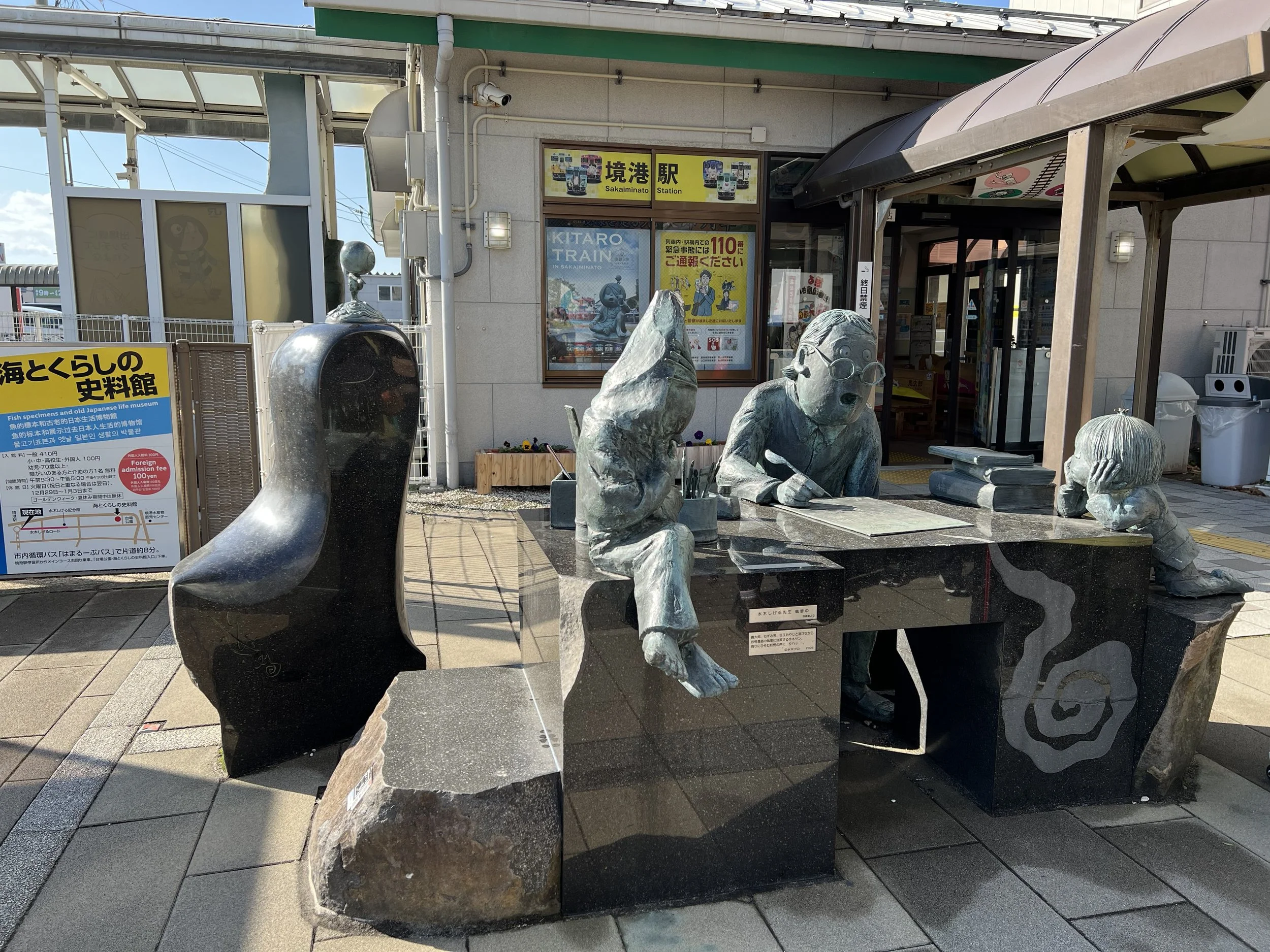 Sakaiminato is home to Mizuki Shigeru Road, a street lined with more than 170 bronze statues of characters from GeGeGe no Kitaro. Visiting this area was my main goal for the day, so stumbling upon the Kitaro Train felt oddly perfect. Once the train departed, I noticed that every station along the line is also yokai-themed, each one featuring its own unique character. The roughly 50-minute ride passed quickly as I looked forward to each stop and listened to the themed announcements along the way.