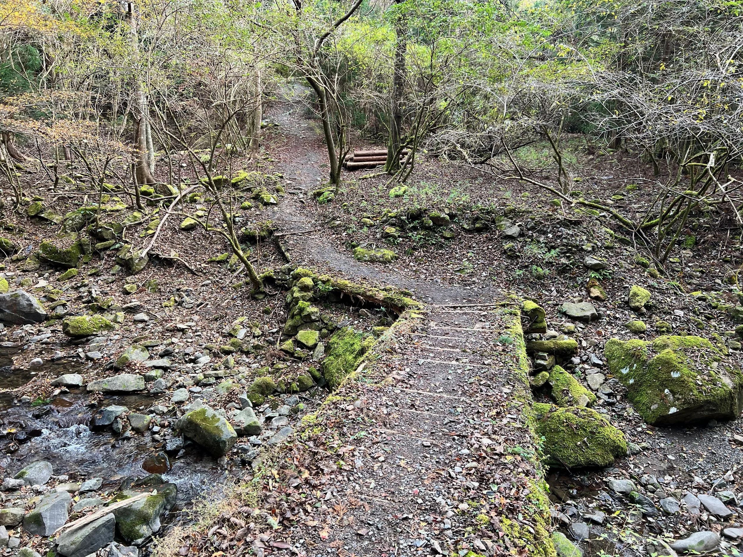The trail started beautifully, with fall-coloured trees lining the path—I took more photos than I care to admit. After some mountain road walking, I reached the detour, which began with a steep climb. I took it one step at a time—it was tough on the legs. After that, I arrived at Mikoshi-toge Pass and took a short break before descending. Signs warned of the steep descent, and I was grateful for my hiking pole.