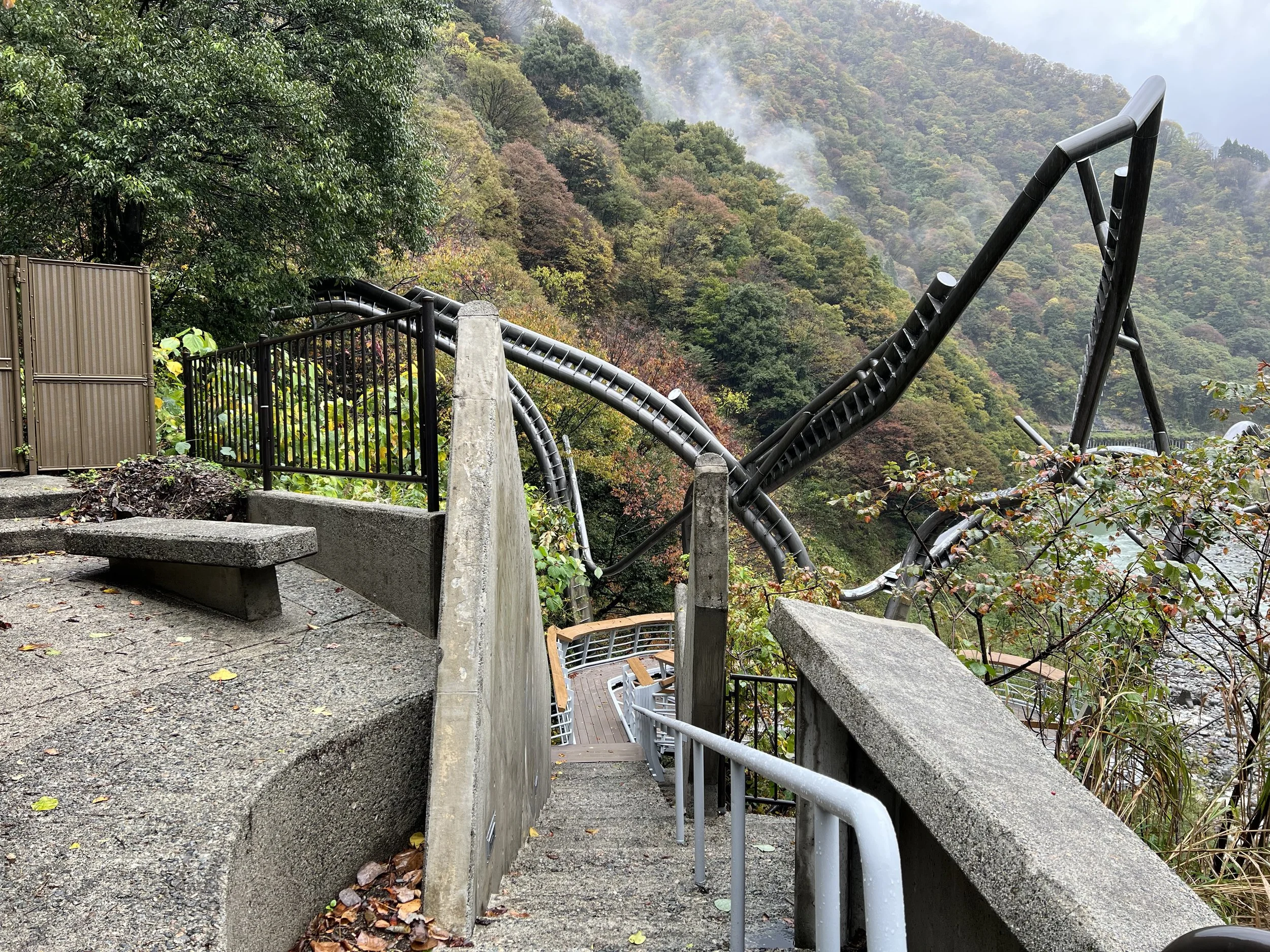 With nothing else to do and no certainty about the trains, I decided to make the most of the morning by revisiting Omokage Observatory—a stop I had skipped the day before thanks to a surprise encounter with Japanese macaques. This time, the monkeys were nowhere to be found, and I finally had the chance to take in the observatory itself. The structure was designed to resemble the flight path of a bird looking down over the gorge. I tried to see the vision behind it, but if I’m being honest, it didn’t quite register as a bird’s path to me. Still, the view was worth the visit.