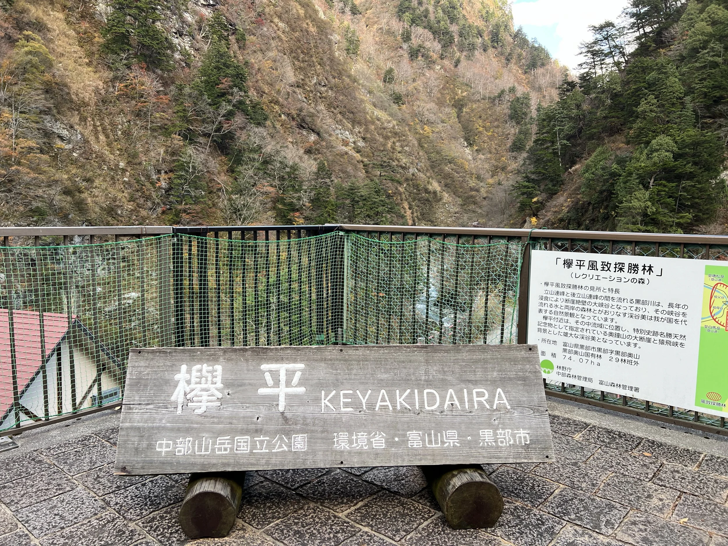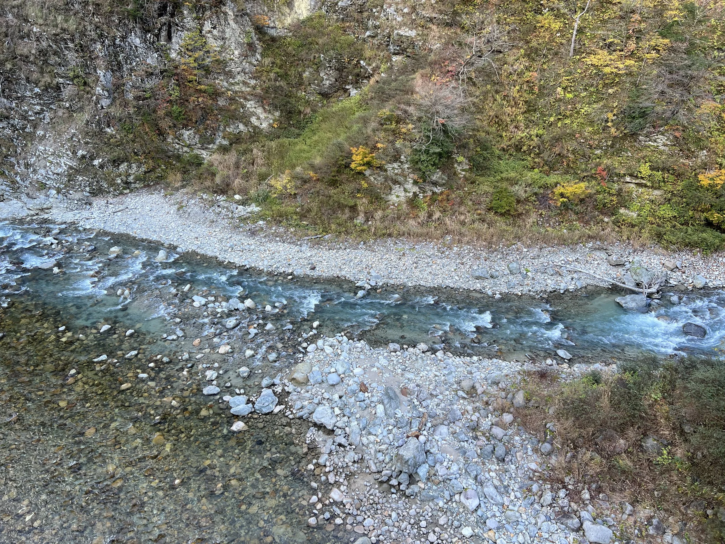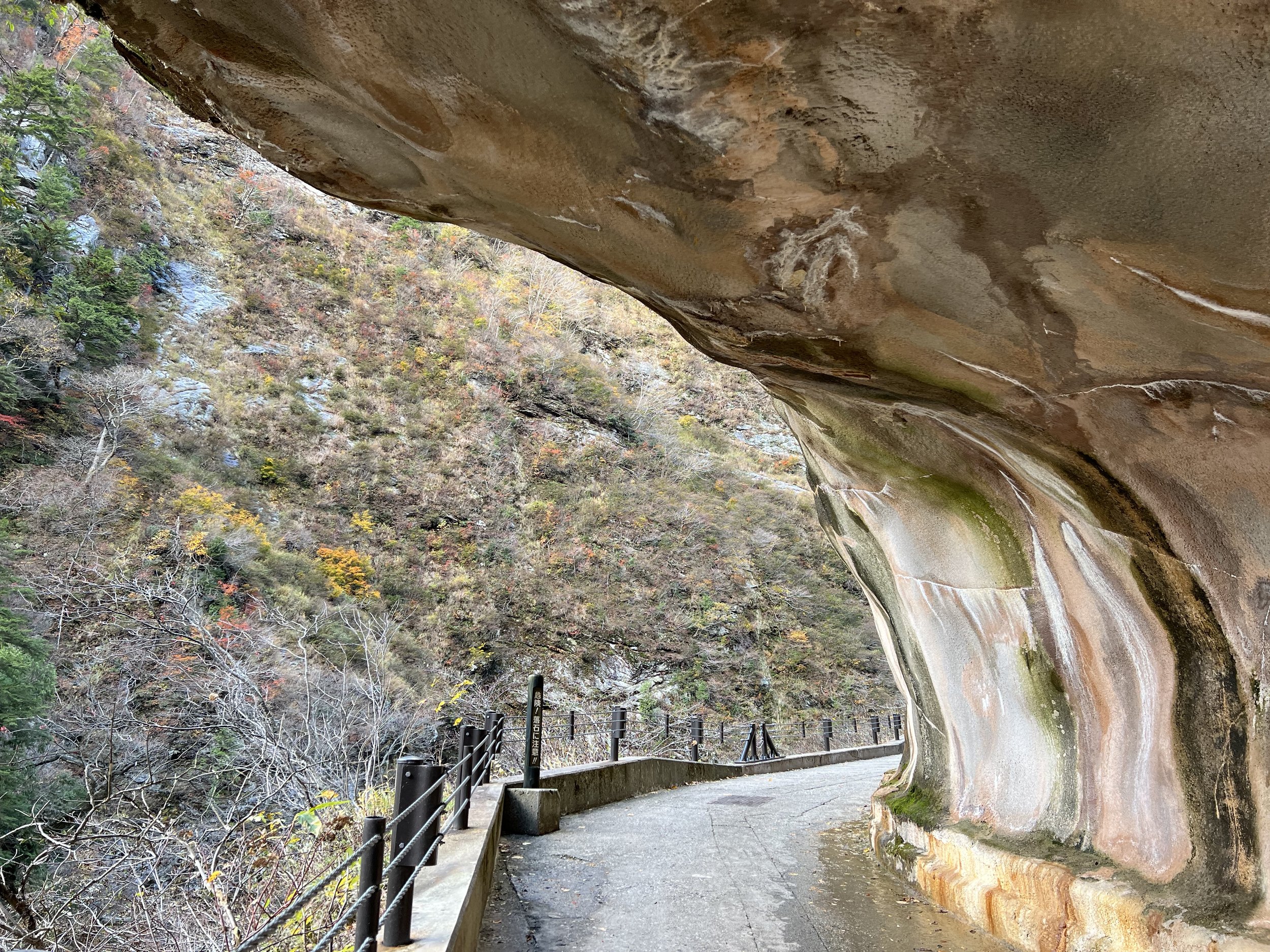 When we arrived at Keyakidaira, most passengers disembarked—and it was easy to see why. This area is one of the highlights of the entire route. Beyond the scenery, it’s also home to a gorge-side onsen with incredible views. I would have loved to experience it, but with limited time, I chose to explore the trails instead. I made my way to Okukane Bridge, a striking pedestrian bridge spanning the Kurobe River, offering sweeping views of the gorge below. From there, I continued onto a path known as Hitokui Iwa—literally translating to “people-eating rock.” The name makes sense once you see it: the trail is carved directly into a steep cliff, curving overhead in a way that makes it feel like the mountain itself is swallowing the path.