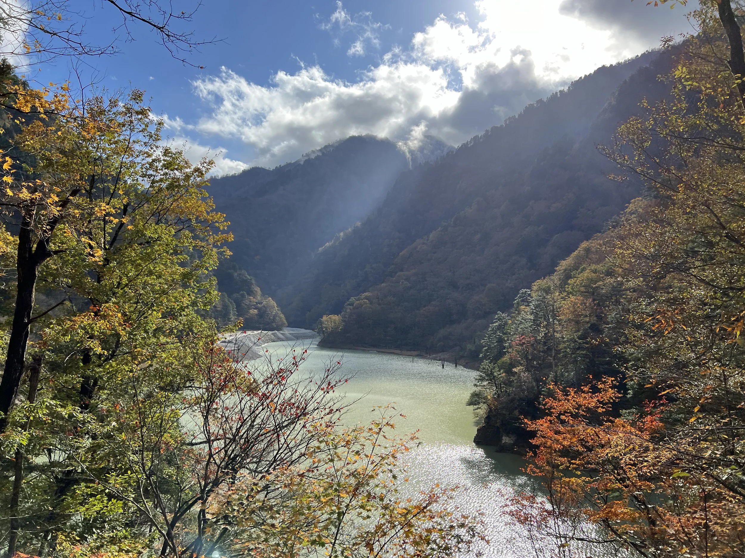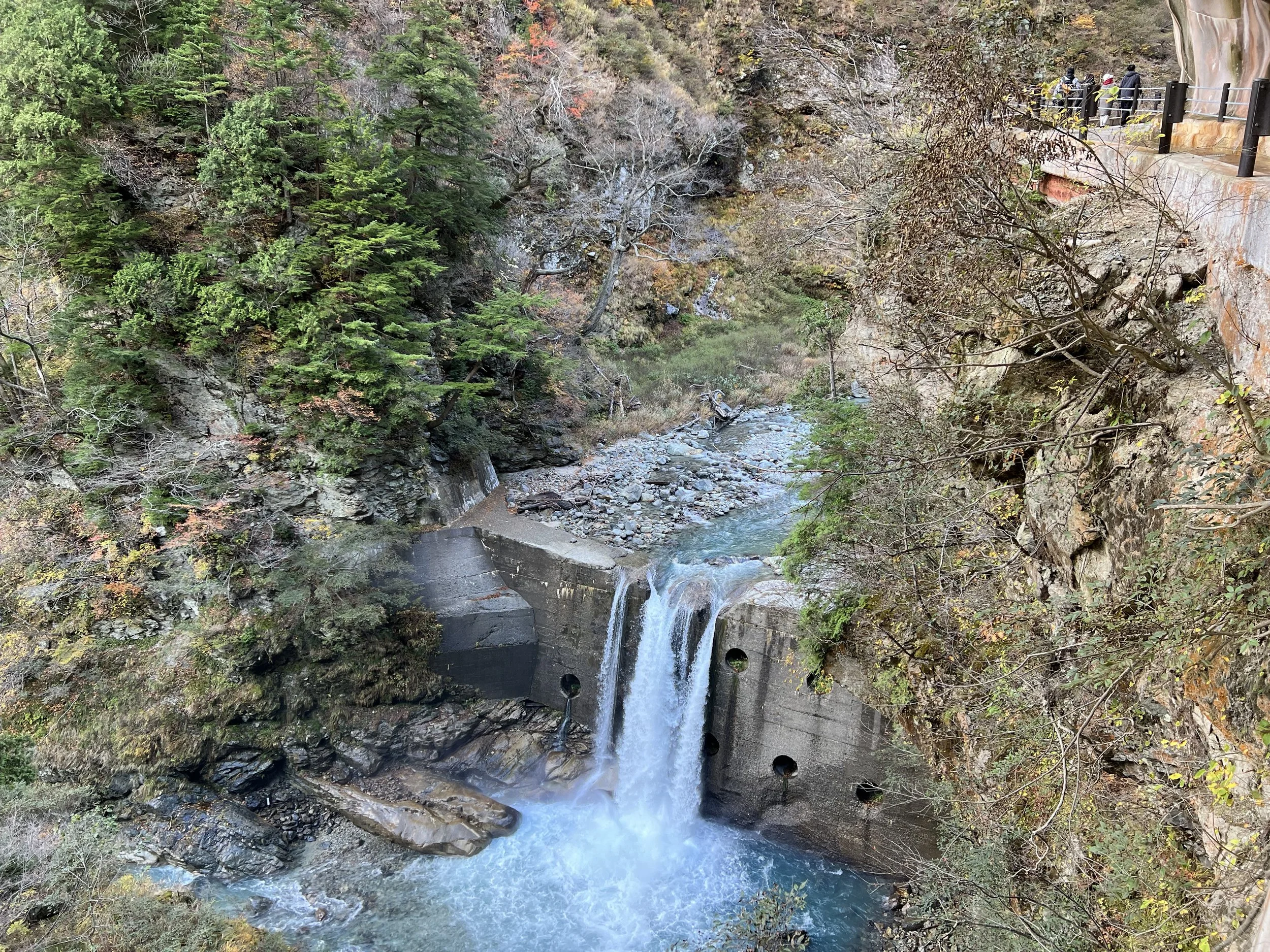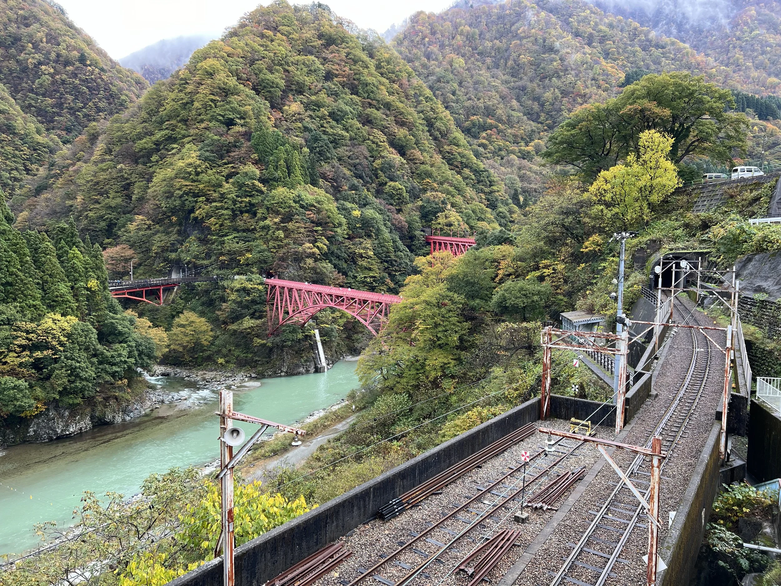 Boarding the train felt like a victory in itself. Although seats aren’t assigned within each car, I managed to grab a spot on the right side—arguably the best side for views. As the train departed, it followed the winding river, passing through forested valleys, narrow tunnels, and across dramatic bridges. We rolled past the Unazuki Dam that I had walked to the day before, and deeper into the gorge. Every turn revealed another stunning view.
