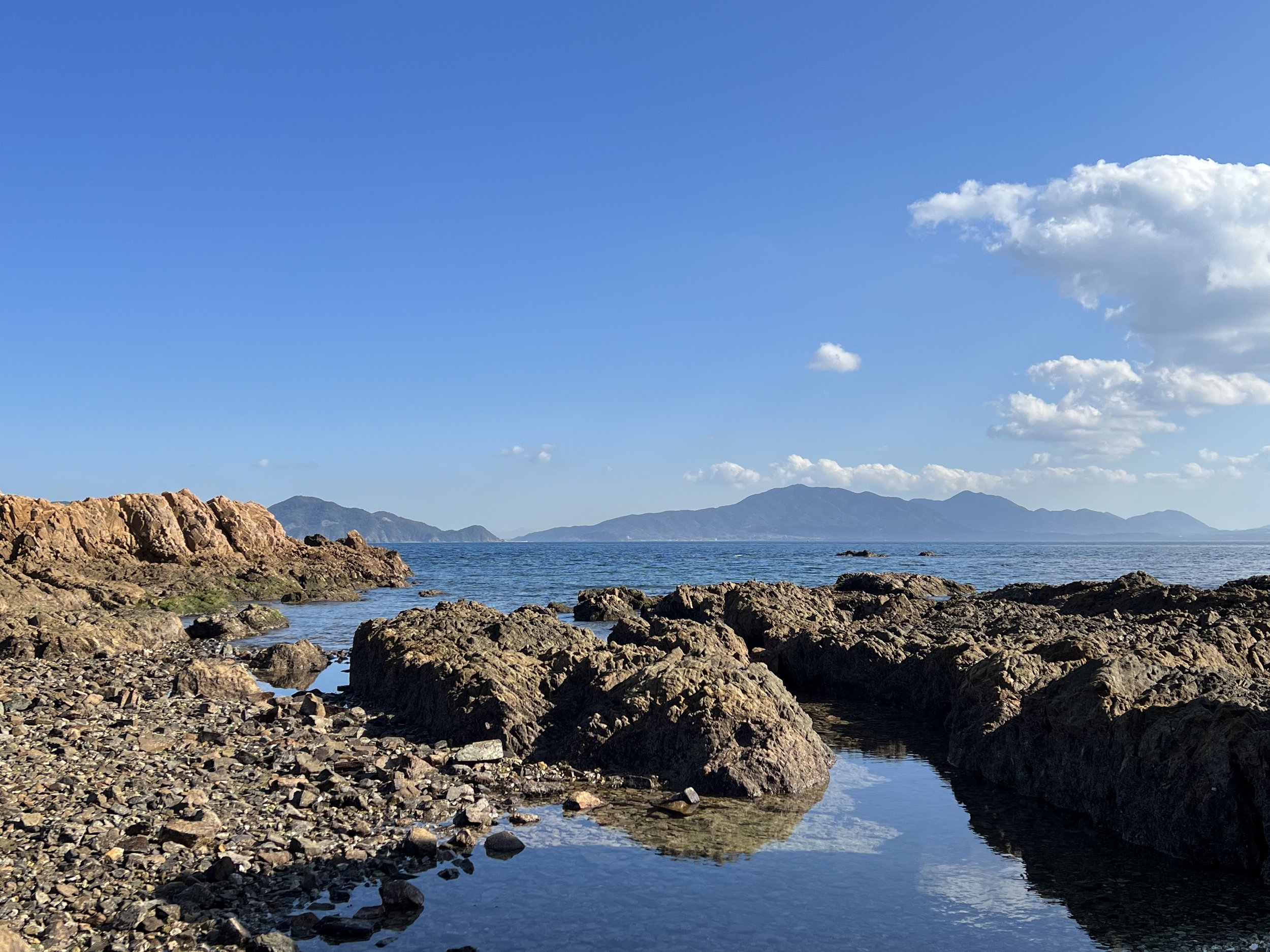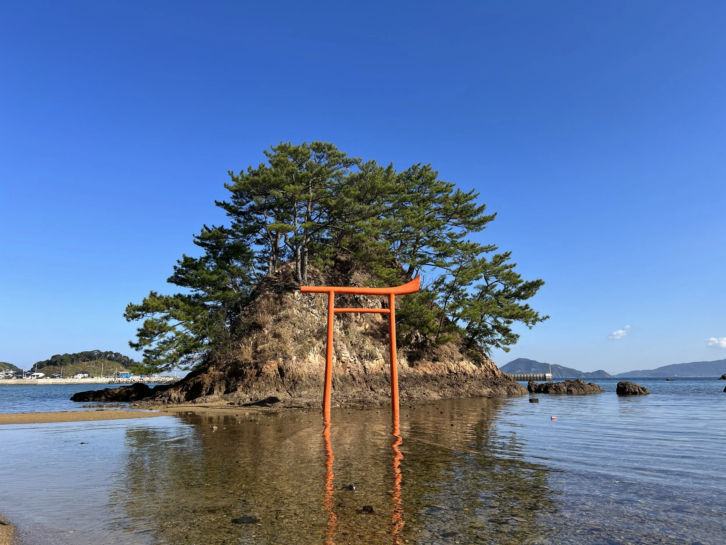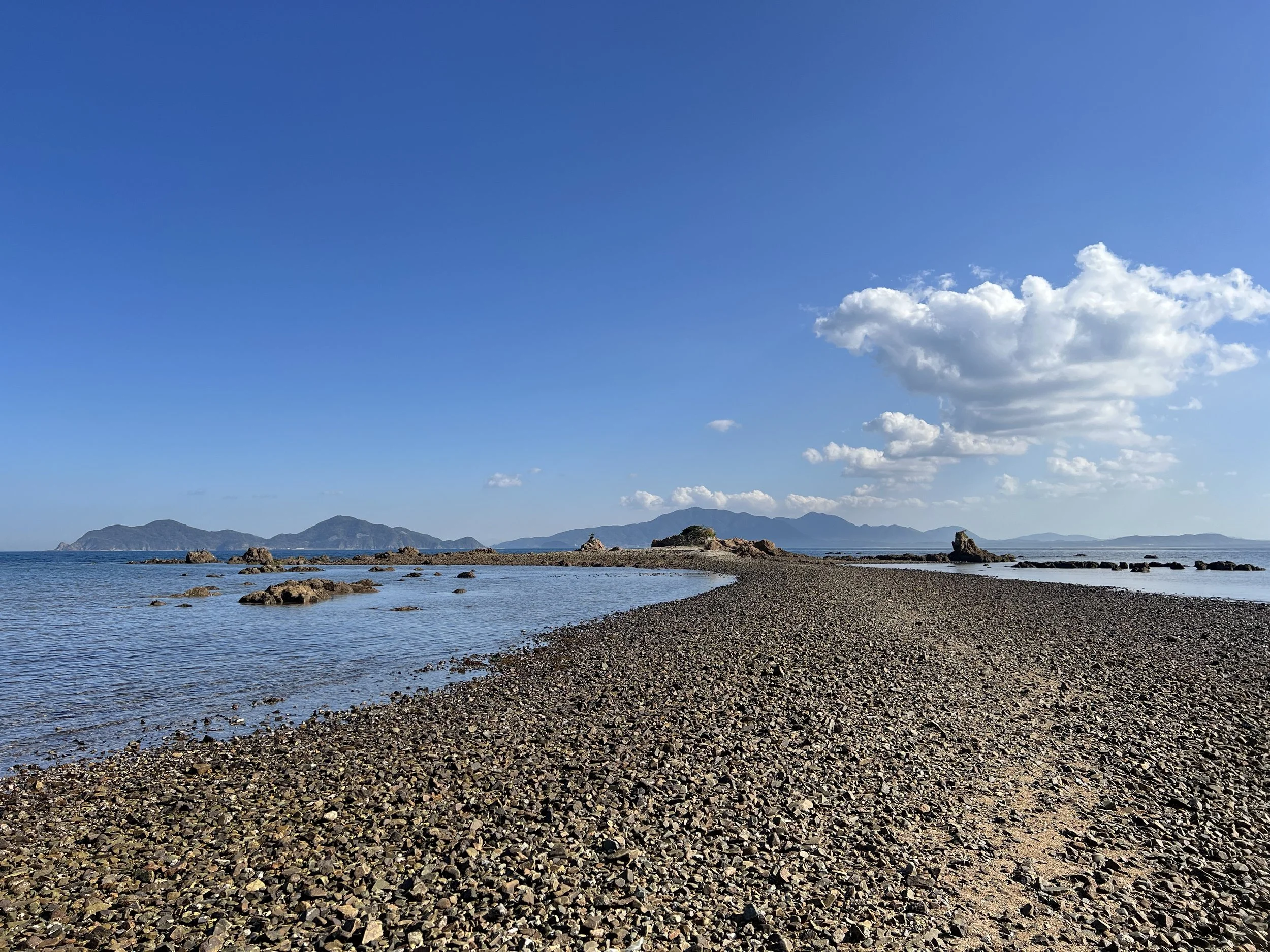 From there, I made my way back toward town. One final stop on the island was Kansu Bathing Beach, a popular summer destination. At low tide, it is possible to walk across the shallow water to a small offshore islet with a modest shrine. I was fortunate enough to arrive during low tide and walked all the way out to explore the area.