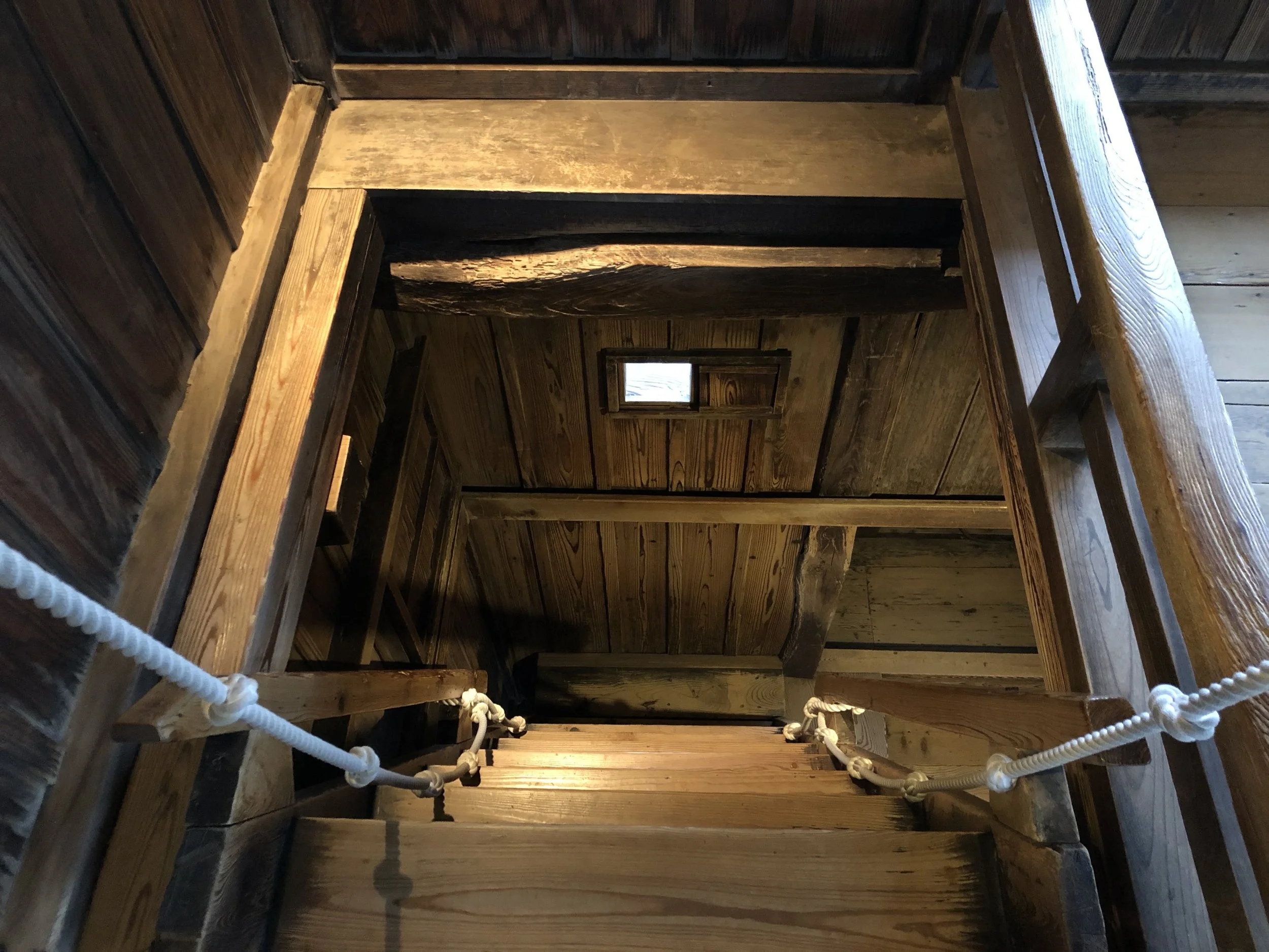 Inside, the castle is largely preserved in its original form, with a few historical displays and dioramas providing context. The most memorable part of the visit was the staircases. They are extremely steep, especially between the upper levels, and ropes have been added to help visitors climb safely. Reaching the top floor was well worth the effort. From there, I was treated to panoramic views of the town below, with one window perfectly framing the landscape like a living photograph.