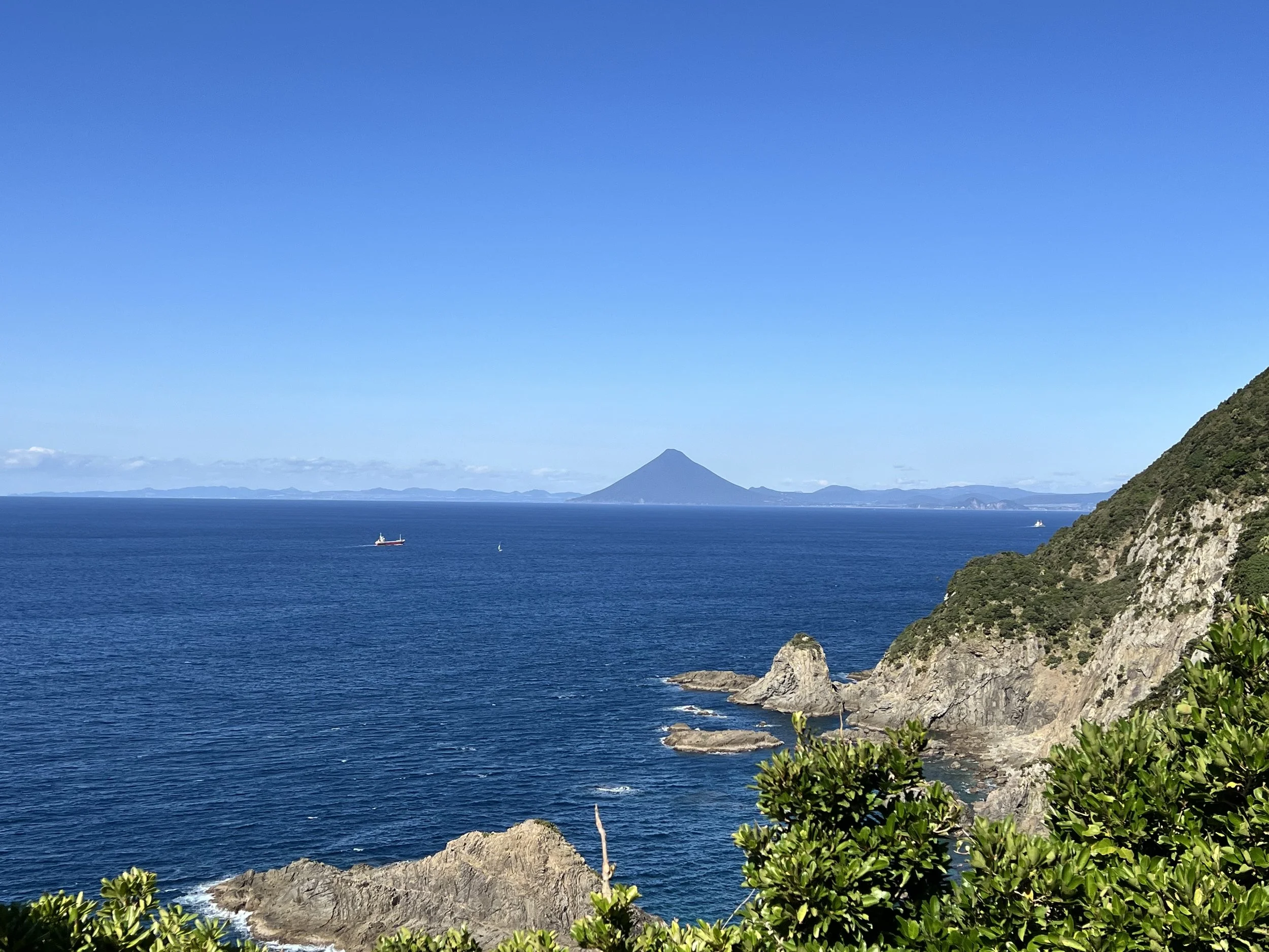 My first destination was Cape Sata. I chose the scenic coastal route over toll roads, and the 2.5-hour drive was stunning, with views of Sakurajima volcano and the ocean. At Cape Sata, I walked a well-kept trail past a shrine to the observation deck, where I could see Kaimondake Volcano in the distance.