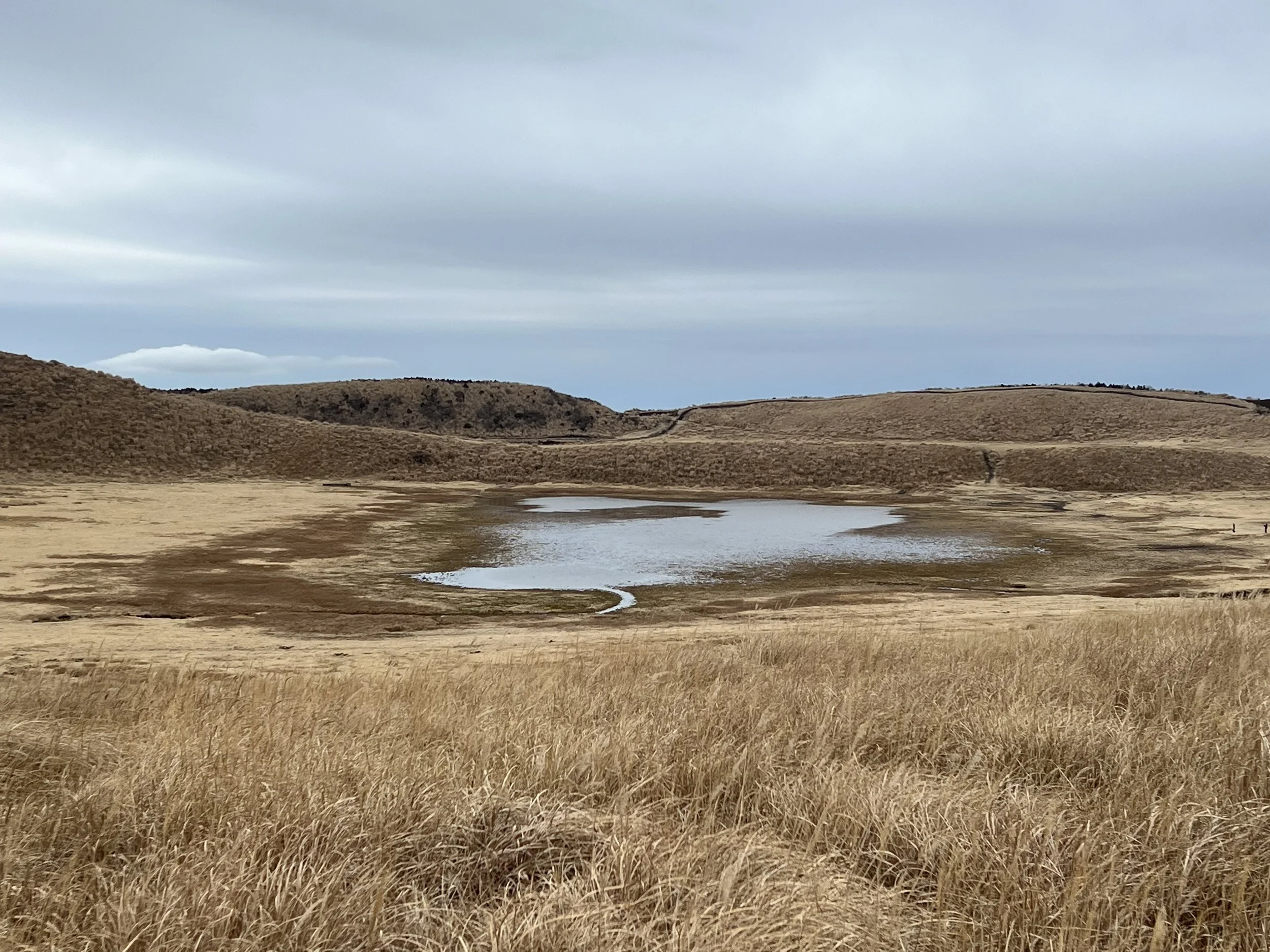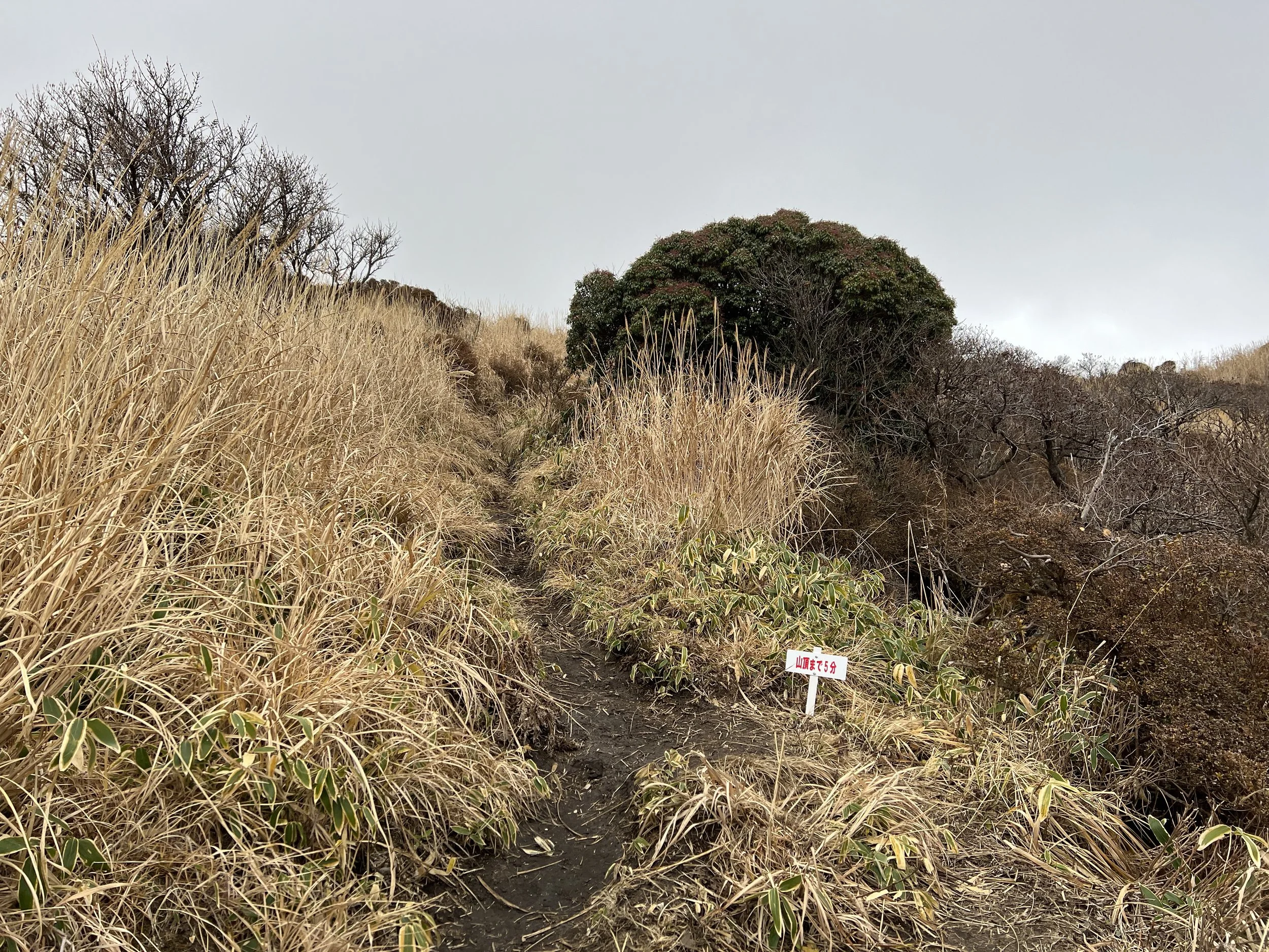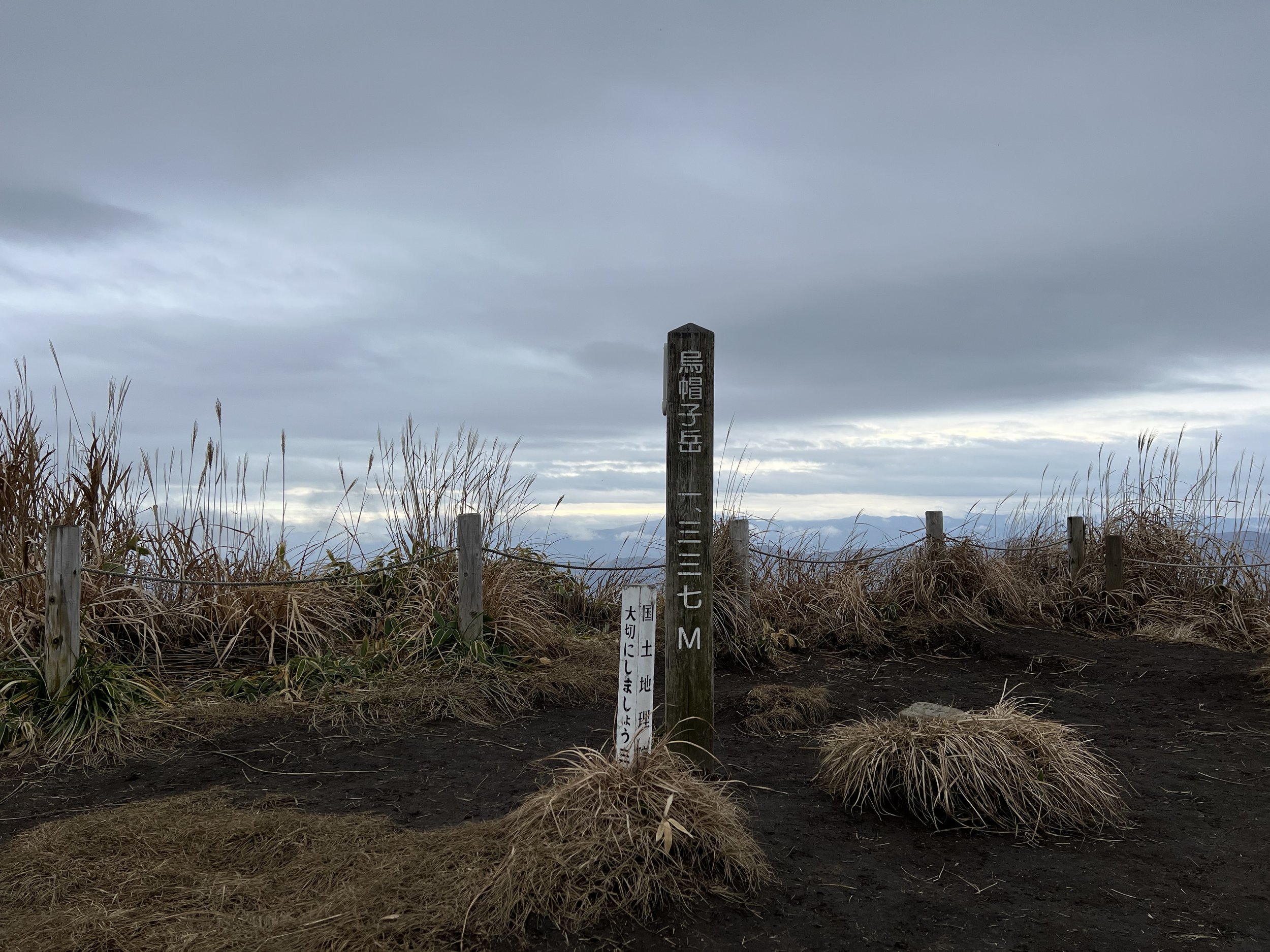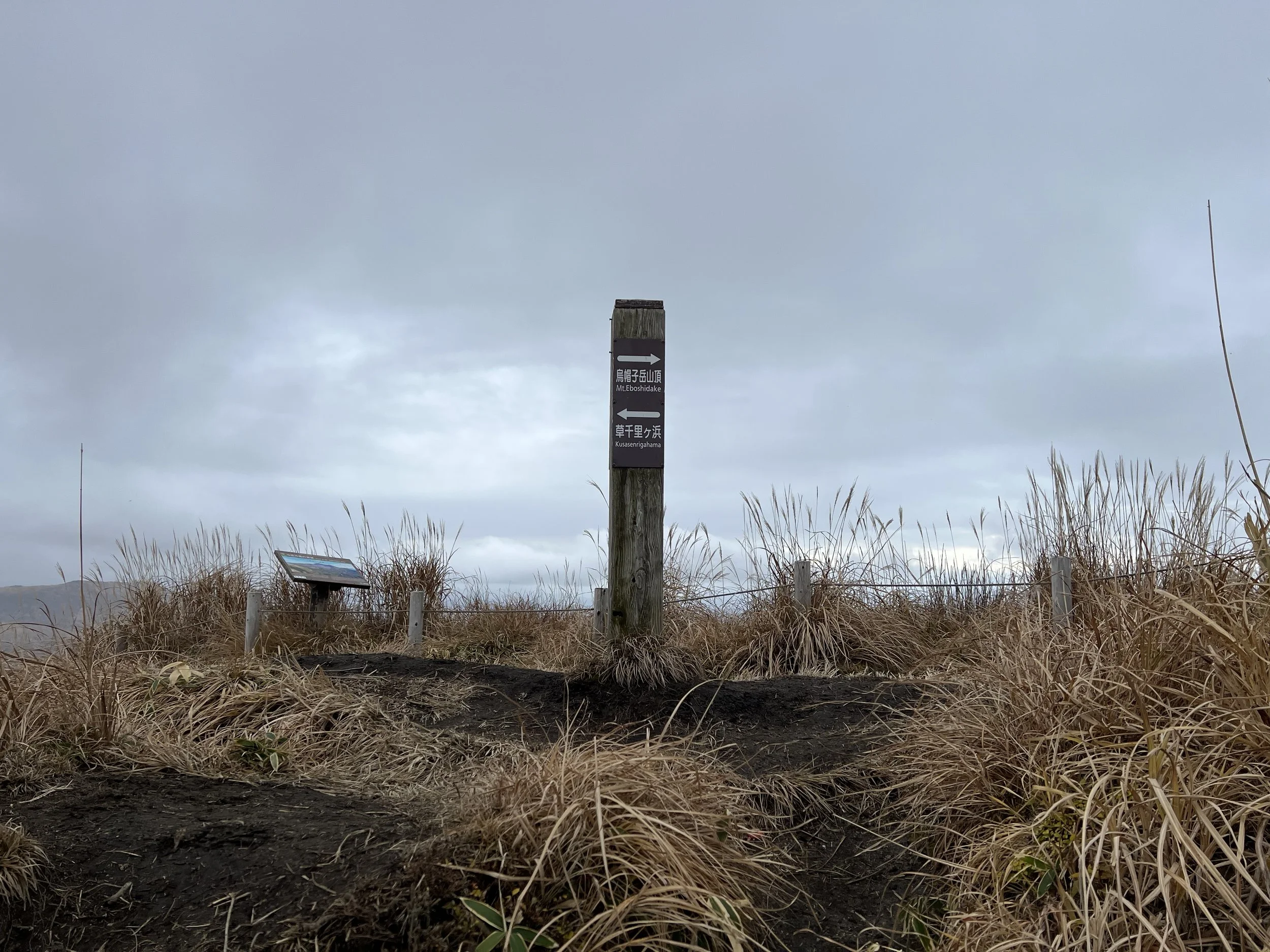 Kusasenrigahama is a wide, grass-covered plain known for its grazing horses during the warmer months, when visitors can also enjoy horseback riding. In winter, however, the landscape is mostly brown, and the small pond there had begun to freeze along the edges. After a brief stop, I continued toward the Mount Eboshi trailhead. The trail itself was narrow and muddy, with slippery sections that required careful footing.