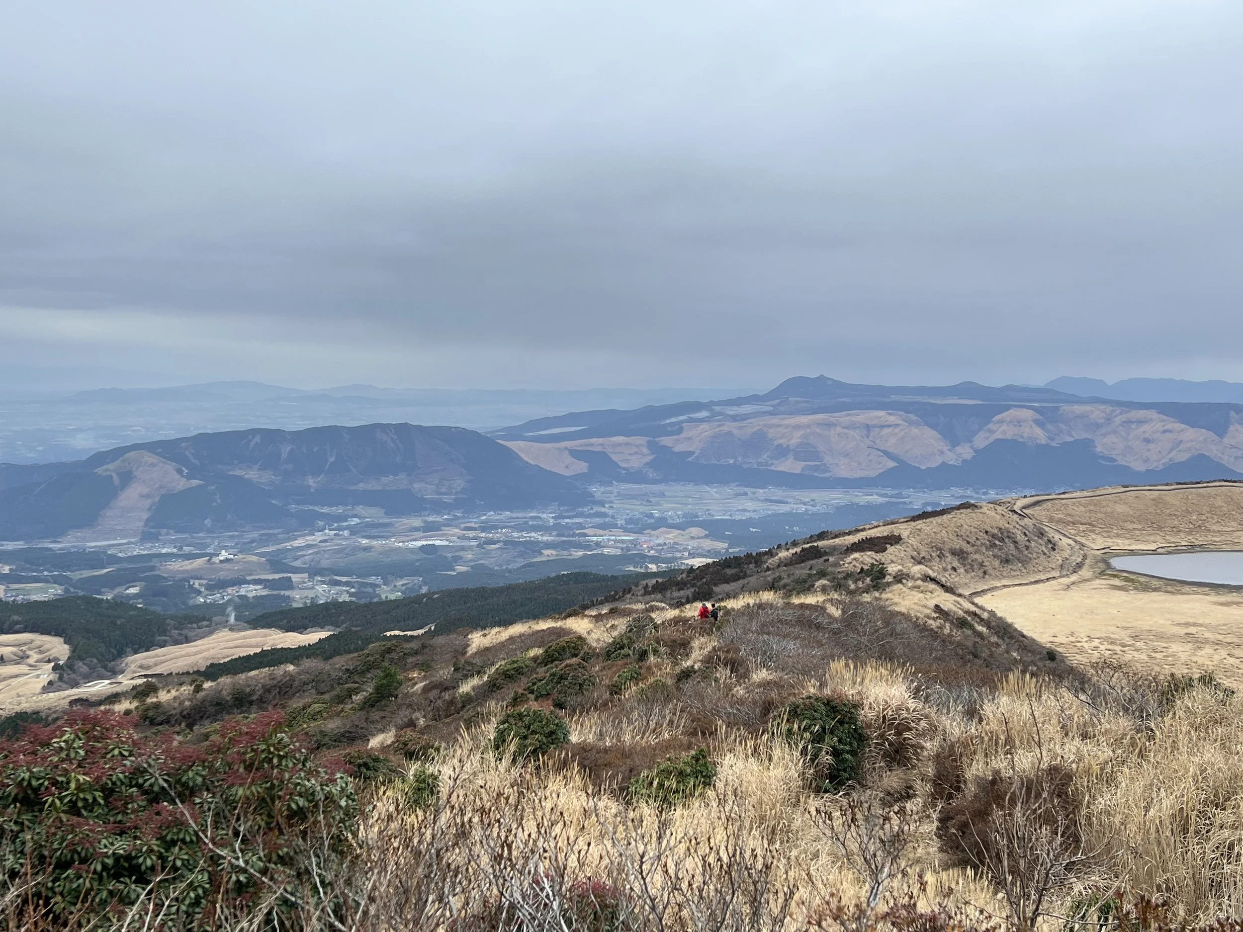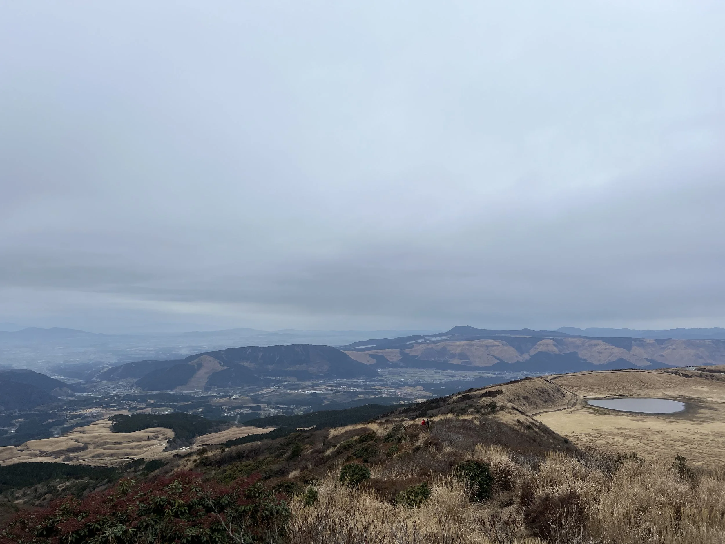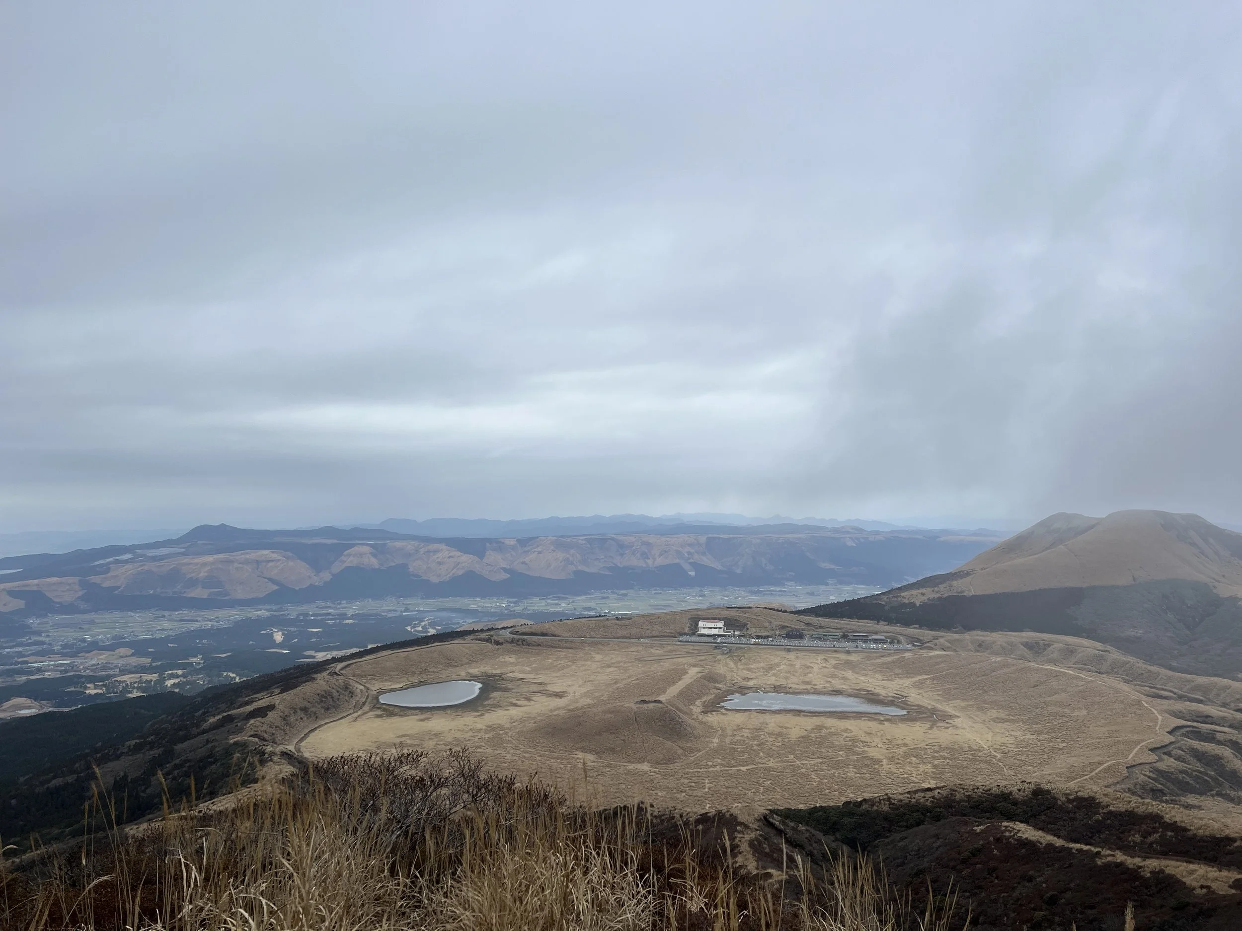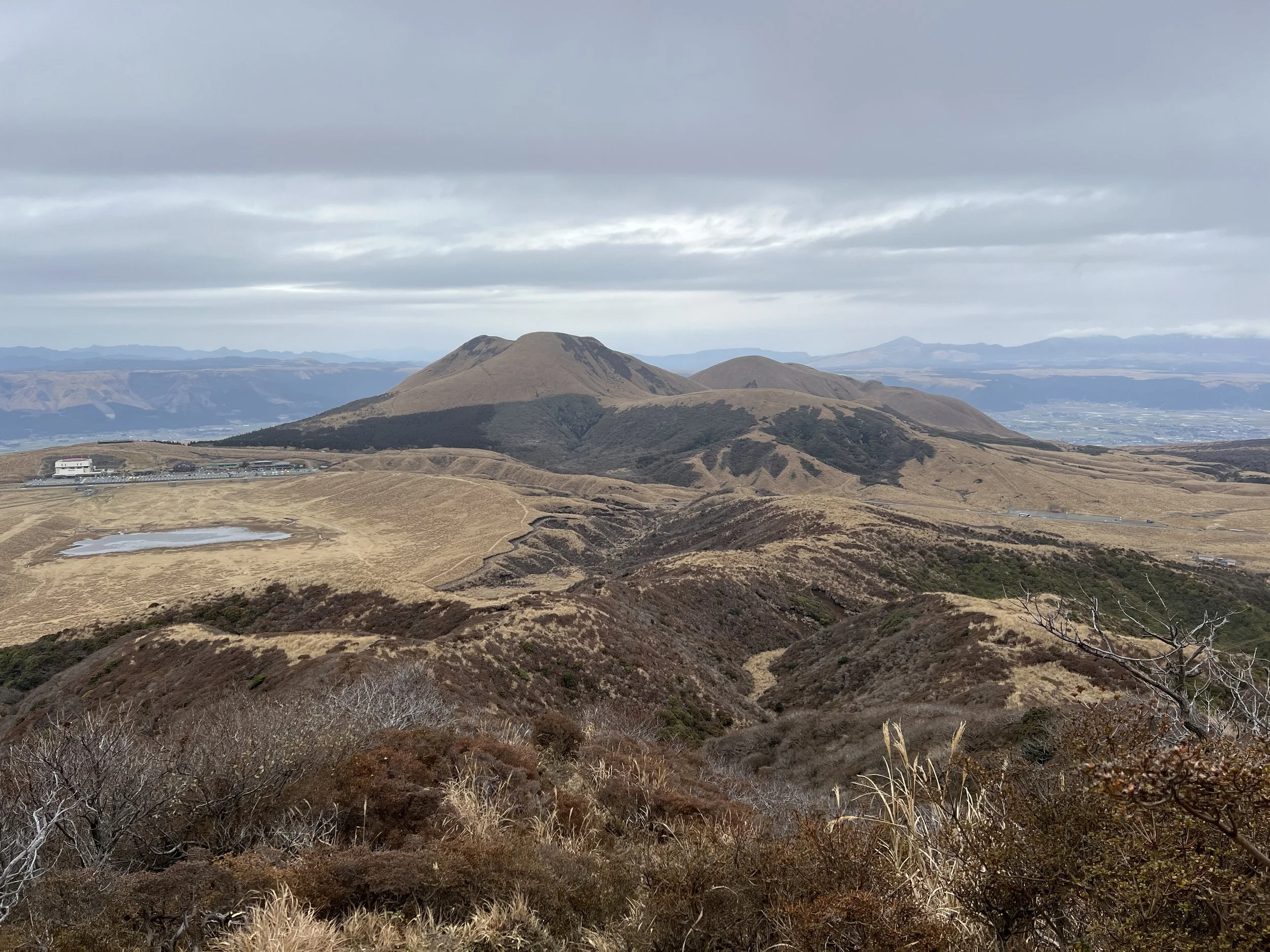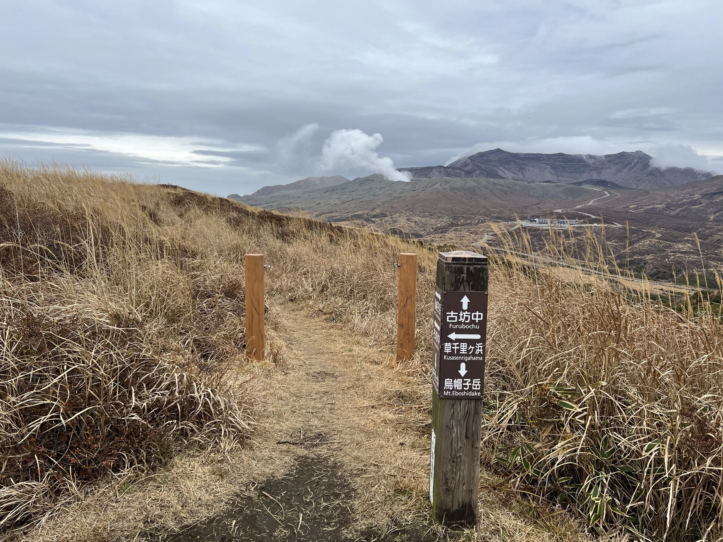To avoid paying for another bus ride, I decided to hike down from the crater toward the Aso Volcano Museum, continuing on to Kusasenrigahama before joining the trail up Mount Eboshi. The route from the crater to the museum follows a paved road, making for an easy walk. After arriving at the museum, I spent some time at the nearby viewpoints before continuing on toward Kusasenrigahama.