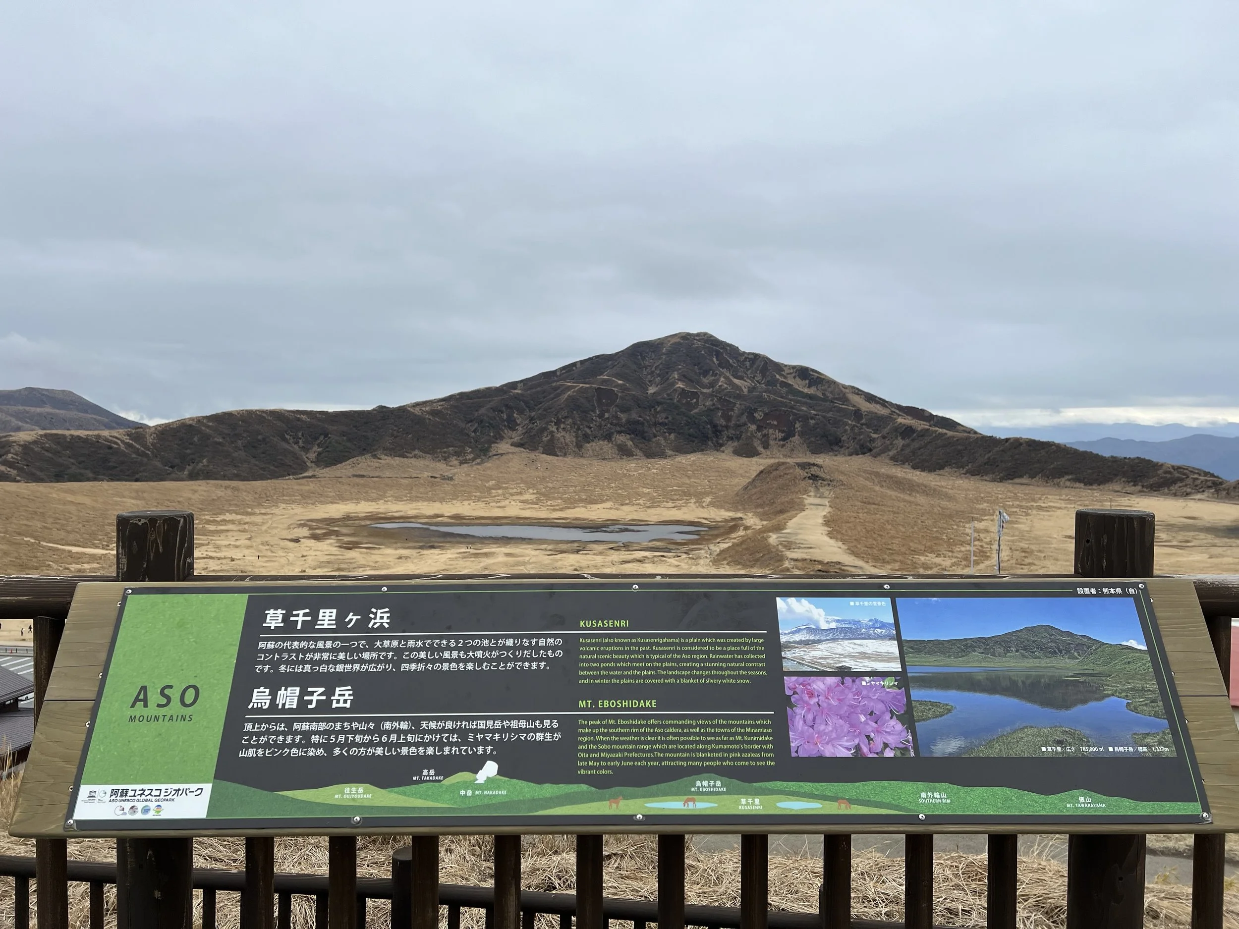 The area surrounding Mount Eboshi has long been used for grazing and agriculture, with Kusasenrigahama serving as pastureland for centuries. Today, Mount Aso remains an important geological site and a major destination for visitors interested in volcanology, hiking, and natural scenery. Due to its ongoing volcanic activity, access to certain areas—including the crater—can change frequently depending on safety conditions.