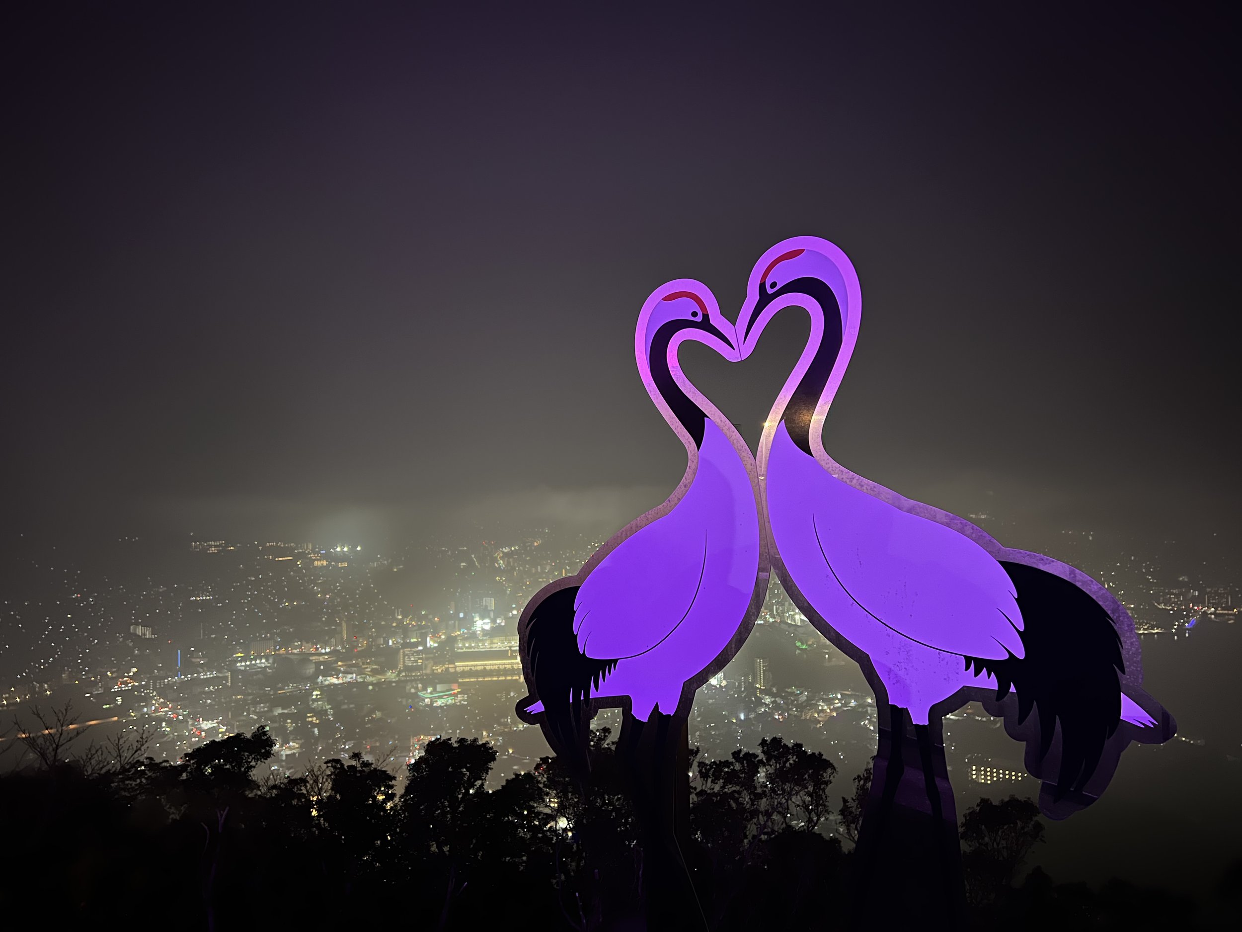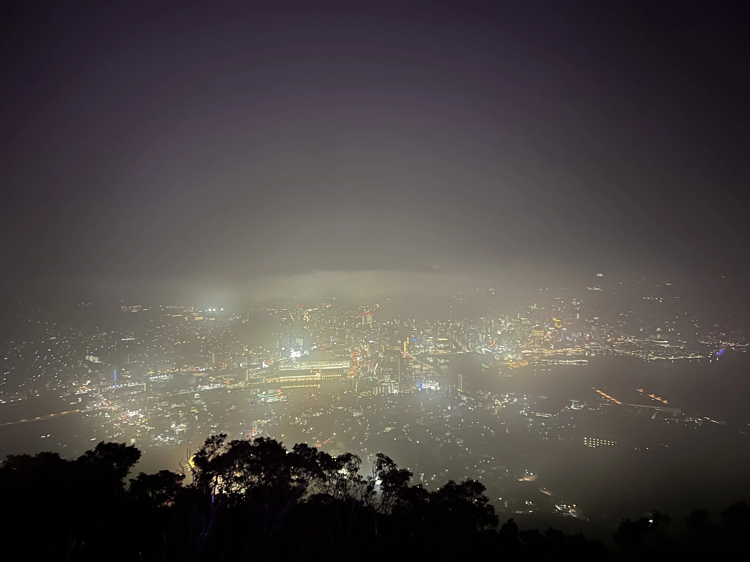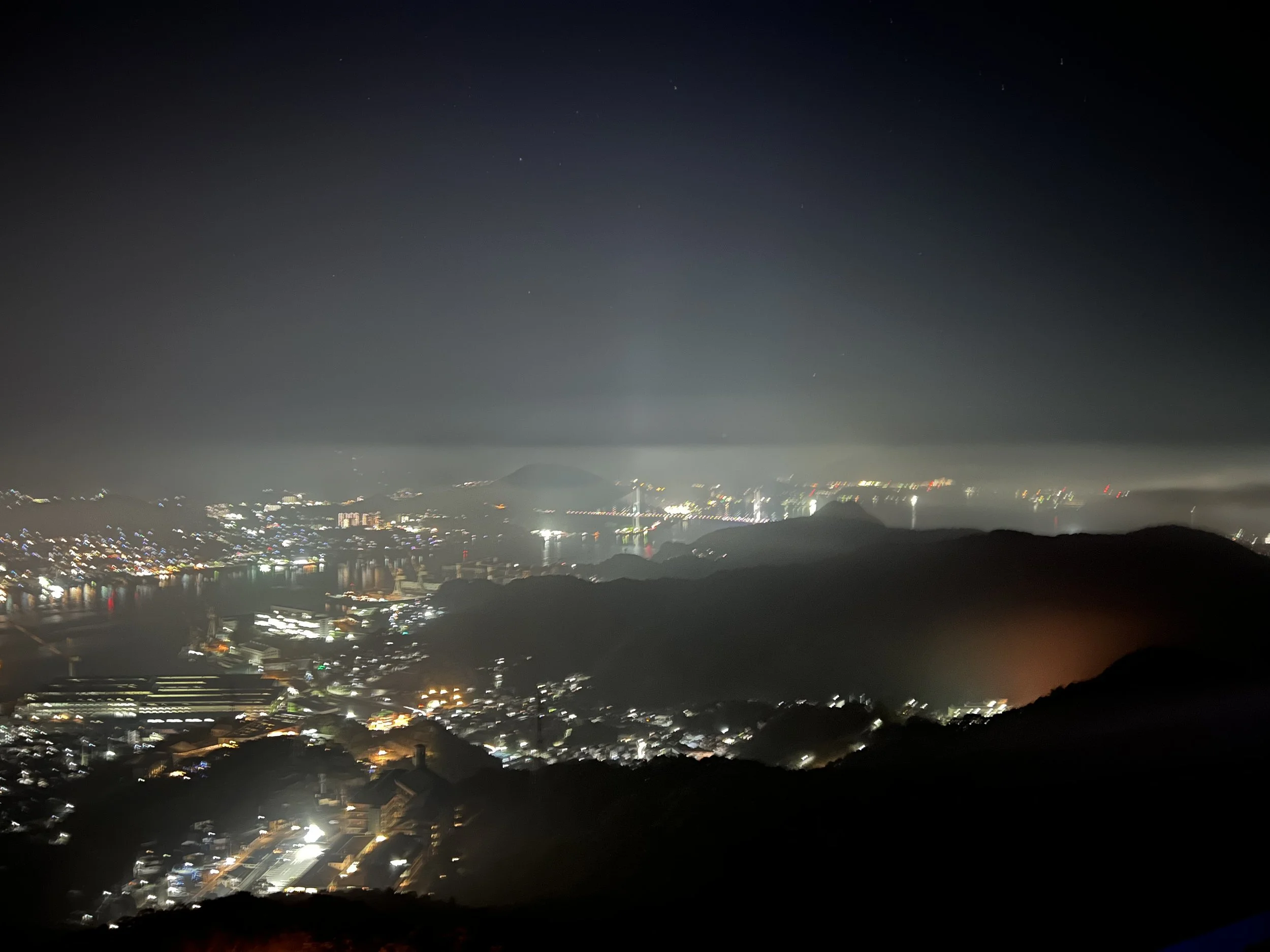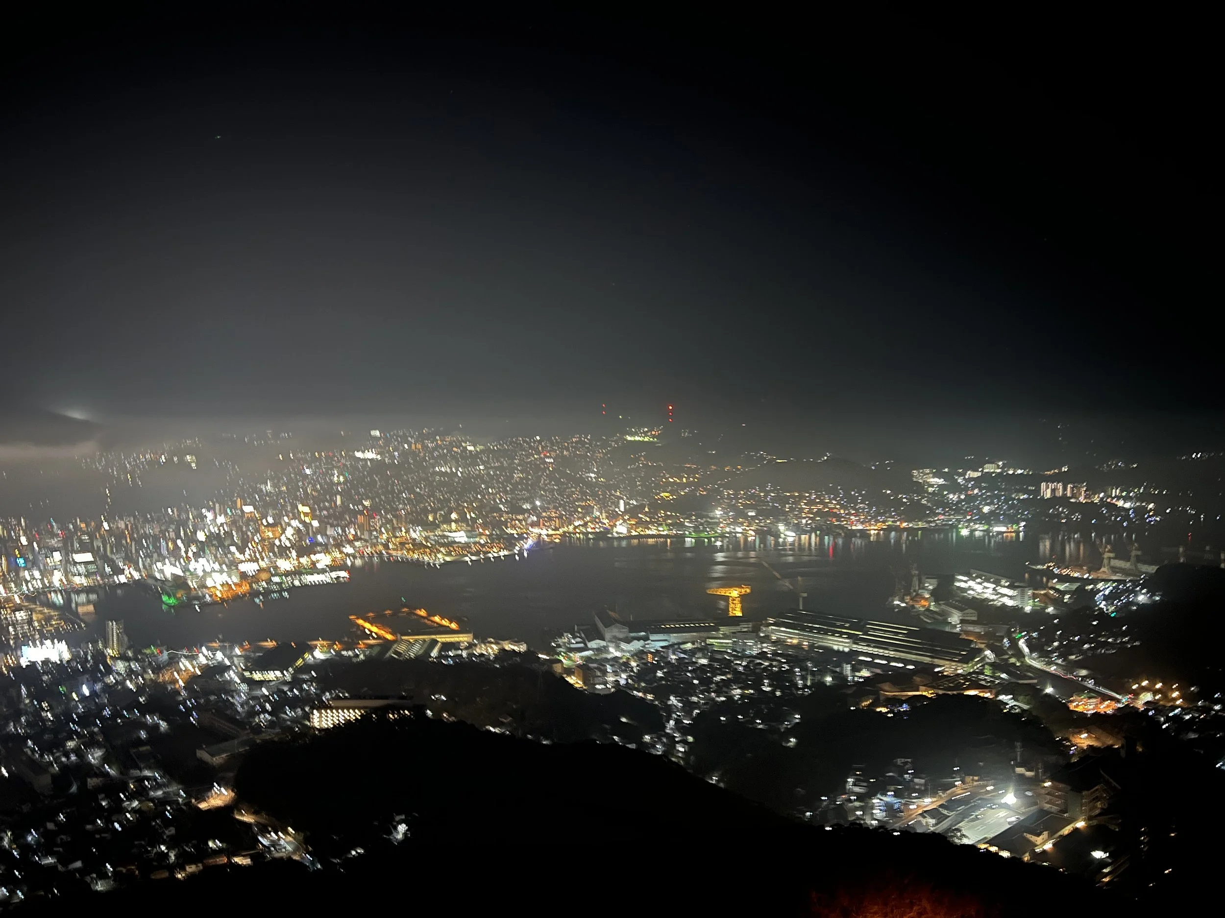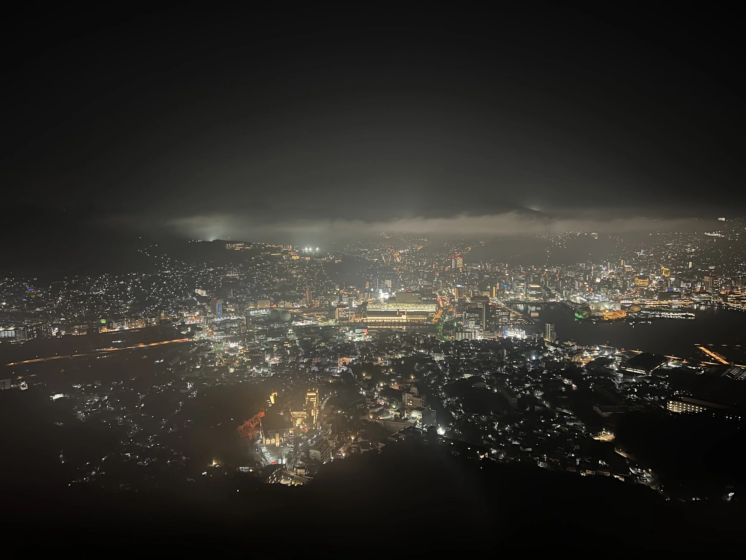 Even with the mist thickening, the scene was beautiful. The fog drifted slowly across the city lights below, creating a glowing, dreamlike effect. The shimmering lights of Nagasaki Bay contrasted with the dark silhouette of the mountains—a different kind of beauty than a clear night, but one with its own quiet charm.