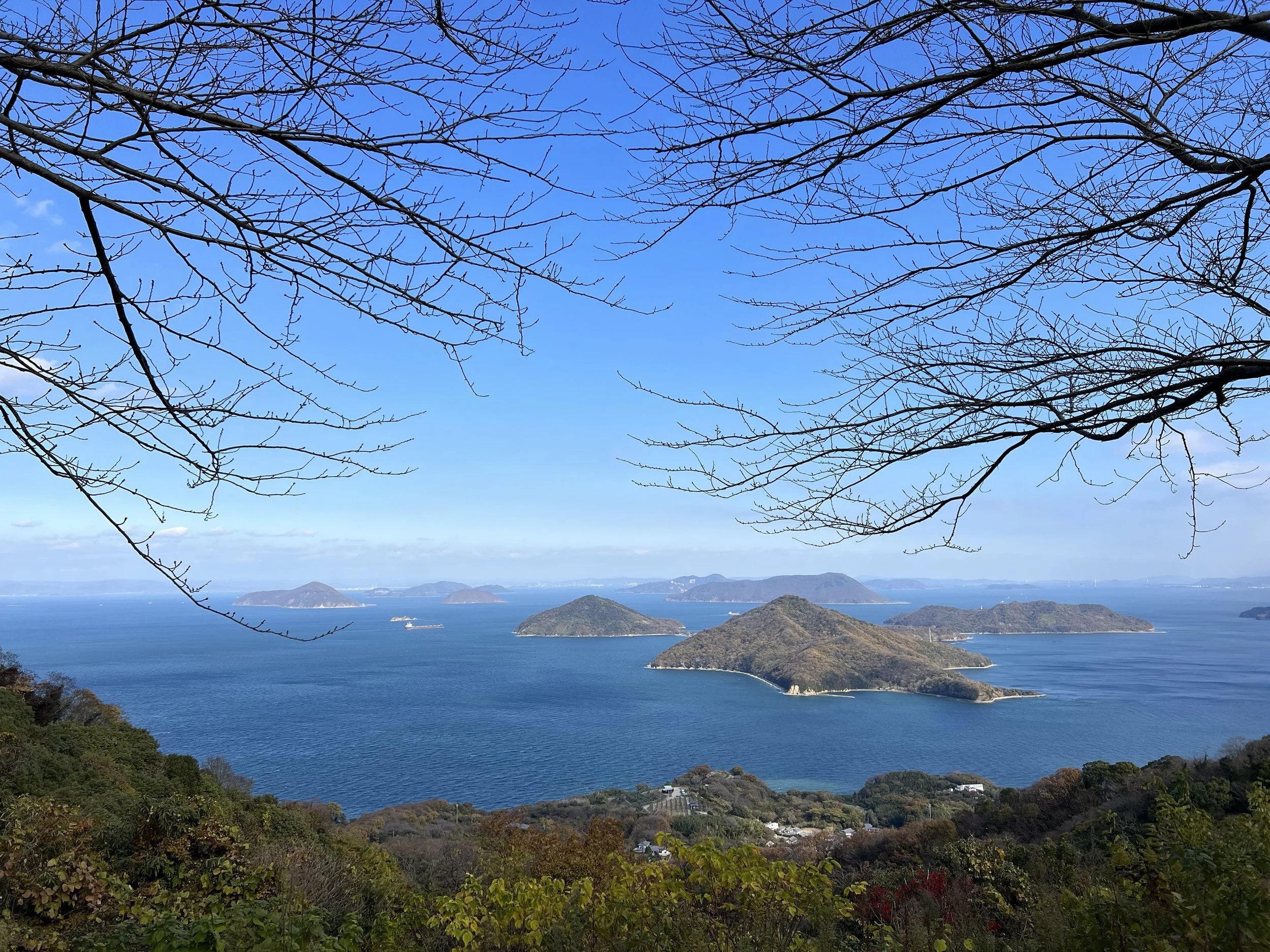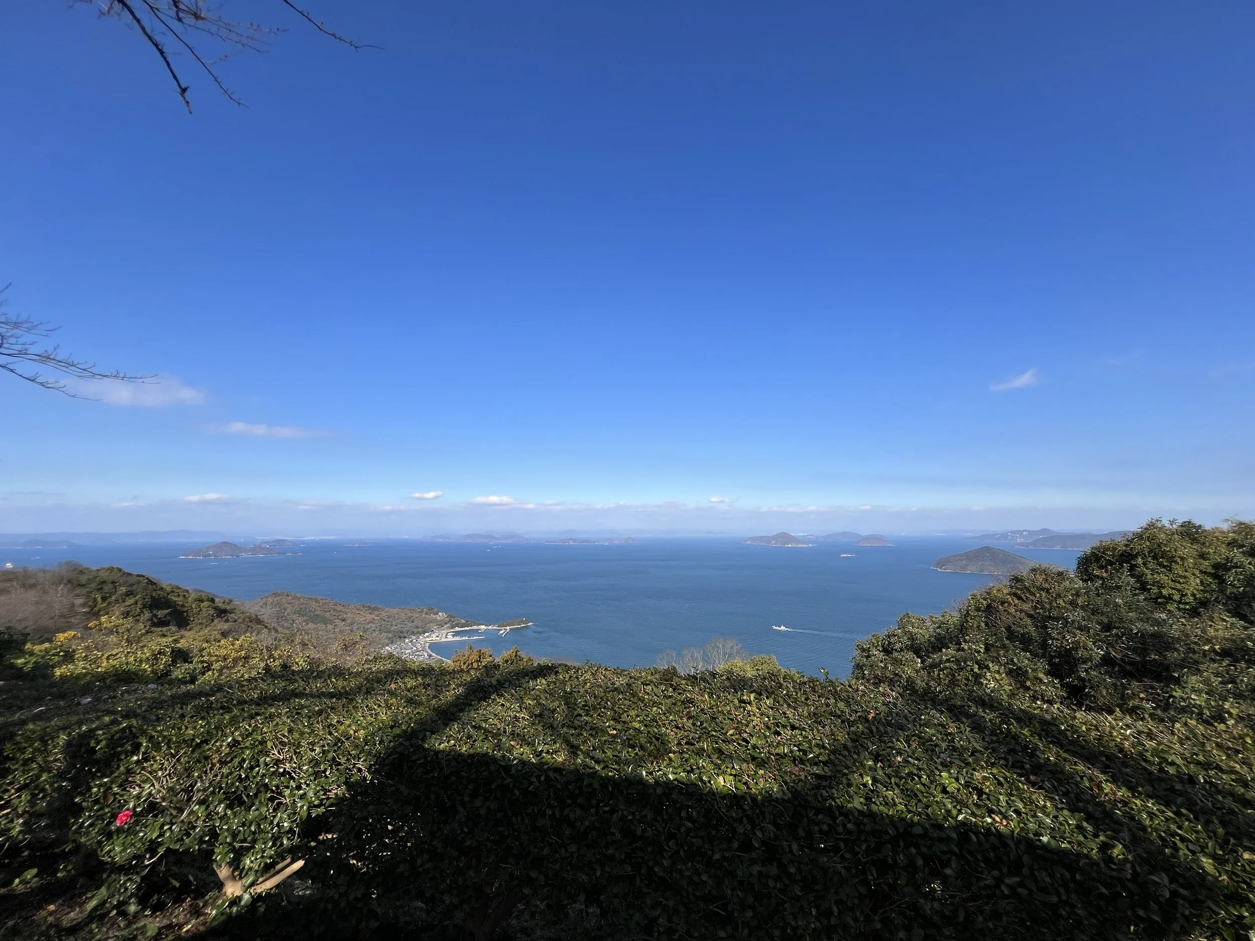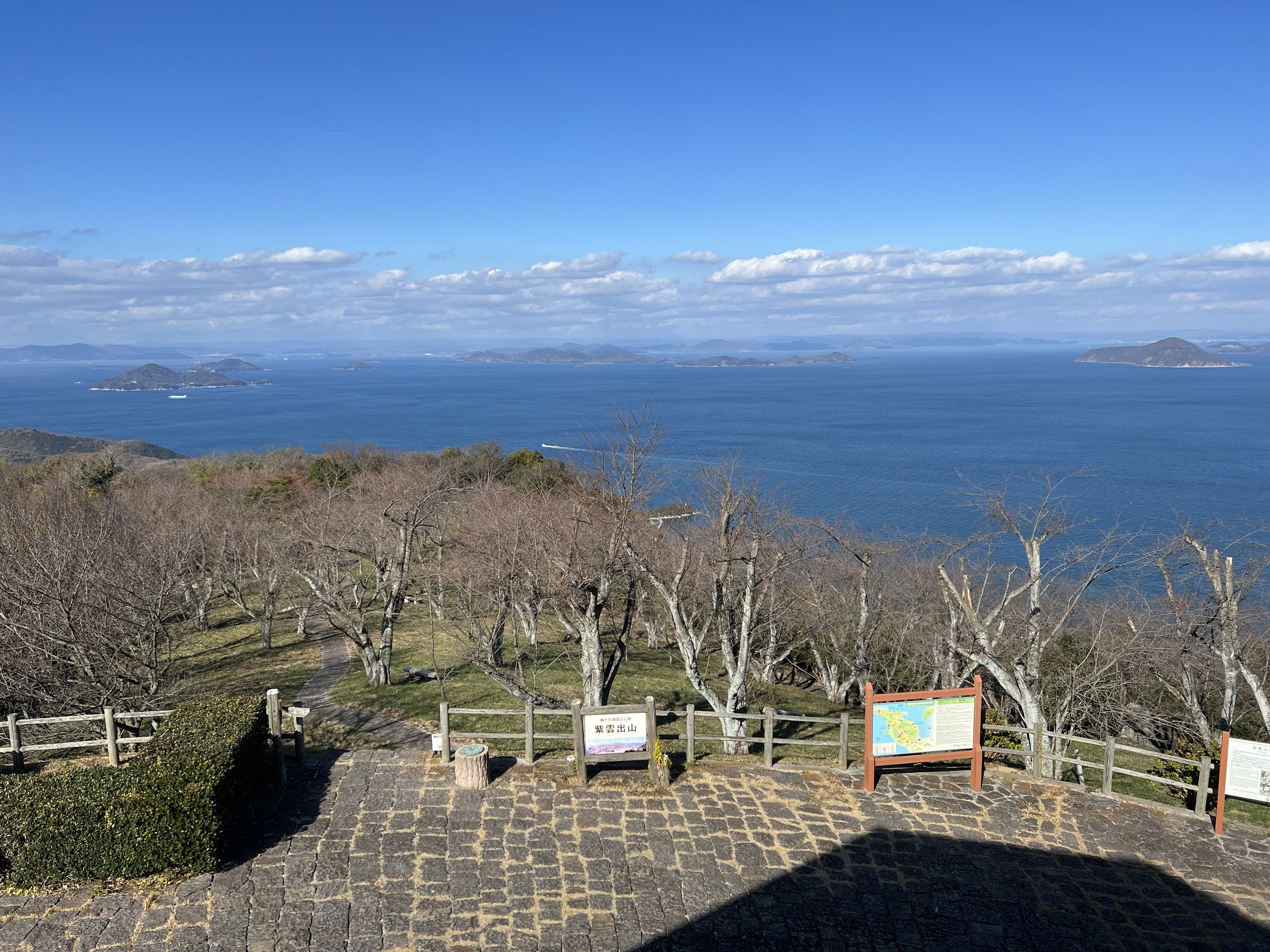 After familiarizing myself with the precautions, I continued on. About fifteen minutes below the summit, there are two small parking lots with very limited space, and even from here the views were already impressive. The islands scattered across the Seto Inland Sea stretched out below, and despite the trees being bare at this time of year, the scenery was still striking. I lingered here for a while, imagining how spectacular it must be during peak bloom, before continuing the final stretch to the summit.
