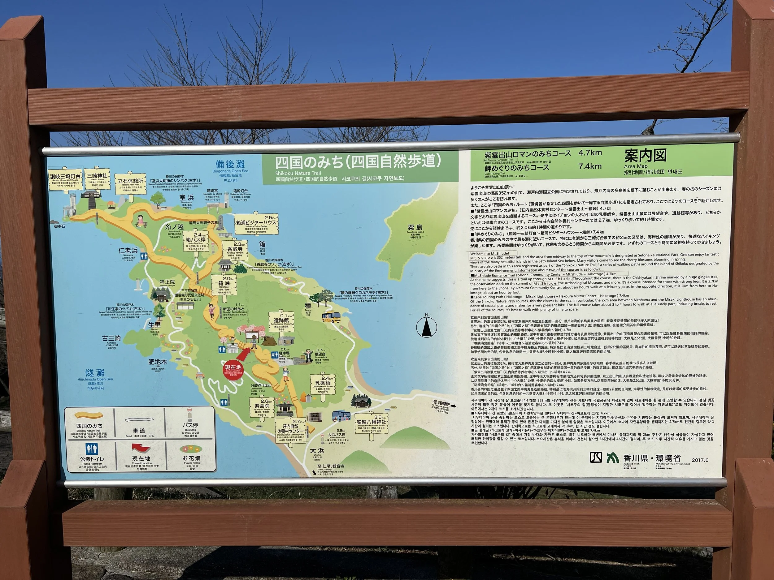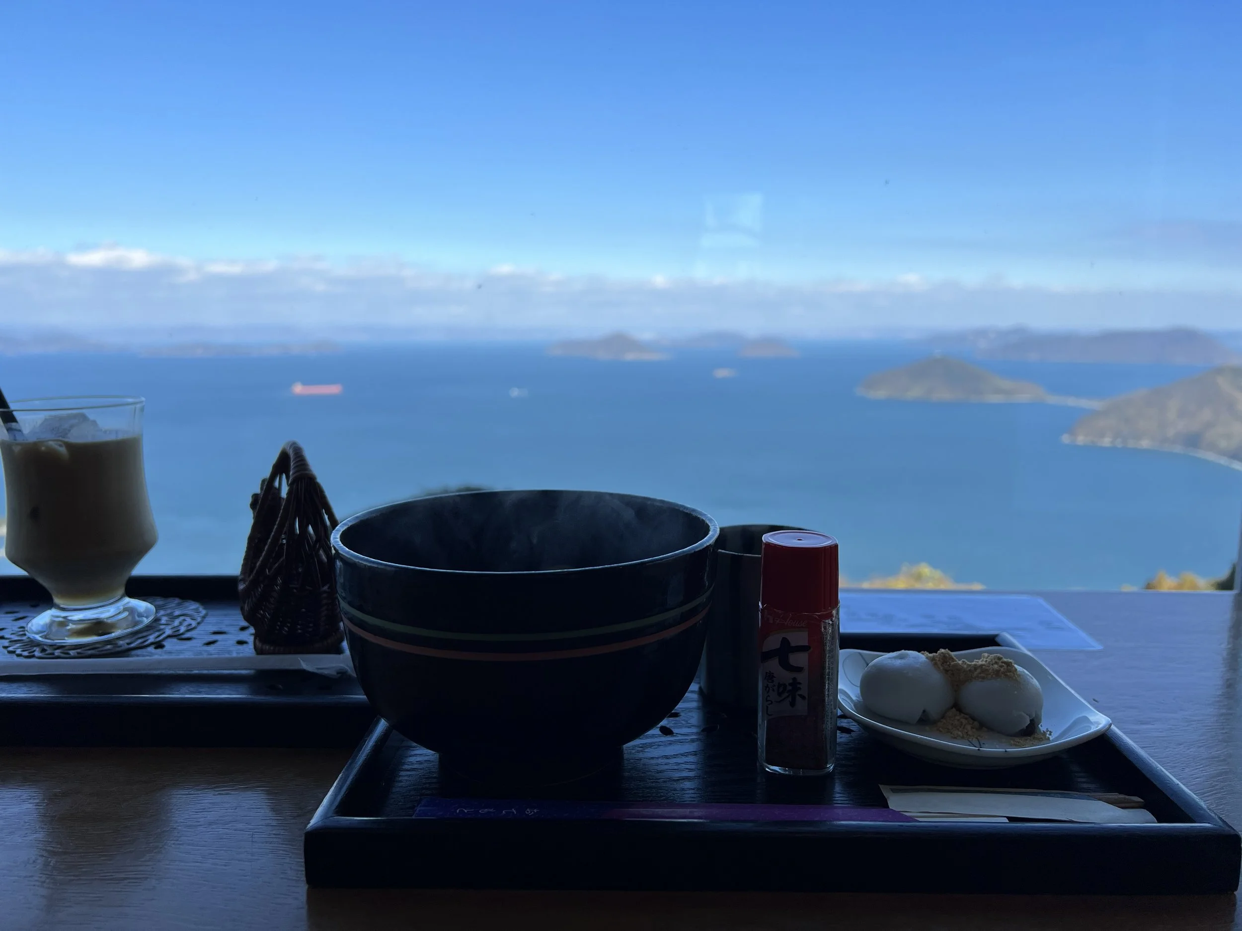 The last section of the trail is particularly pleasant, with trees lining both sides, occasional viewpoints, and benches where you can stop to rest. I had heard that during spring, people bring picnic blankets for flower viewing, and it’s easy to see why. Near the summit, there is a café, and beside it sits a small archaeological area. I decided to take a break at the café and ordered a late lunch, choosing a seat facing the Seto Inland Sea. With good food and a wide-open view, it was a peaceful and welcome break.