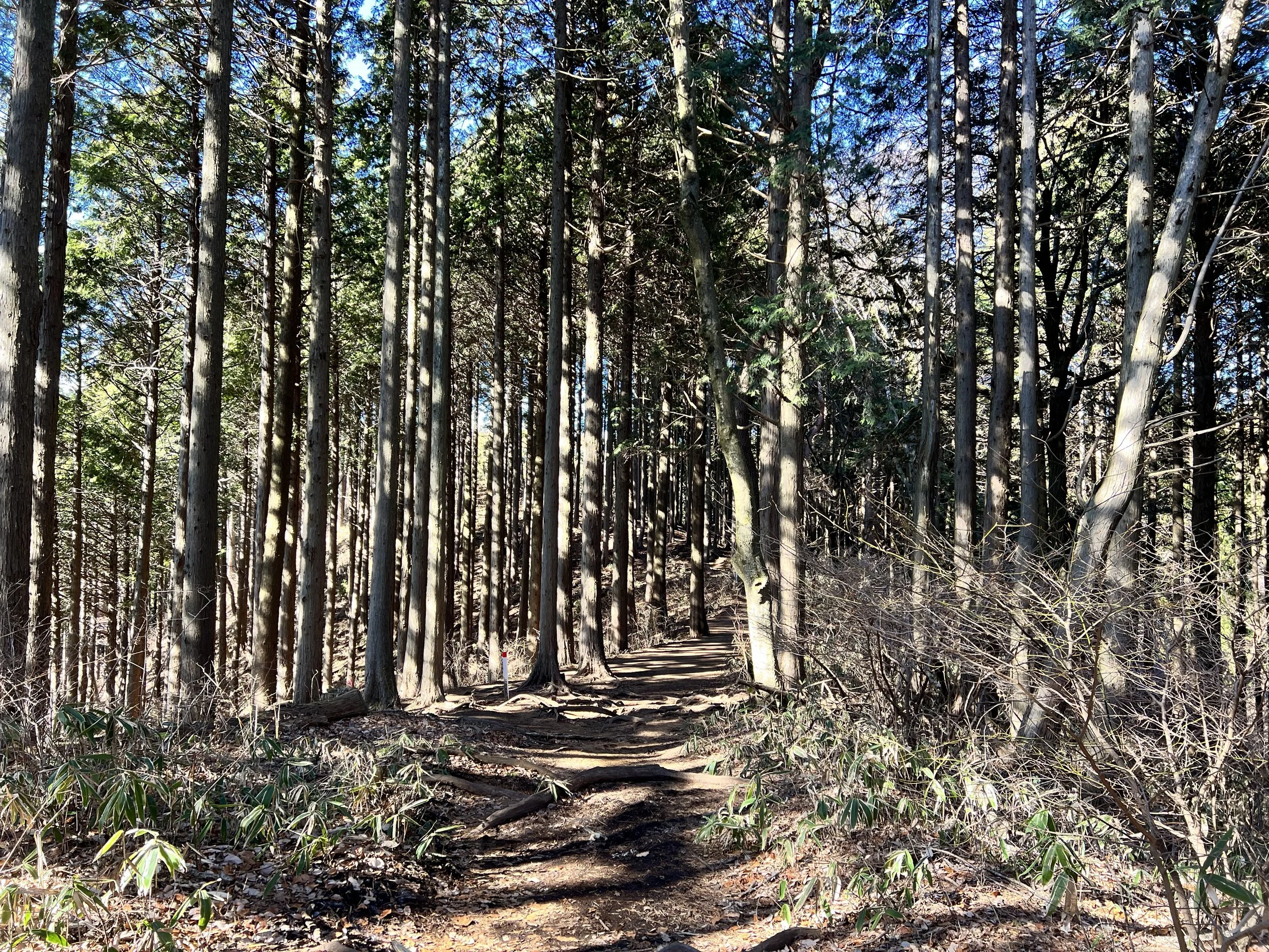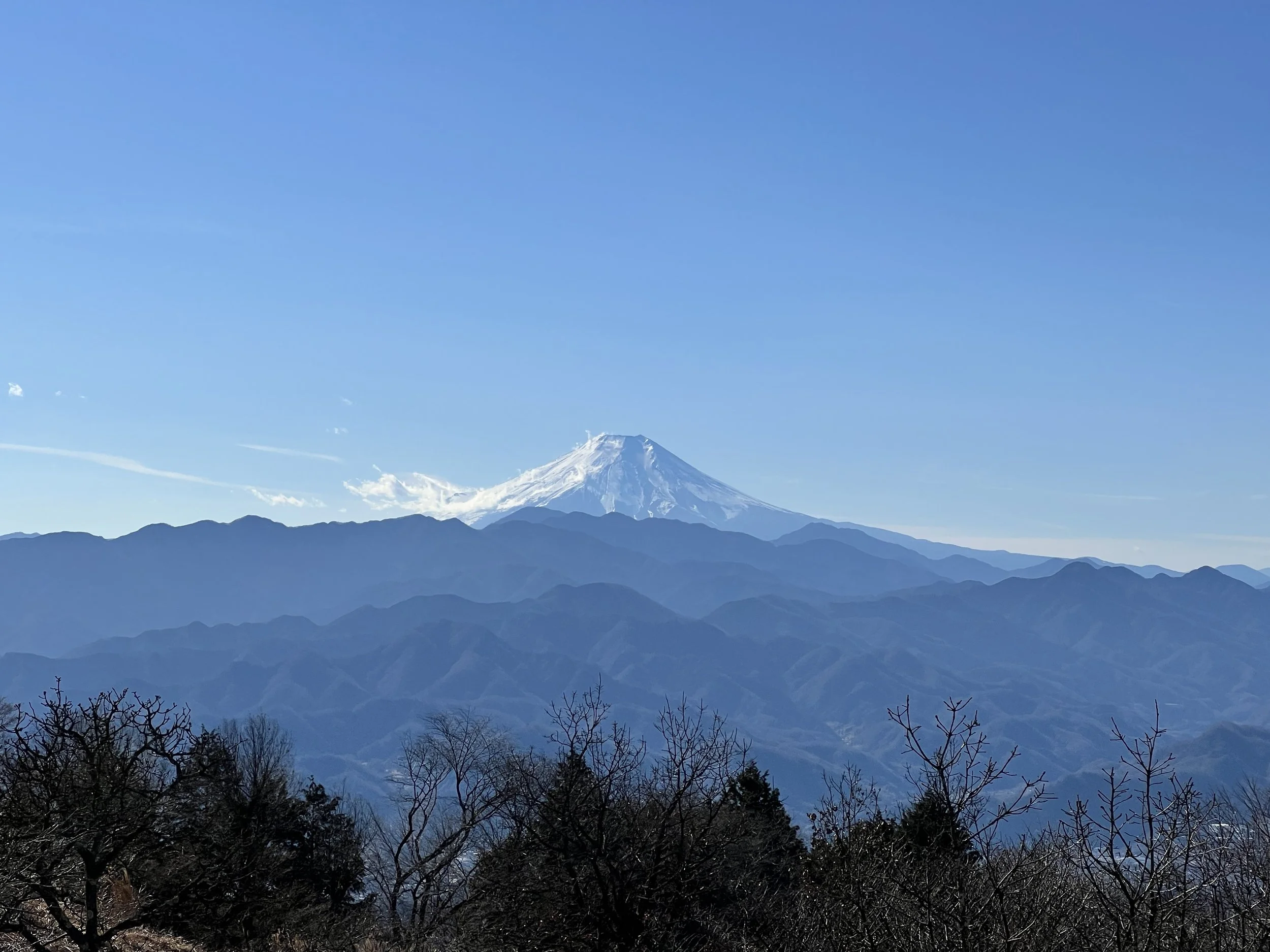 As I approached the peak, I saw the concrete horse statue marking the summit, fitting for a mountain named “horse camp.” Two nearby tea houses offered clear views of Mt. Fuji, but in winter, only one was open. I spent 15 minutes photographing and snacking at a picnic table before heading down the other side.