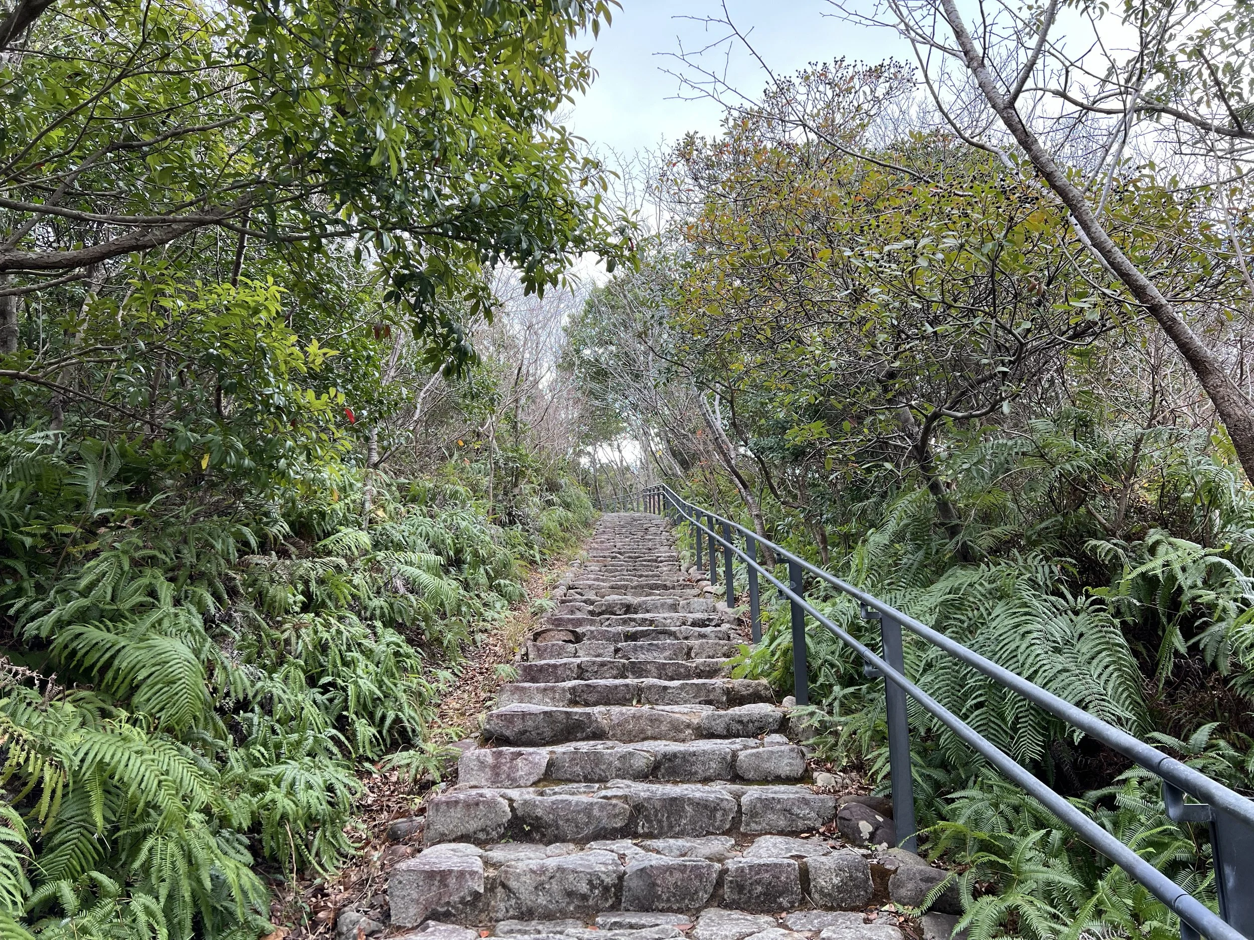 The trail starts with short stone steps leading to the first viewpoint and a nearby café parking lot. This is where most visitors stop since the view is great and easily accessible. I continued further up to more viewpoints. One mid-way spot offers views of Mt. Fuji, but it was too cloudy to see it that day.