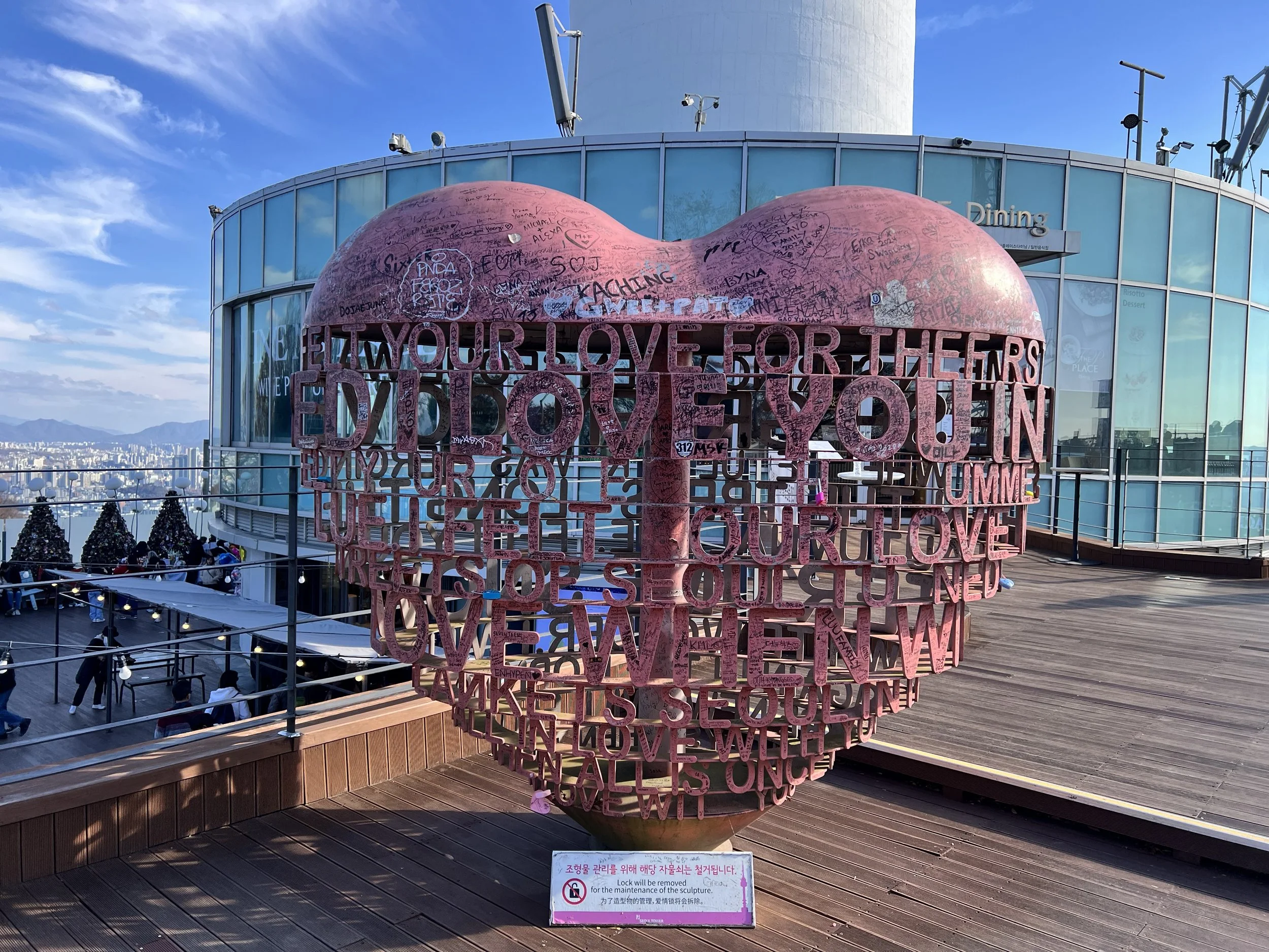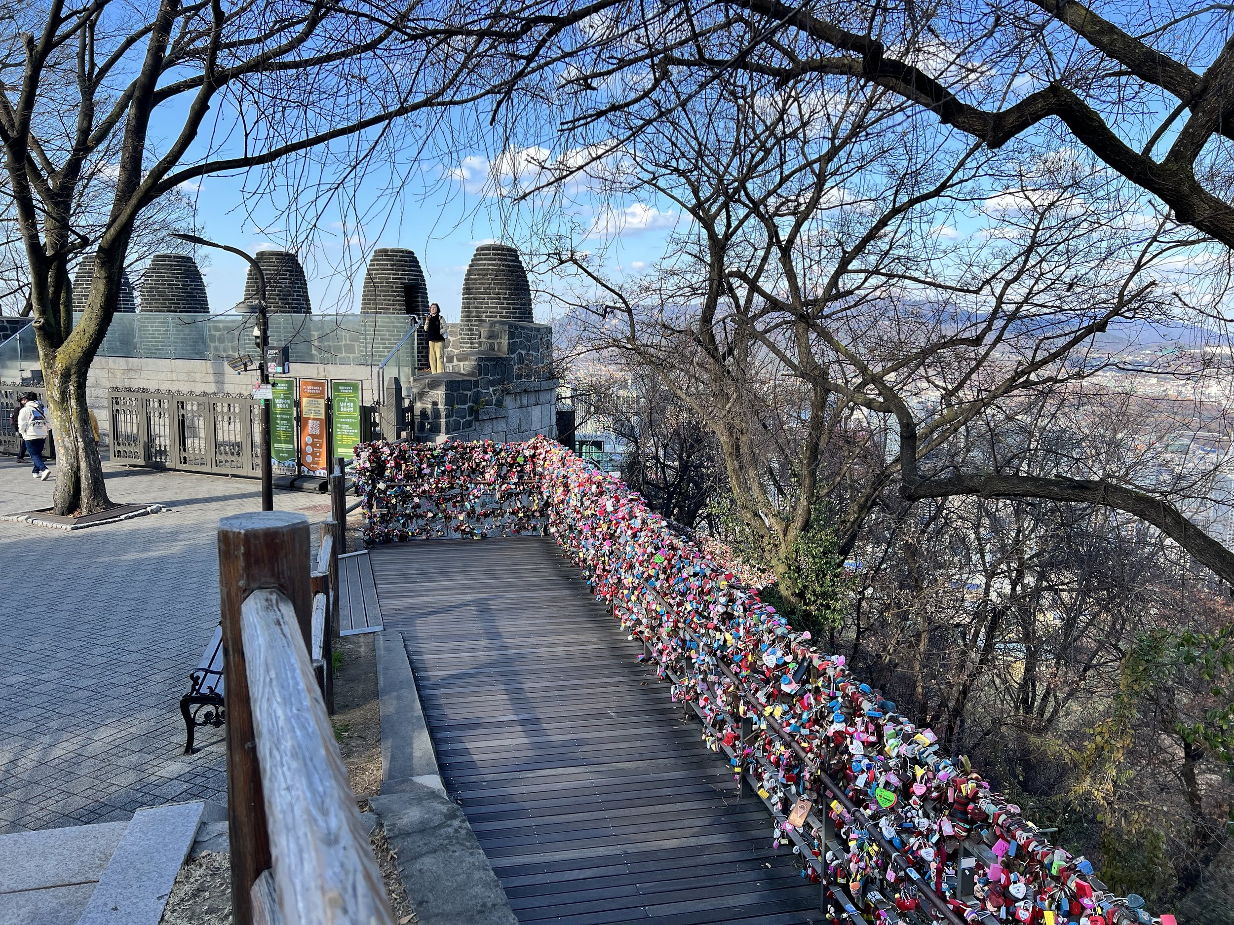 At the top, the first thing that caught my eye was the observation deck, offering a sweeping view of Seoul’s skyline. From up there, the city stretched endlessly in every direction—mountains on the horizon, high-rises glinting in the sunlight. I considered staying for sunset, but since it was still hours away, I decided to explore the area around the tower instead.