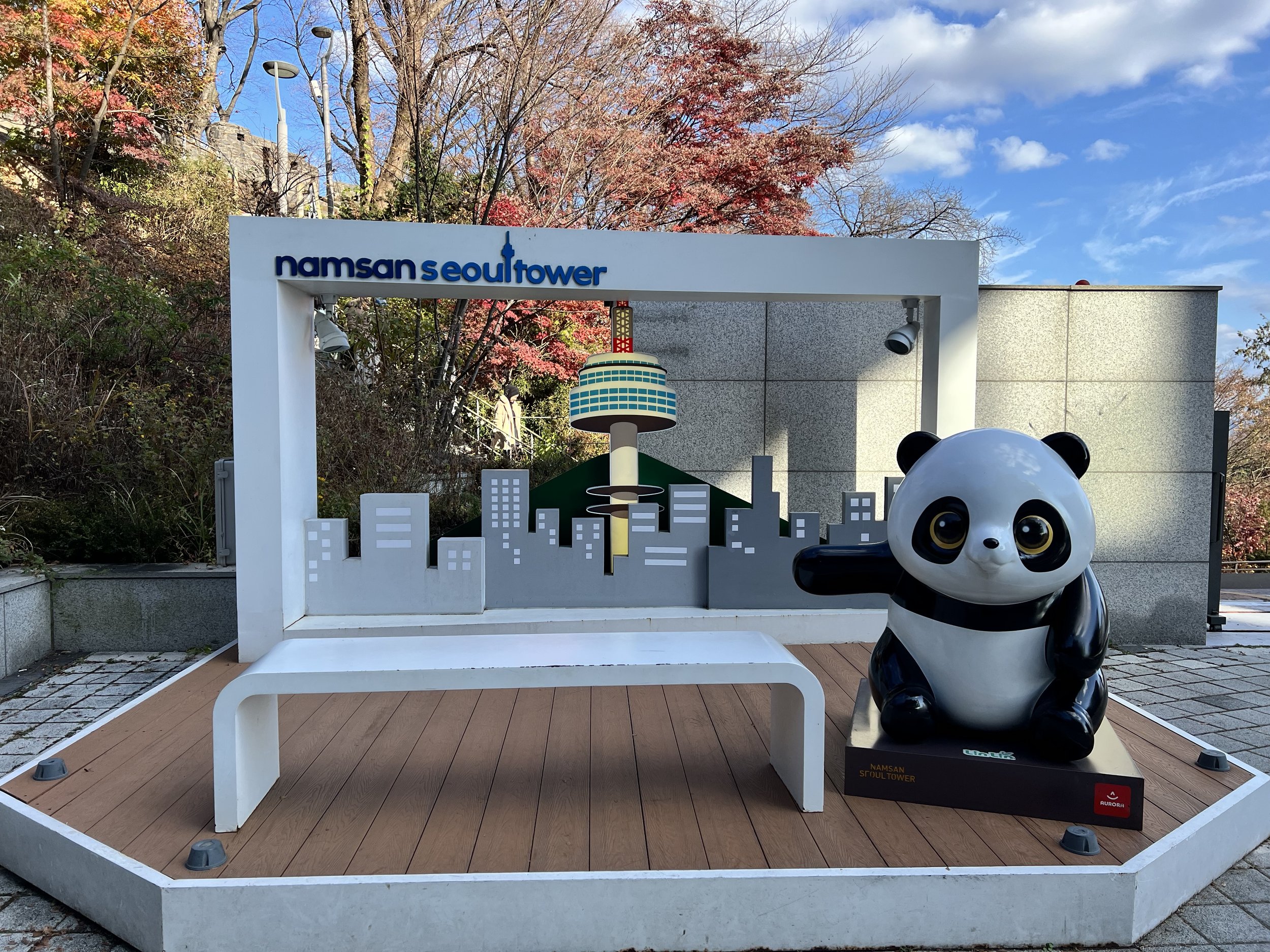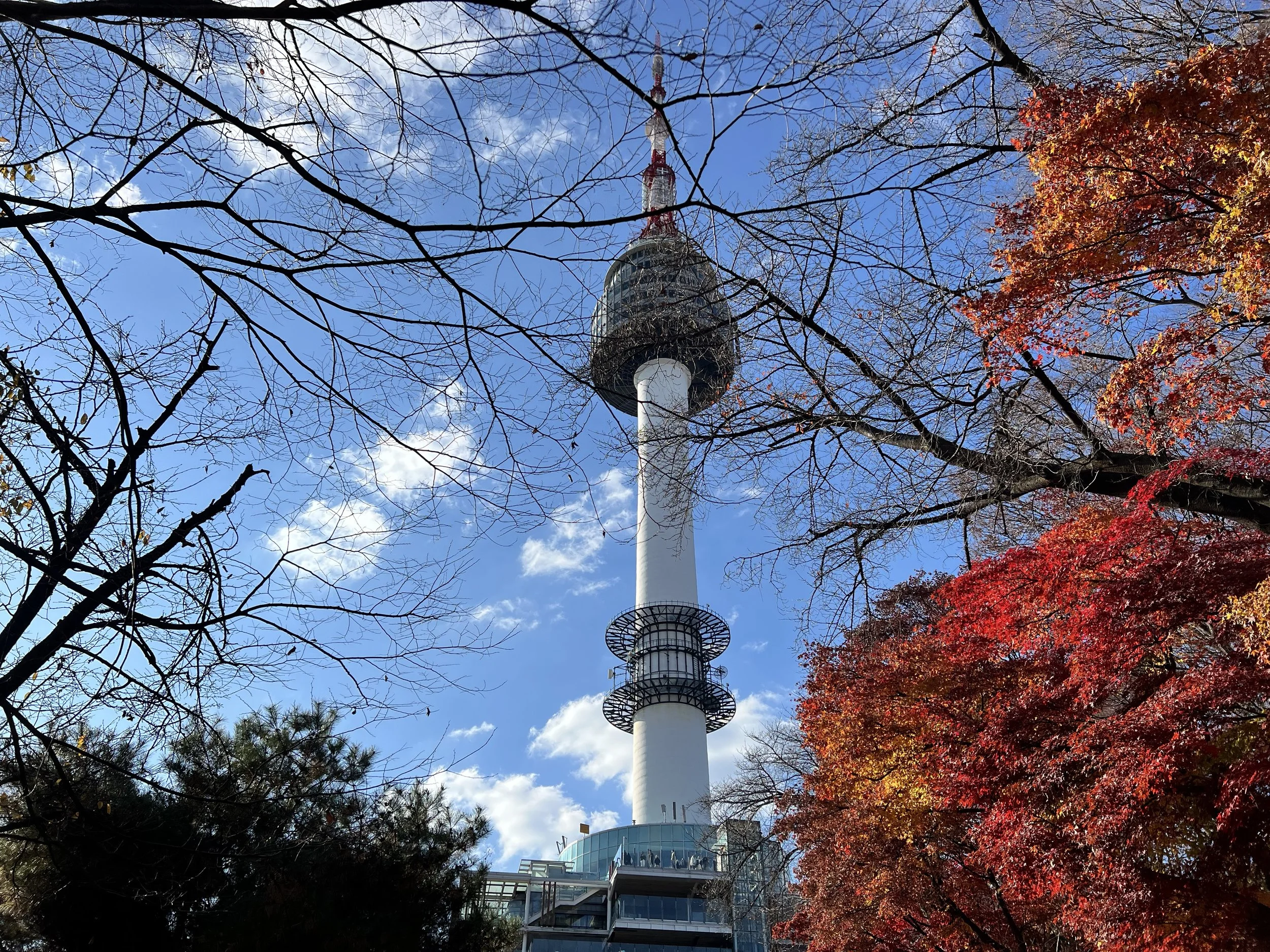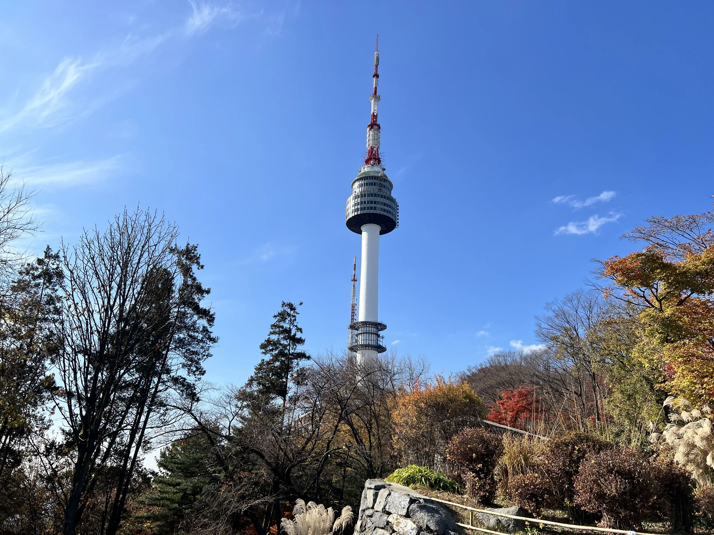 From Seoul Station, I made my way to N Seoul Tower on foot. There are options to take the Namsan Cable Car or a local shuttle bus up the mountain, but I decided to walk to enjoy the scenery along the way. The walk was mostly uphill, weaving through city streets before transitioning into the green paths of Namsan Park. It was a steady climb, but the fall colours made it worthwhile—trees glowing in shades of orange and red lined the route, and occasional glimpses of the city below kept me motivated. For those who prefer a more relaxed trip, the cable car is a great alternative offering a short ride with panoramic views of Seoul as you ascend.