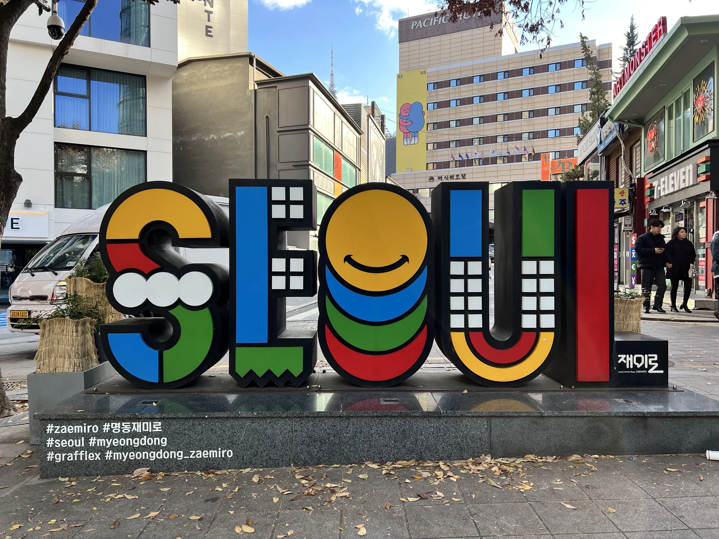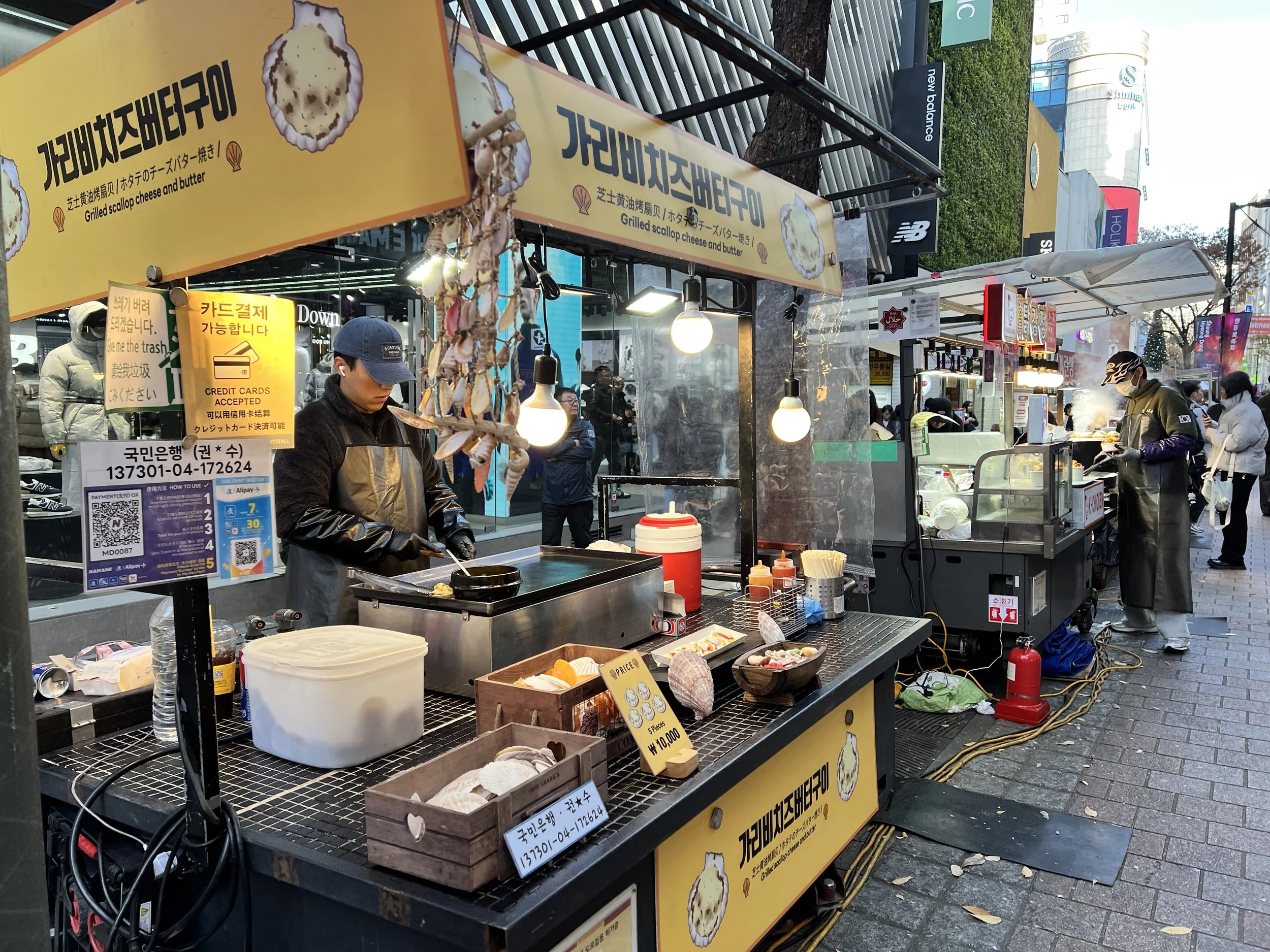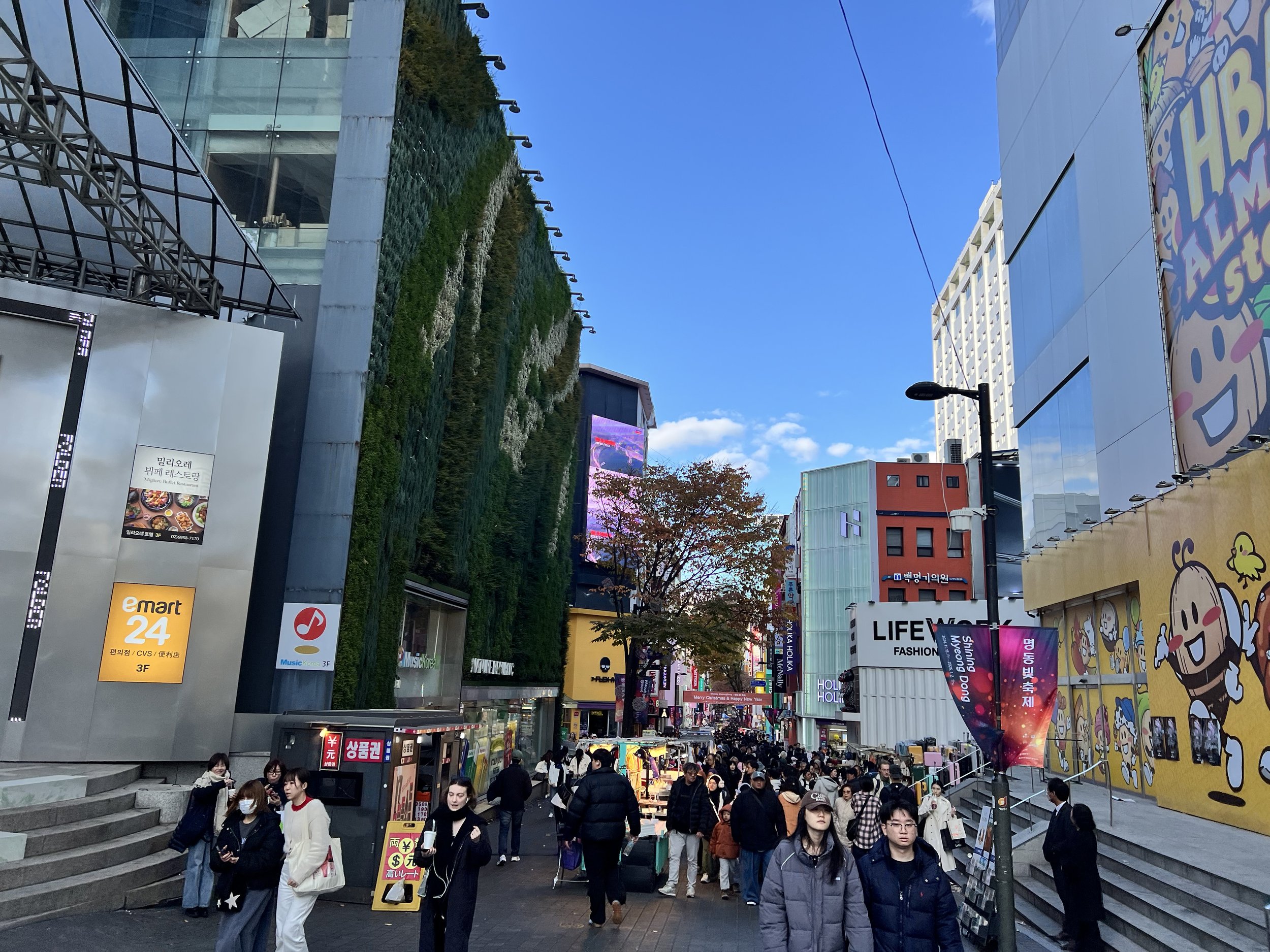 After my meal, I began descending the hill on foot and headed toward Myeongdong, one of Seoul’s most popular shopping and food districts. The moment I stepped onto its bustling streets, the energy shifted completely—bright lights, street vendors calling out, and the scent of sizzling food filling the air. It reminded me of Taiwan’s night markets, with crowds of locals and tourists enjoying endless rows of snacks and shops.