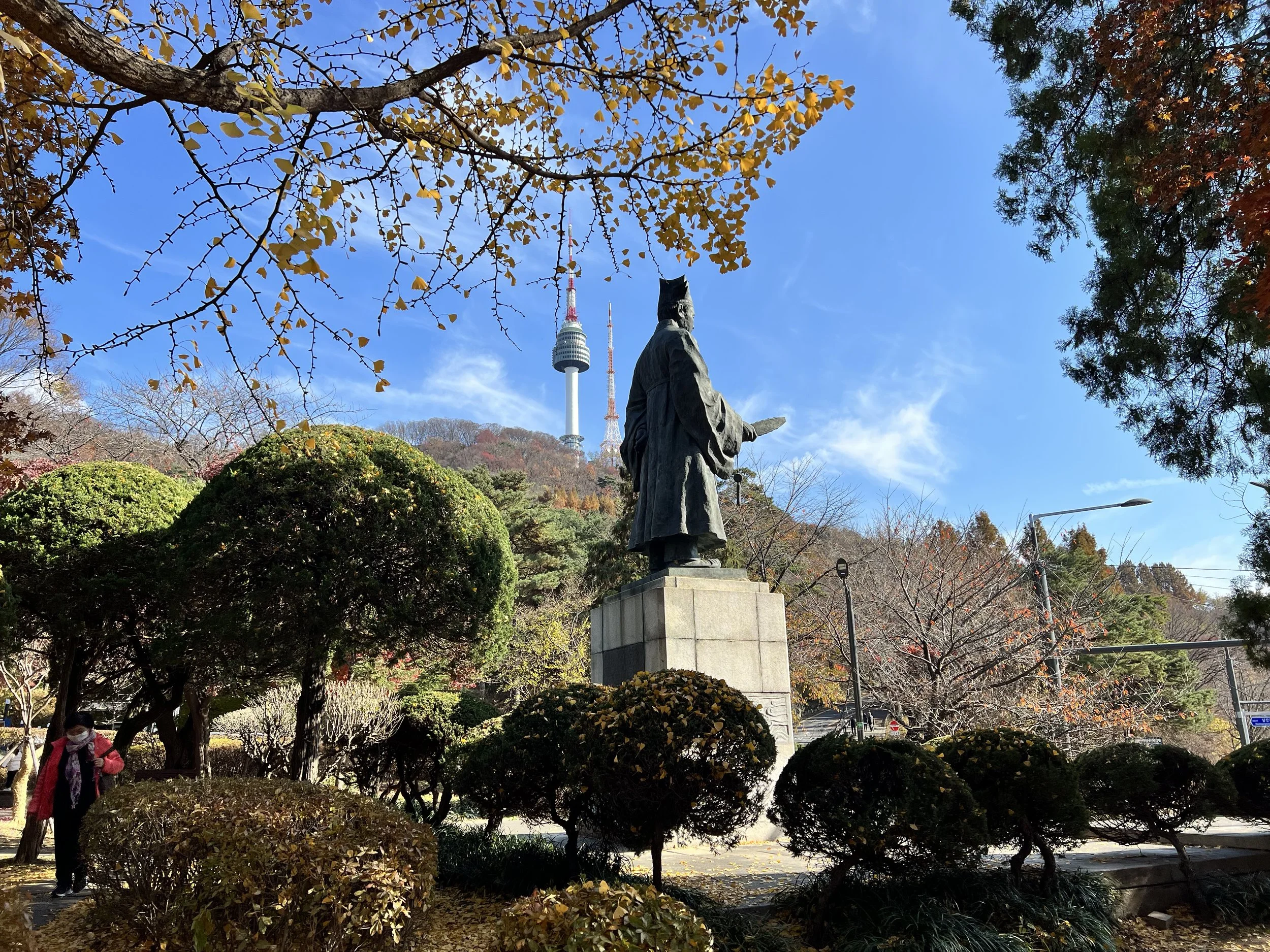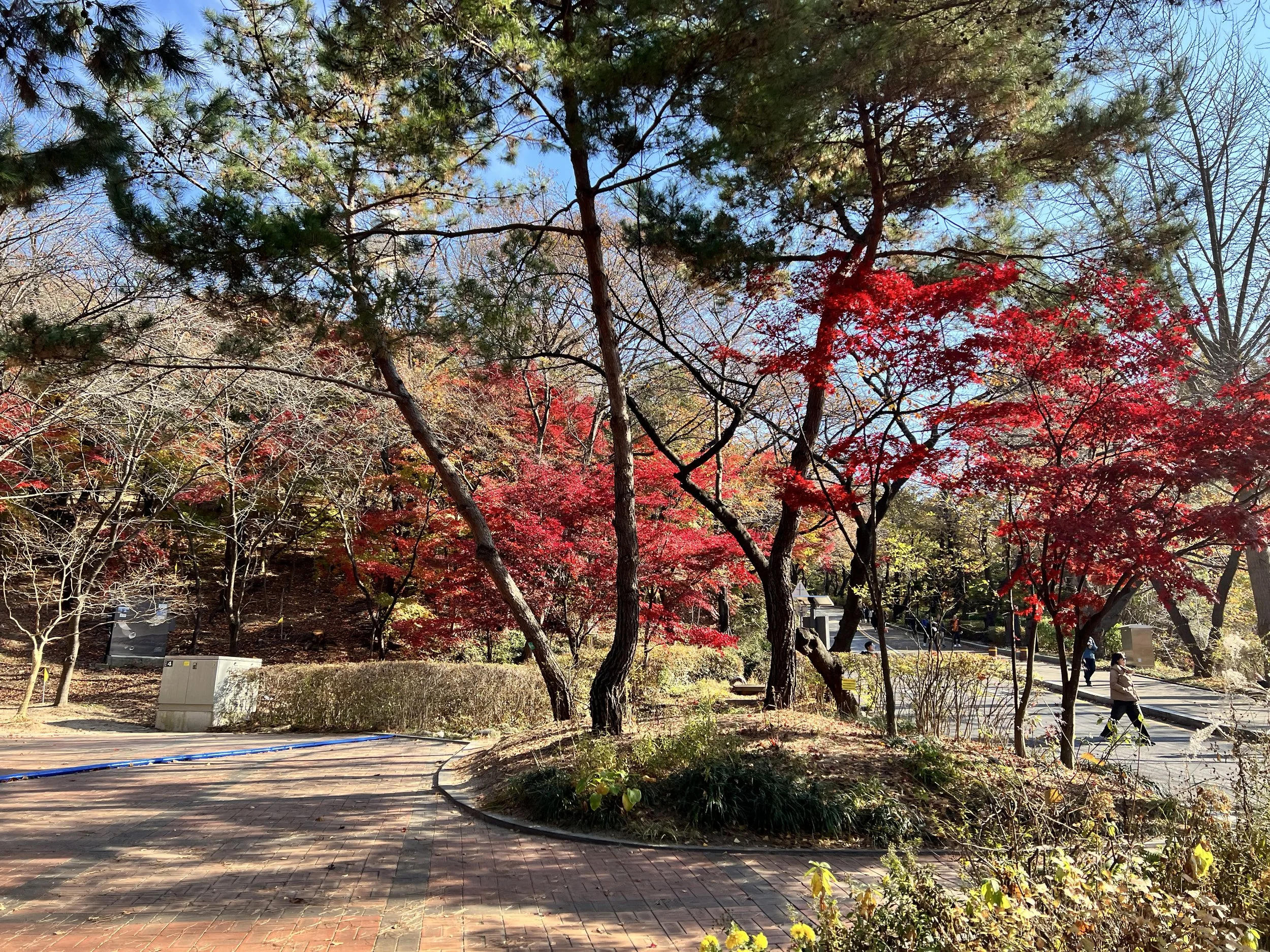 By the time I reached Namsan Park, the autumn colours were in full display. The maples had turned brilliant shades of red and orange, and sunlight filtered through the branches, creating a warm, golden glow. The uphill walk to the tower didn’t feel difficult at all—I kept stopping to admire the scenery and take photos.