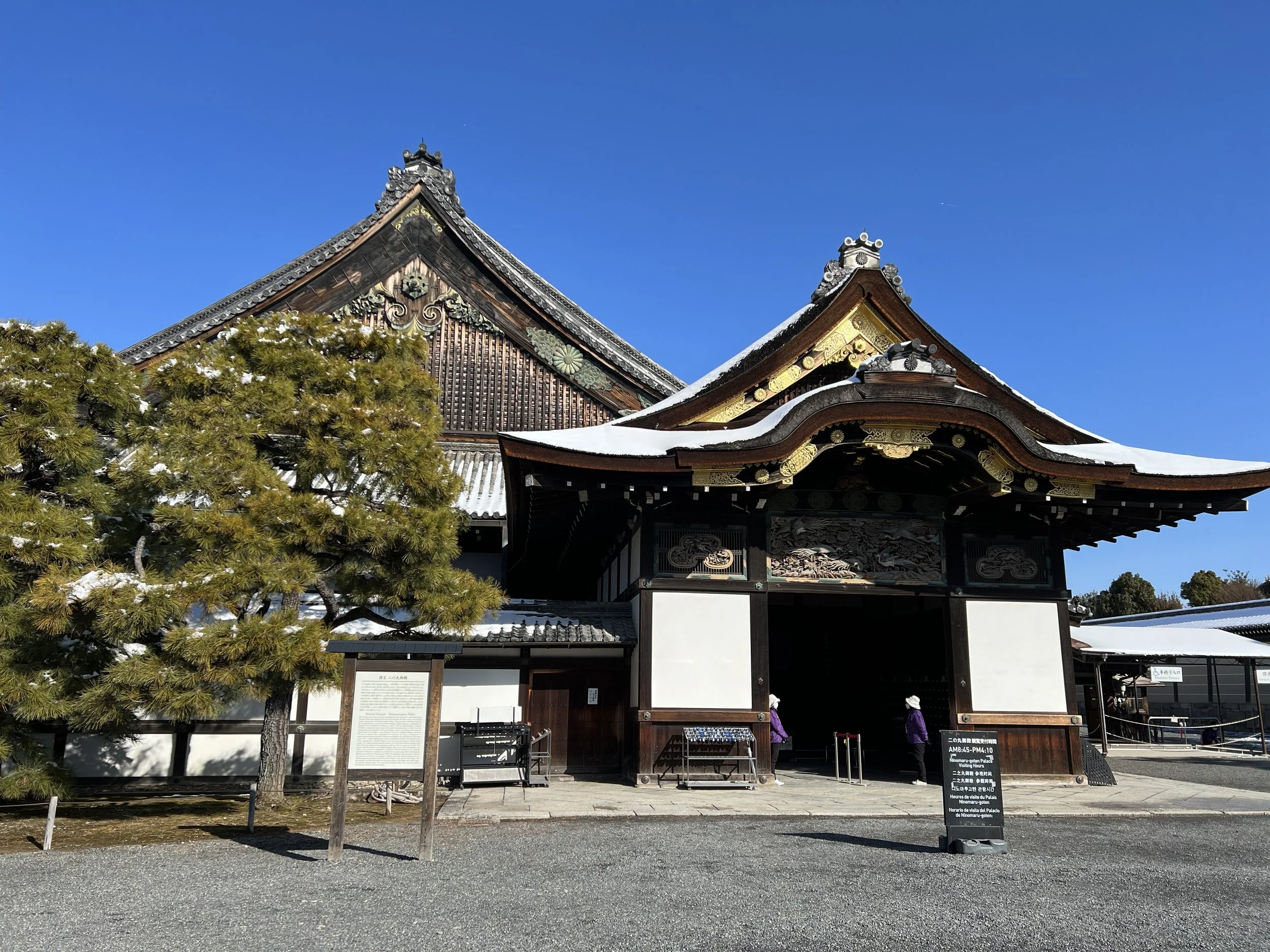 I arrived at Nijo Castle the day after a snowfall, which made the experience even more memorable. The palace entrance alone was breathtaking — the massive gate, built from hinoki cypress, is adorned with elaborate carvings of dragons, tigers, and floral motifs, accented with gold leaf symbolizing power and authority. Against the lingering snow and winter sunlight, it shimmered beautifully and instantly set the tone for the visit. It is, without question, one of the most impressive castle entrances I’ve seen in Japan.