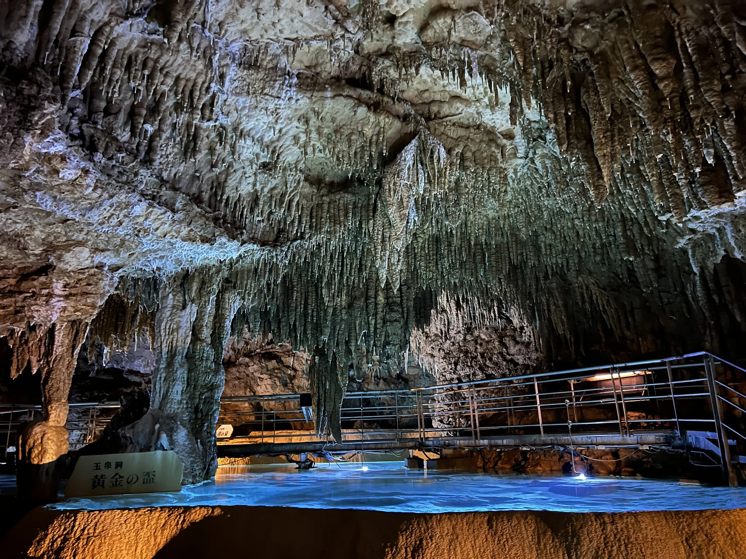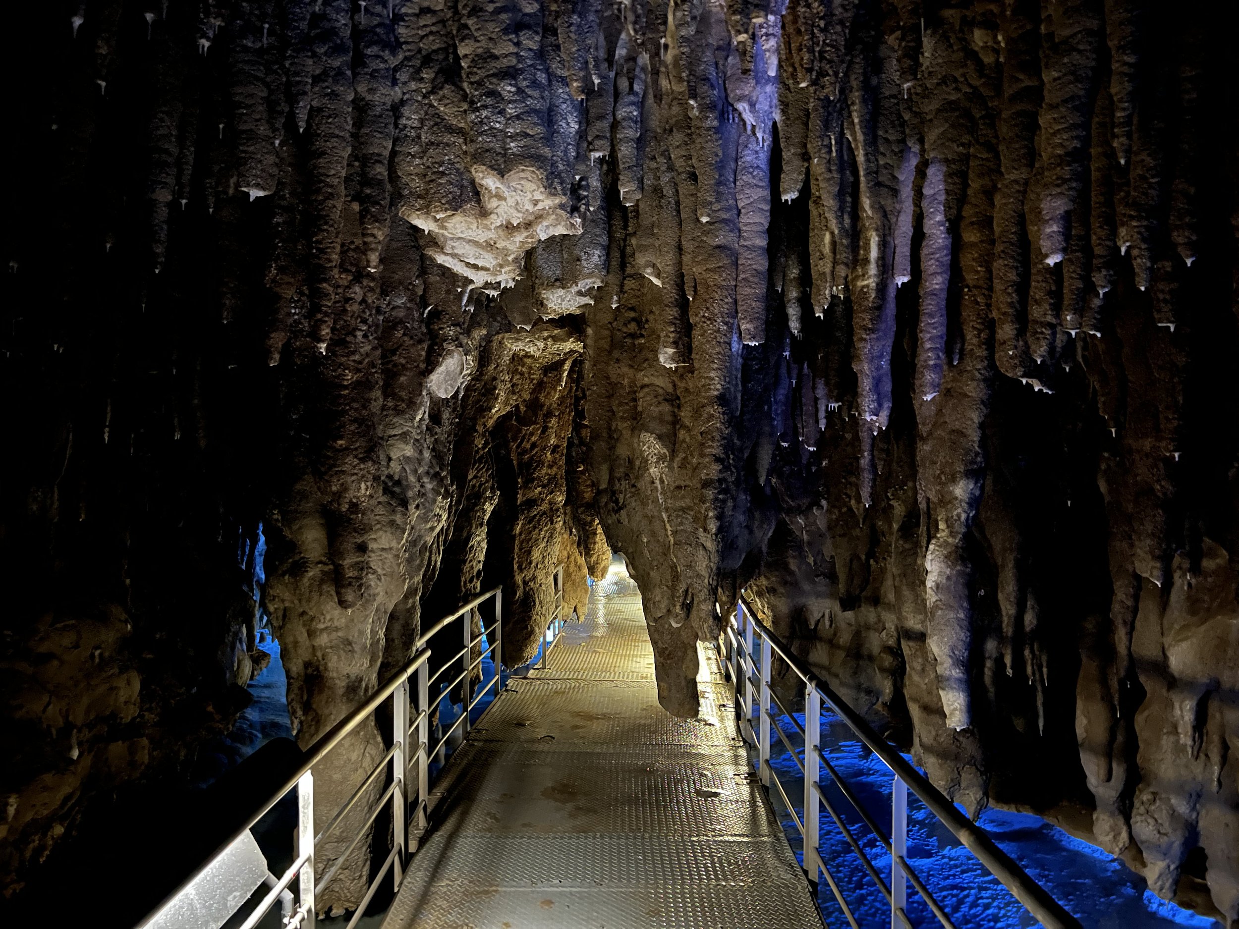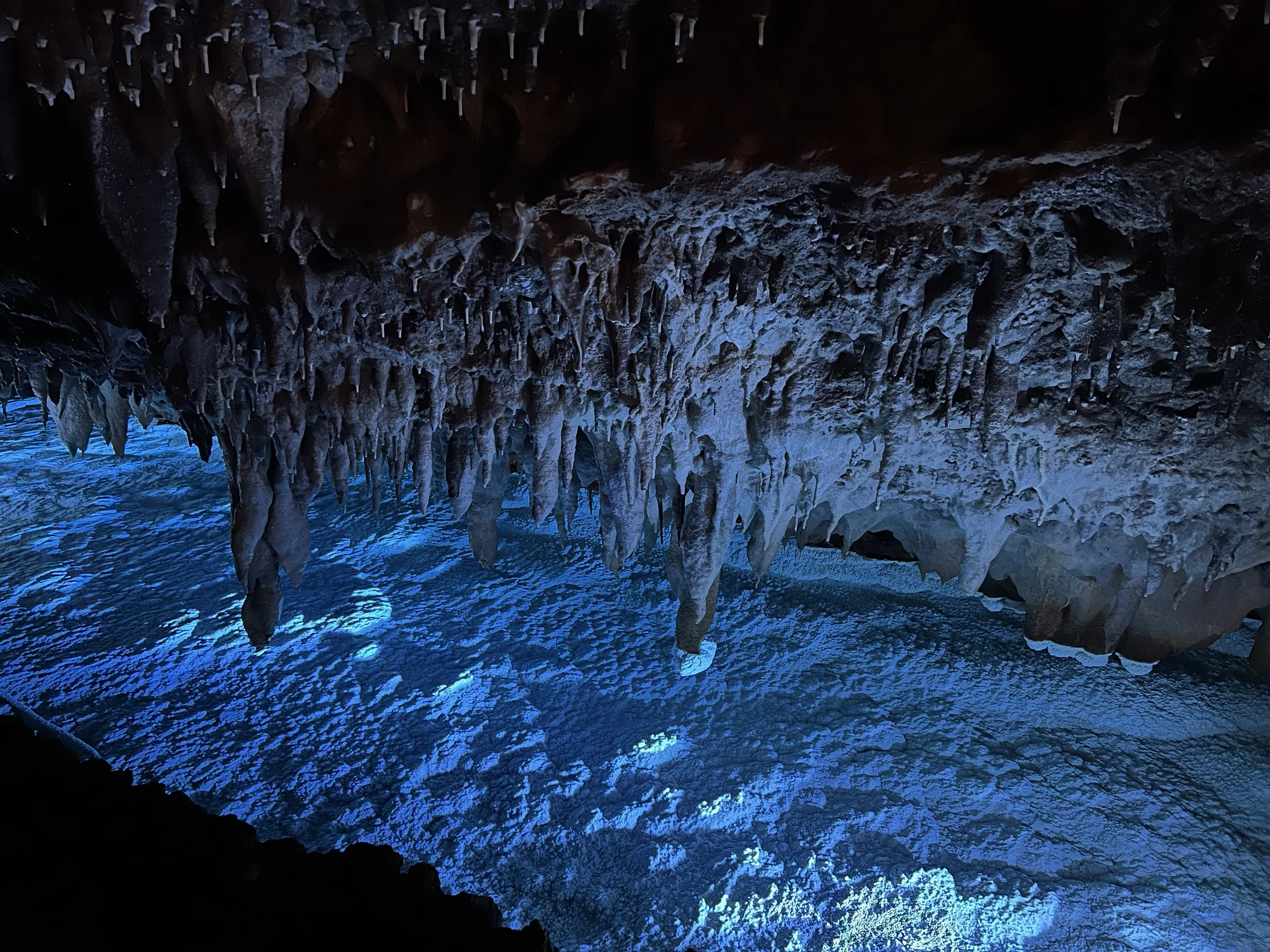 Inside, the cave was humid, but surprisingly more comfortable than the heat outside. Walking along the metal pathways, I was able to see stalactites and stalagmites up close. One of the most surreal sections featured illuminated blue pools reflecting the rock formations above. With the lighting and mineral formations combined, it felt almost otherworldly.