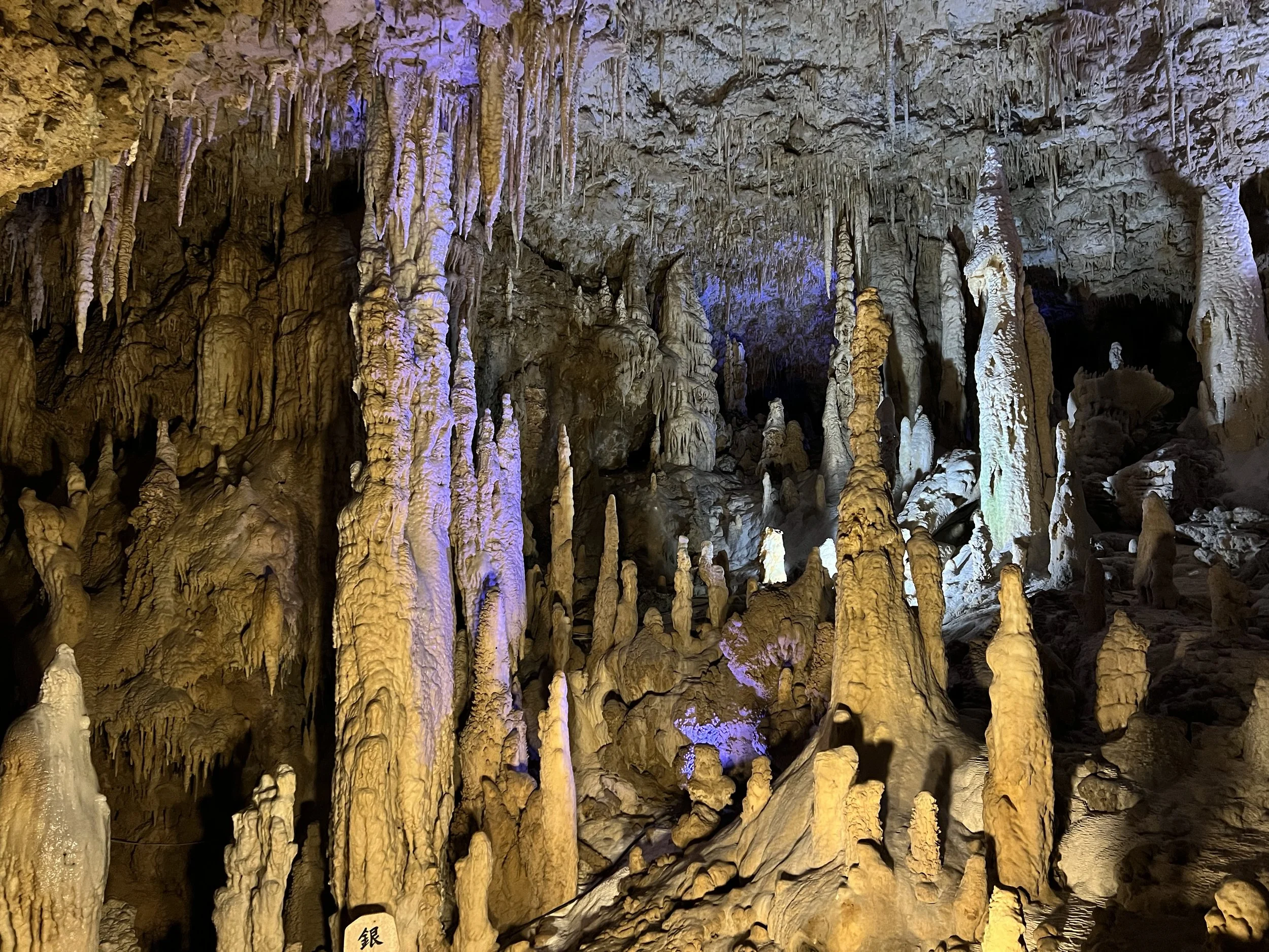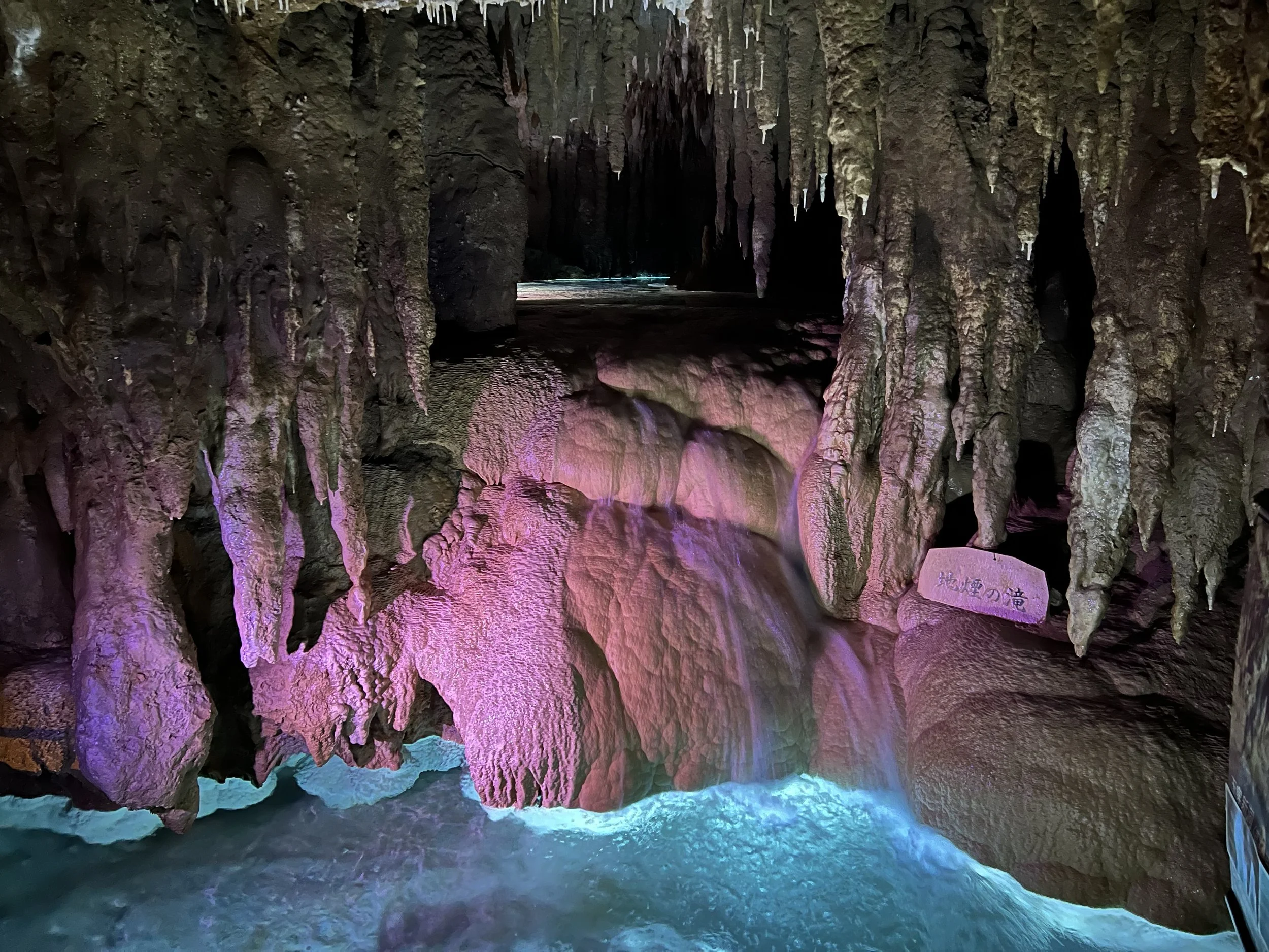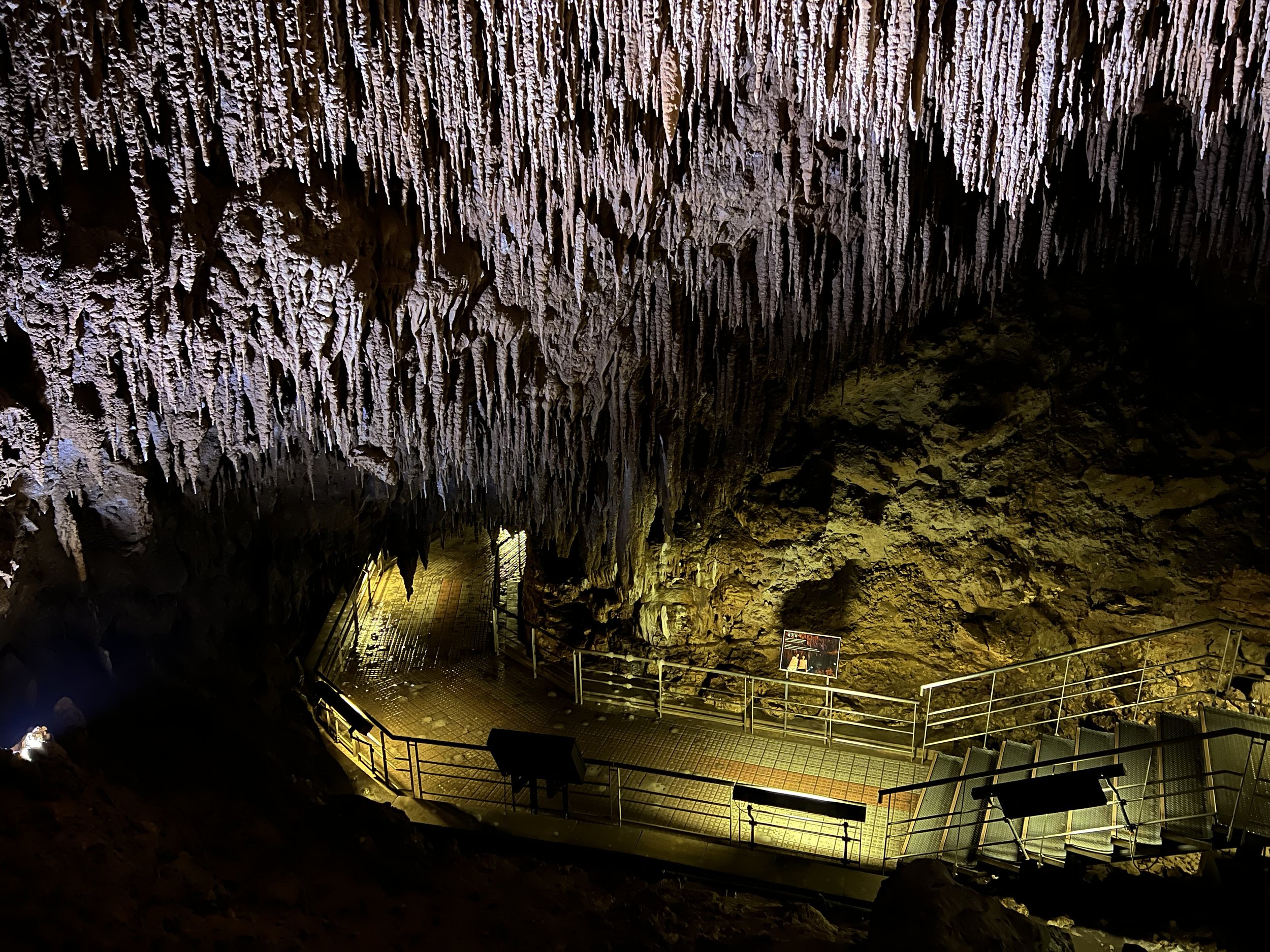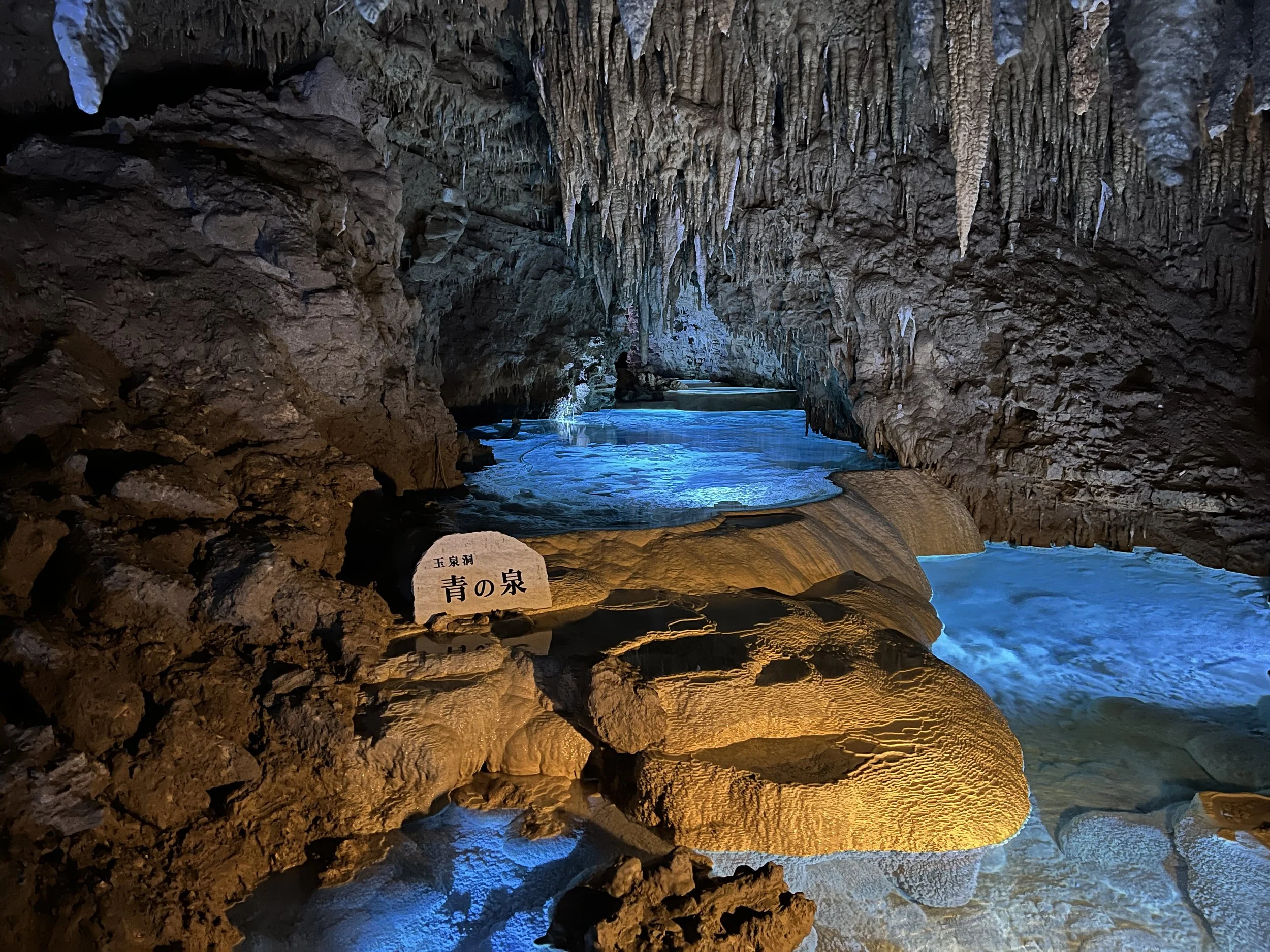 Inside, the cave was humid, but surprisingly more comfortable than the heat outside. Walking along the metal pathways, I was able to see stalactites and stalagmites up close. One of the most surreal sections featured illuminated blue pools reflecting the rock formations above. With the lighting and mineral formations combined, it felt almost otherworldly.