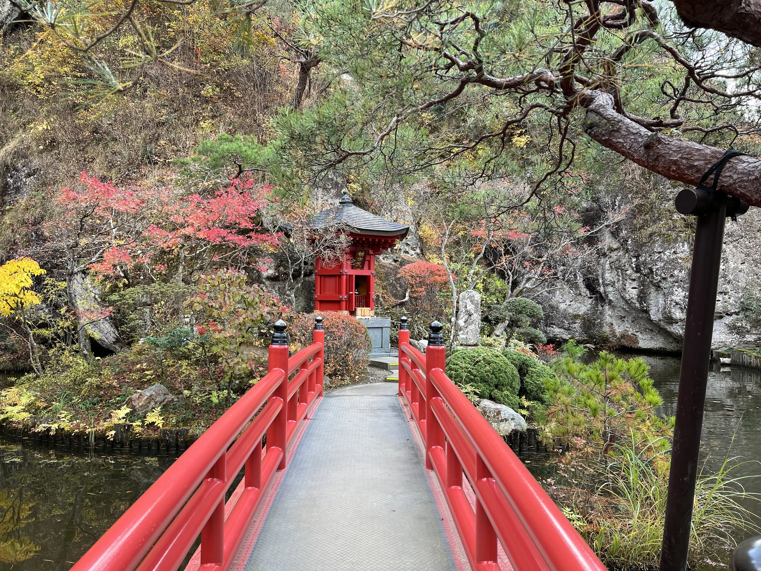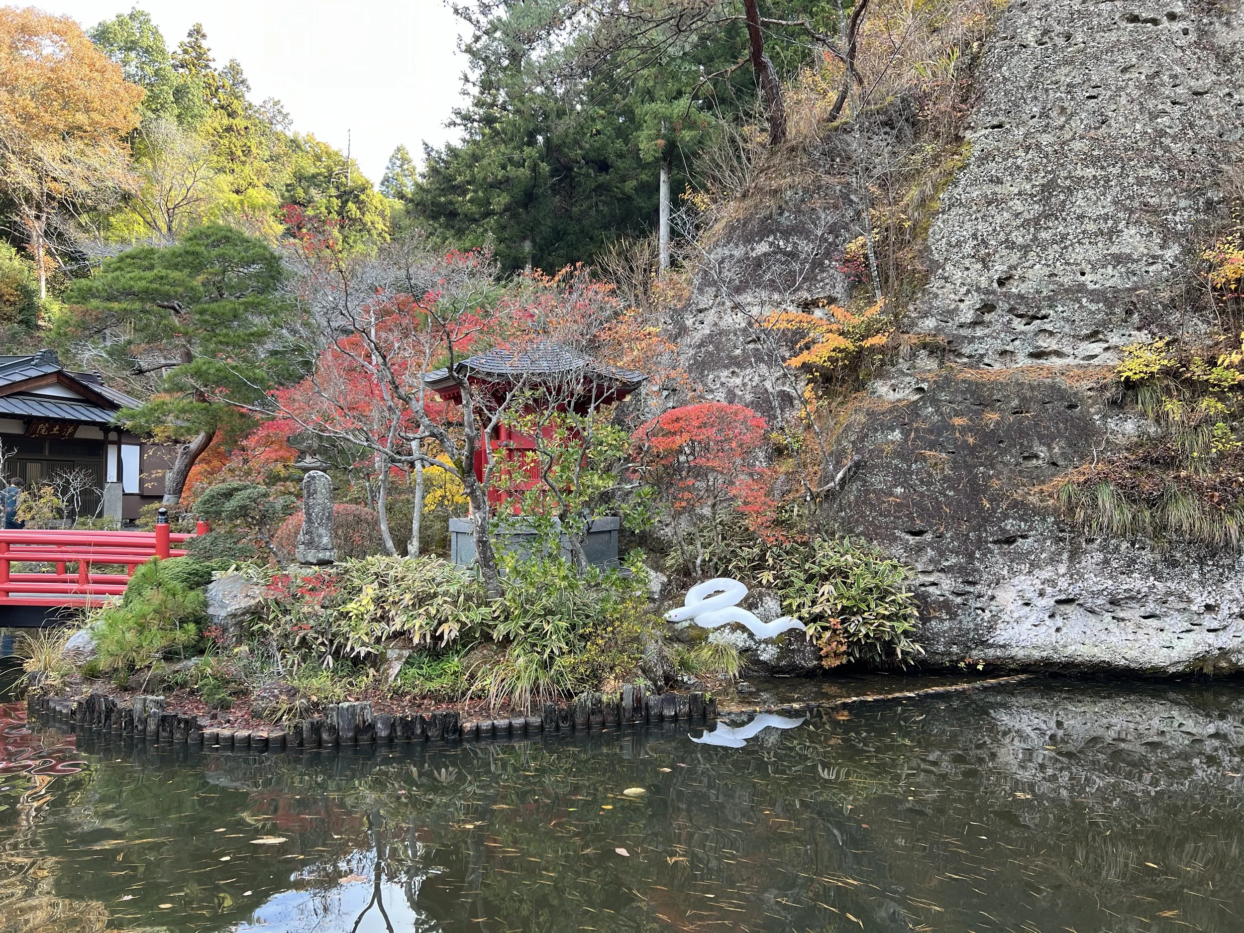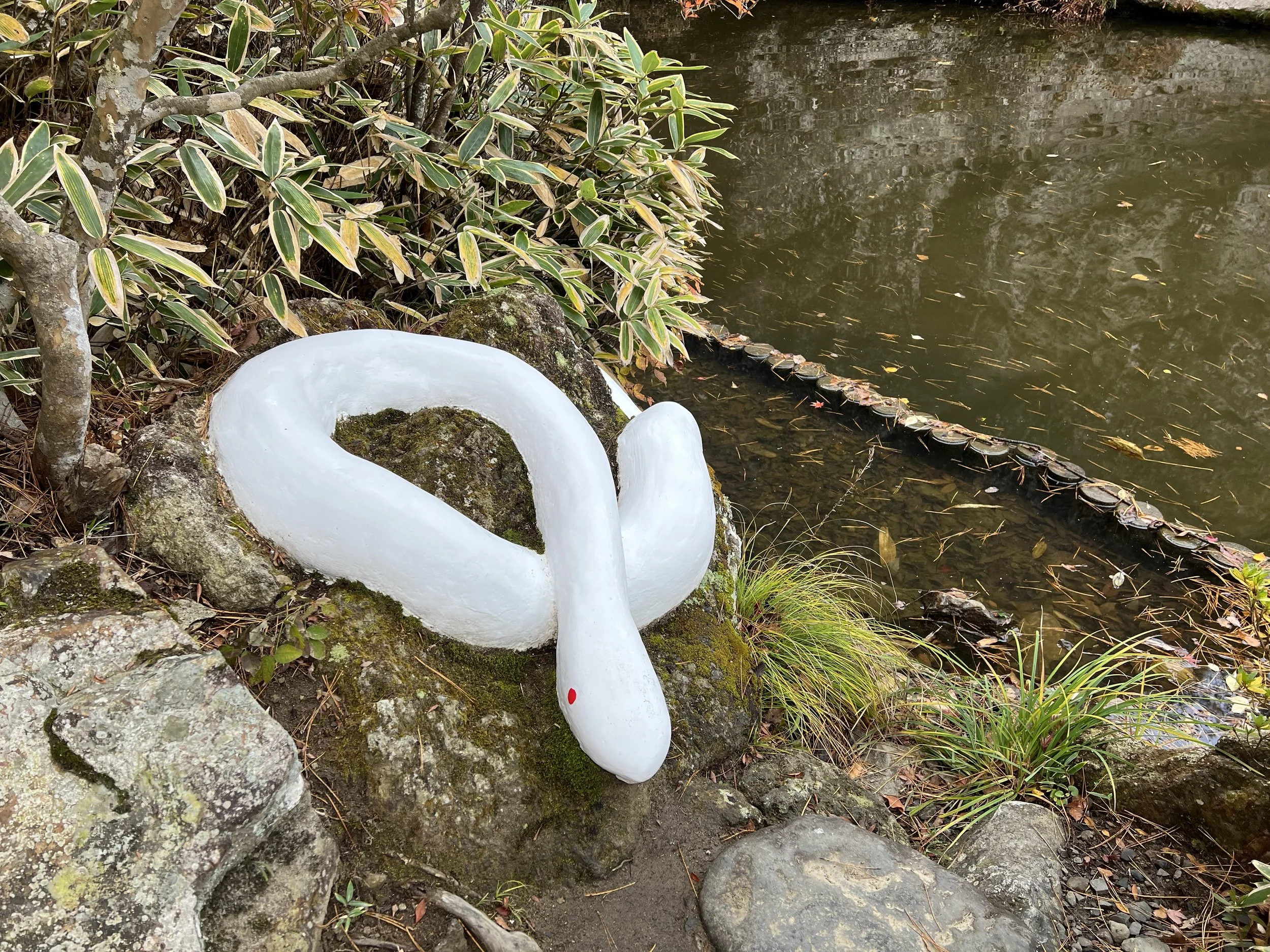 The interior didn’t take long to explore, but it left a strong impression. Exiting the sanctuary, I made my way into the garden area. The garden features a small pond crossed by a red bridge leading to minor shrines, along with repeated motifs of white snakes. I learned that these snakes are tied to a local legend in which a poisonous serpent was subdued by Kobo Daishi and transformed into a benevolent guardian associated with Benzaiten, the goddess of eloquence, wealth, and wisdom. Today, people come here to pray for prosperity and good fortune.