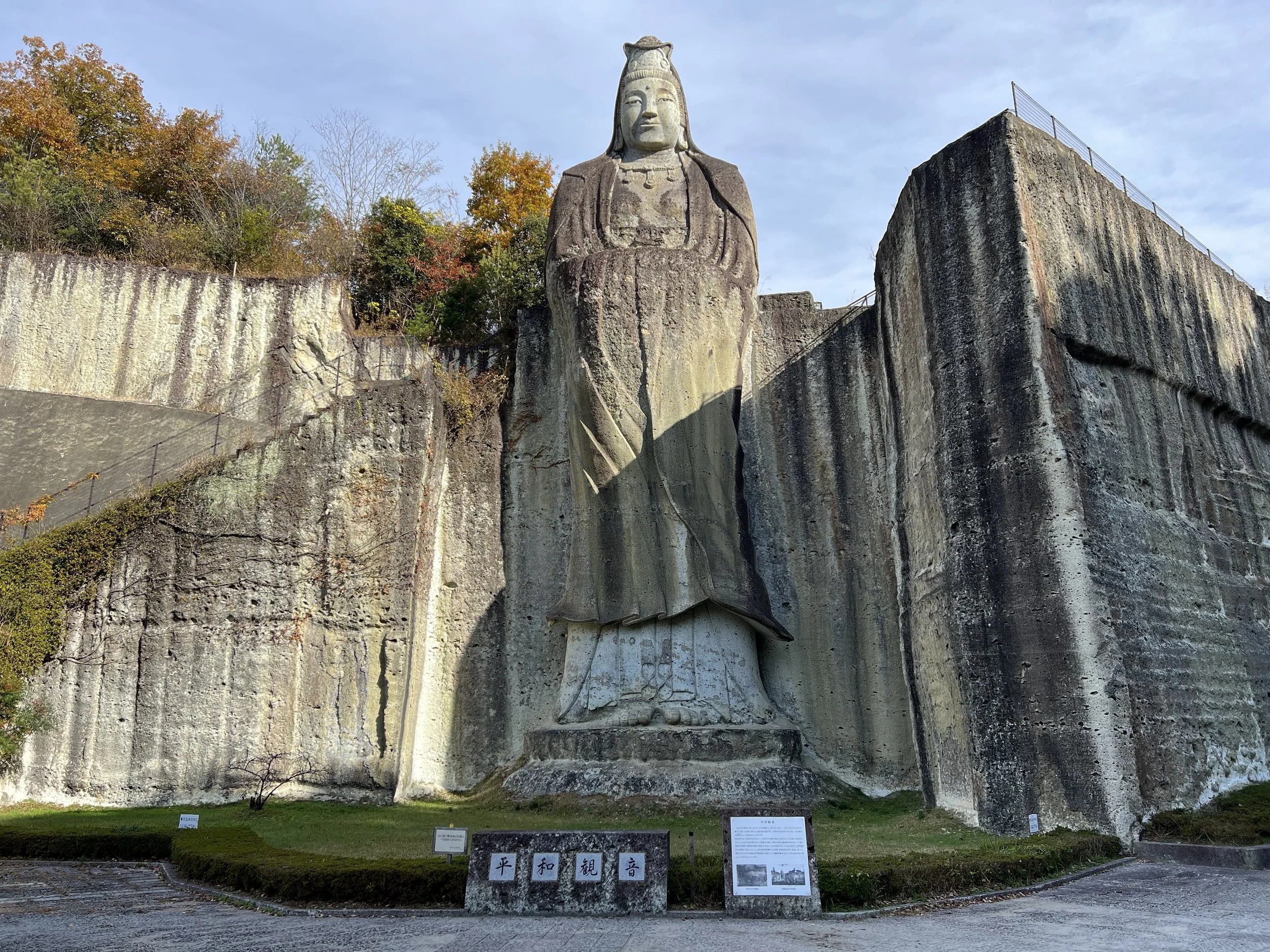 At the far end of the garden is the trailhead to Mount Otomeyama. I had planned to hike up, having read that the views from the top are excellent, but the trail was closed during my visit. After leaving the temple grounds, staff pointed me toward the nearby Heiwa Kannon, a massive 27-metre-tall stone statue located within Oya Park. A small volunteer station nearby provides historical context about the statue, which was carved as a symbol of peace following the Second World War.