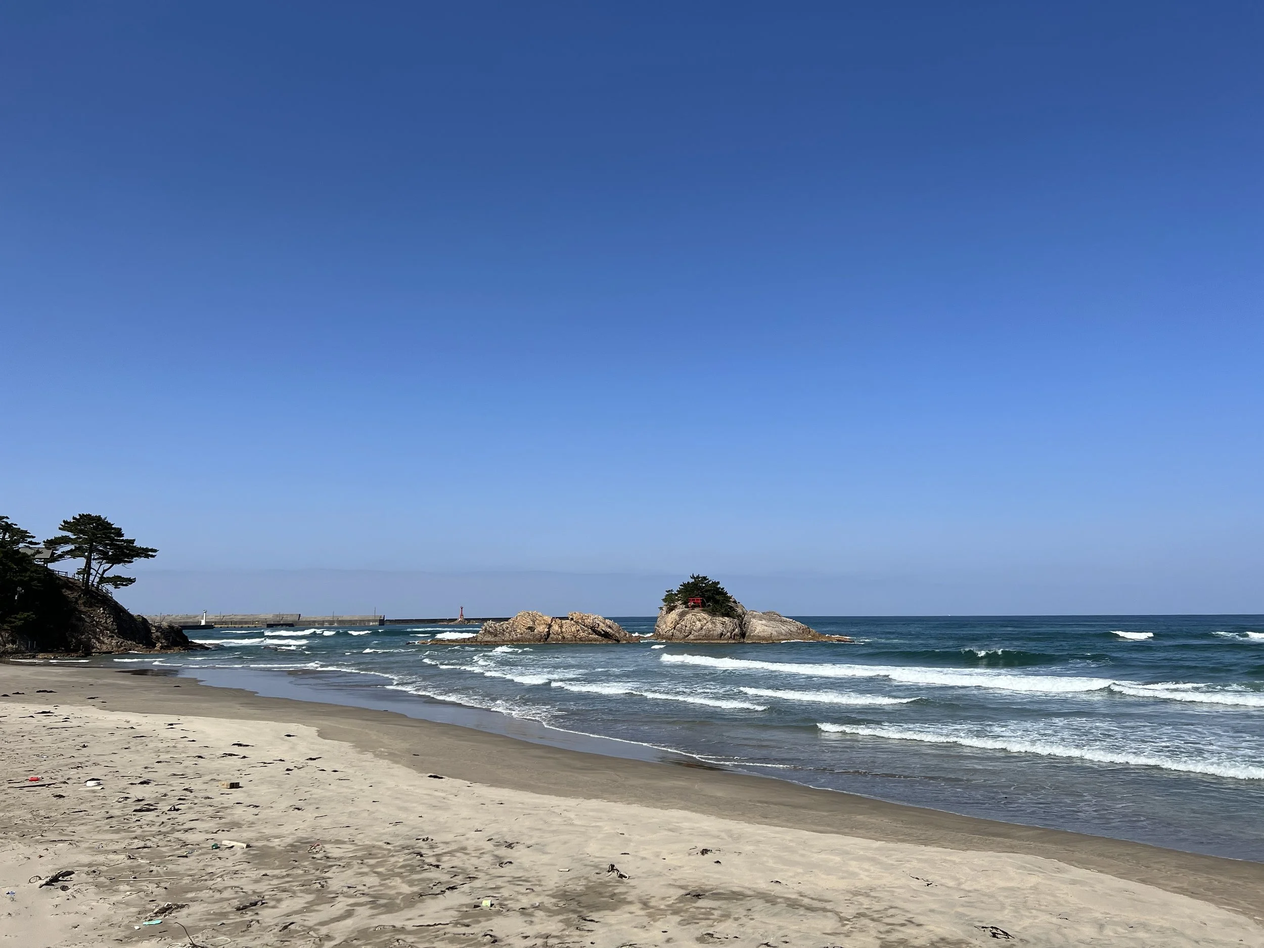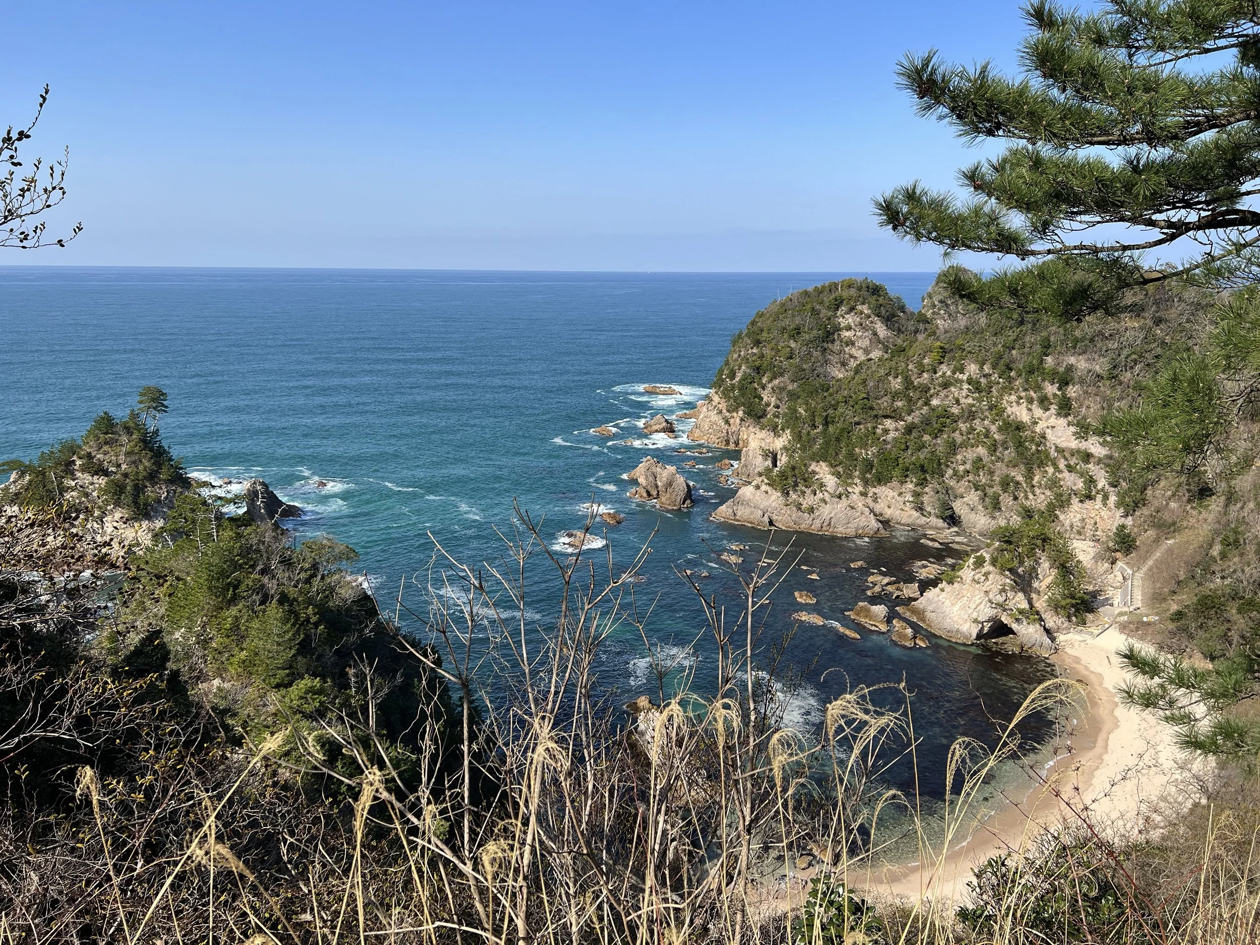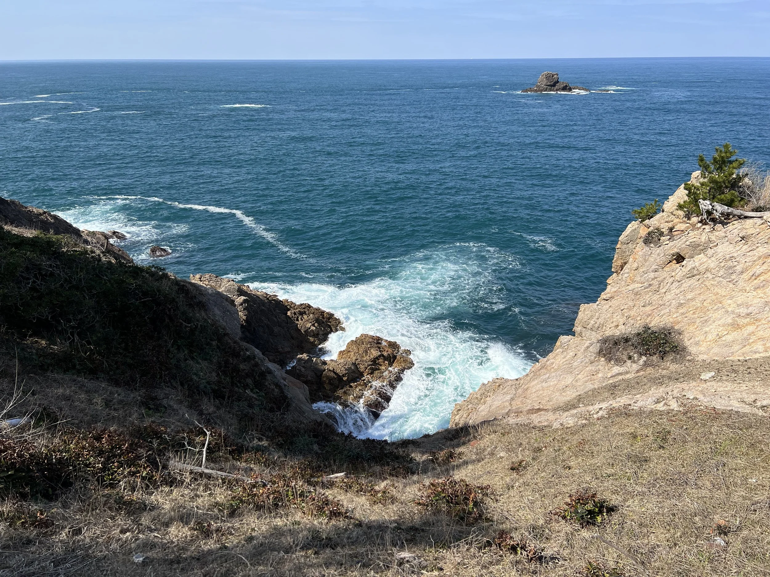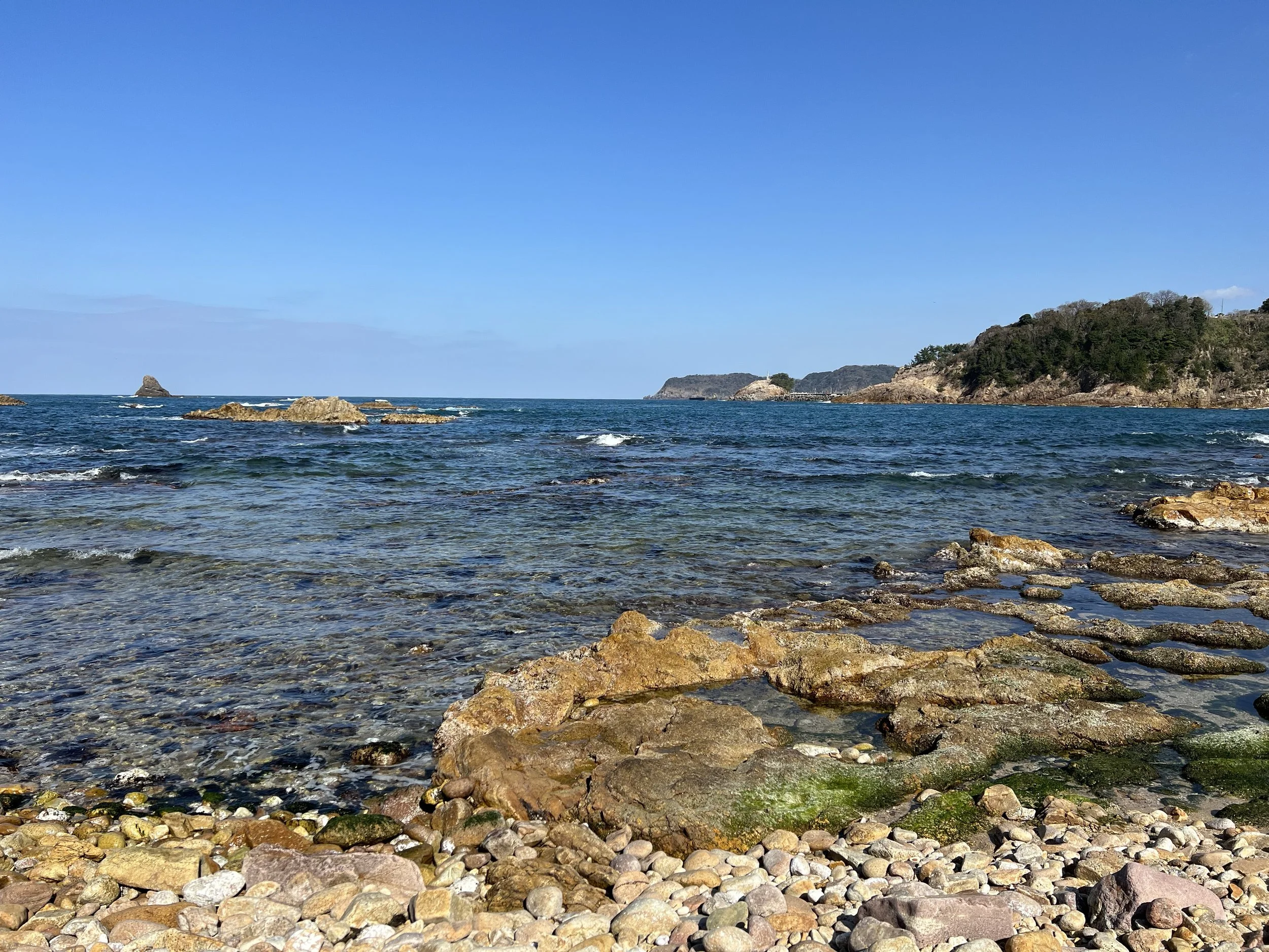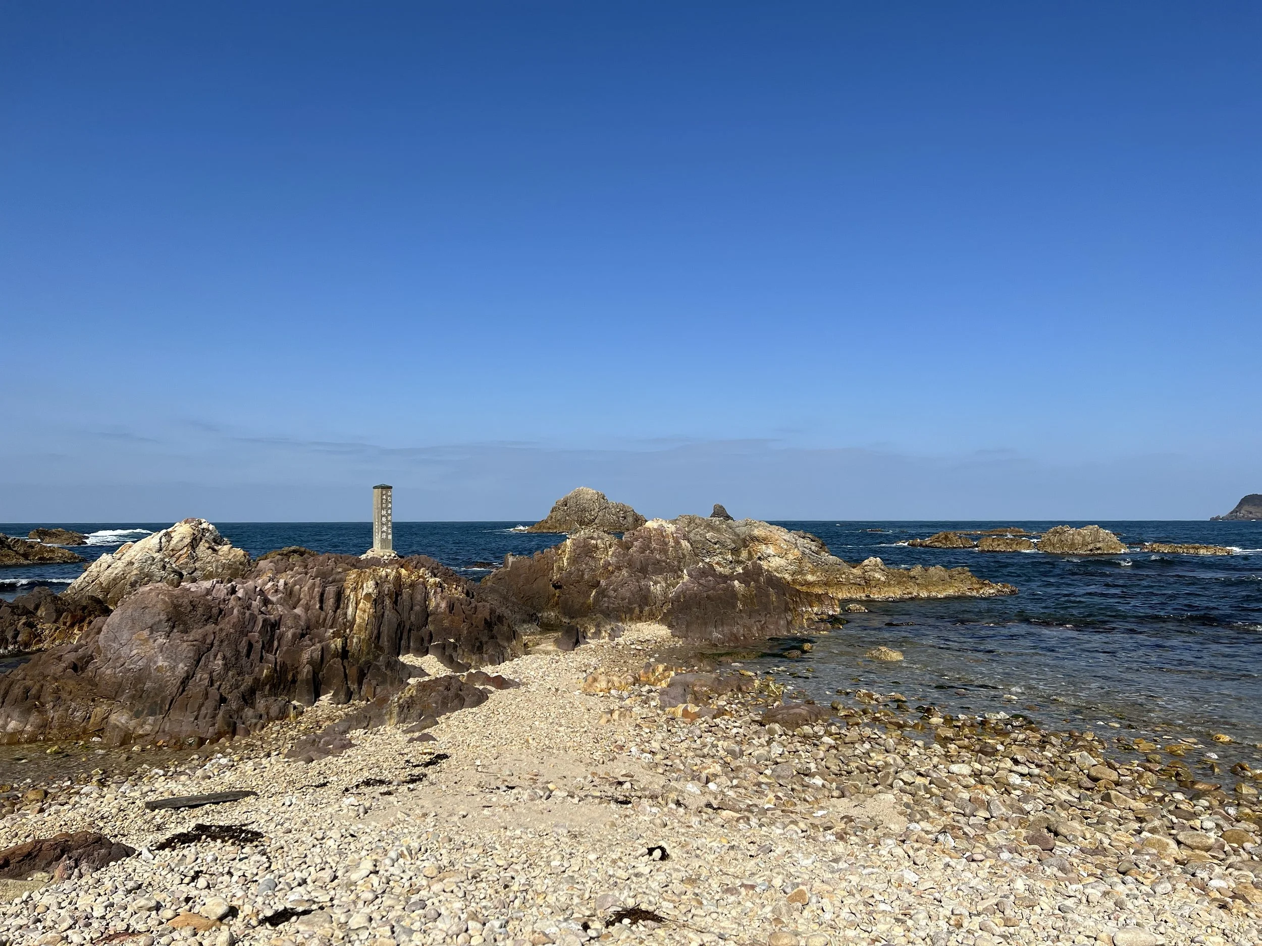 My next major stop was Shirawara Observation Deck. Unlike the sandy beaches earlier on the route, Shirawara Beach is made up of fist-sized, smooth granite stones. These stones are found throughout the area and are believed to have formed more than 60 million years ago, back when the Japanese islands were still part of the Asian continent. After taking in the view from above, I carefully descended the long staircase down to the beach itself. Walking on the rounded stones was challenging, but taking it slow, I eventually reached the water’s edge. Sitting there alone, listening to the waves and watching the crystal-clear water, felt incredibly serene. In summer, this area is popular with divers, as sunlight filtering through the clear water and seaweed reveals abundant marine life beneath the surface.