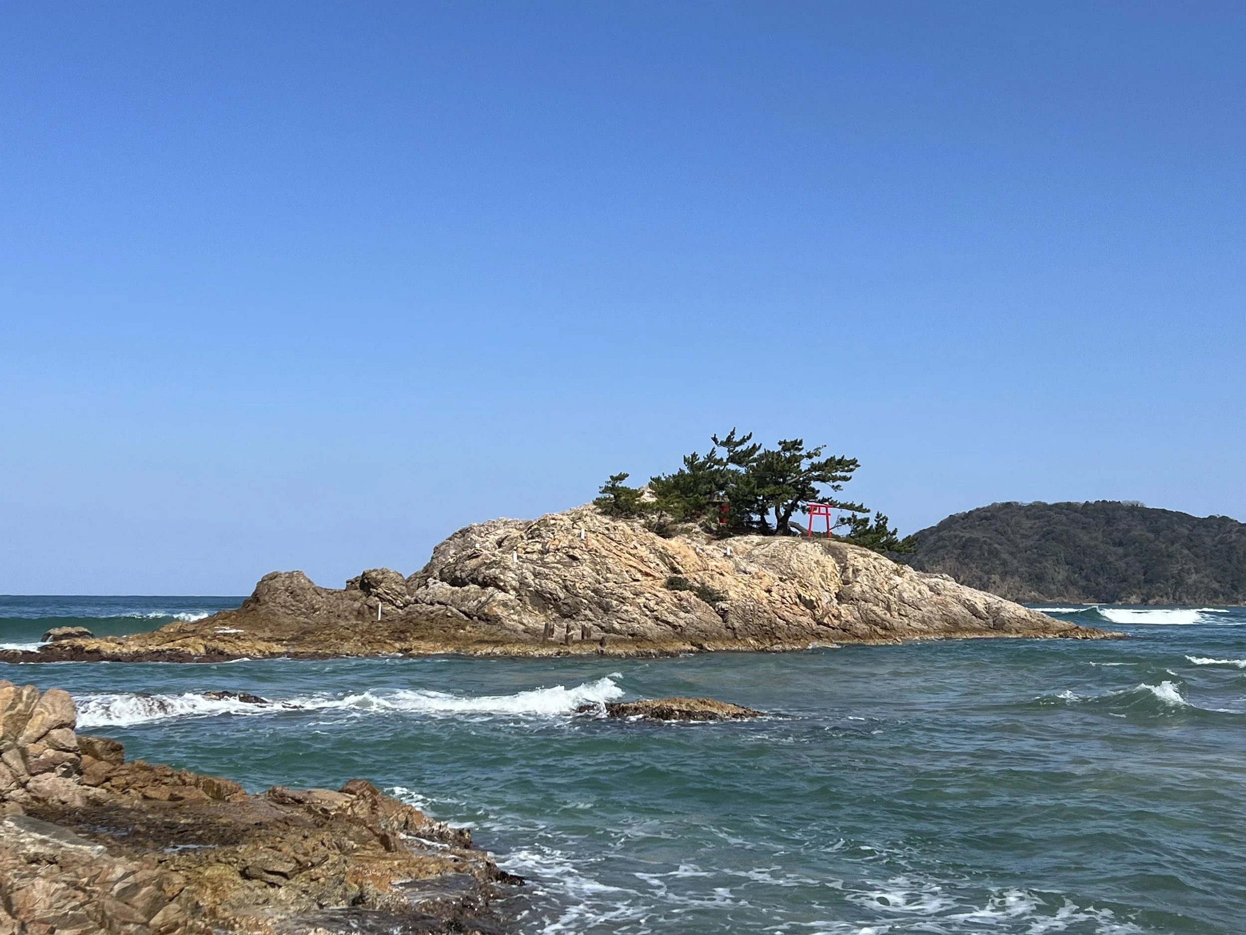 I took the bus from the Tottori Sand Dunes area toward Uradome Coast, where I planned to begin the hike. When I arrived, the beach was quiet and nearly empty, the winter air crisp and clear. I took a few moments to take in the coastline before starting westward along the trail. My first stop was an observatory at the far end of the coast overlooking Mukojima Ebisu Shrine—a tiny rock island topped with a small torii gate and windswept pine trees. Set against the deep blue of the Sea of Japan, it was a striking and peaceful sight.
