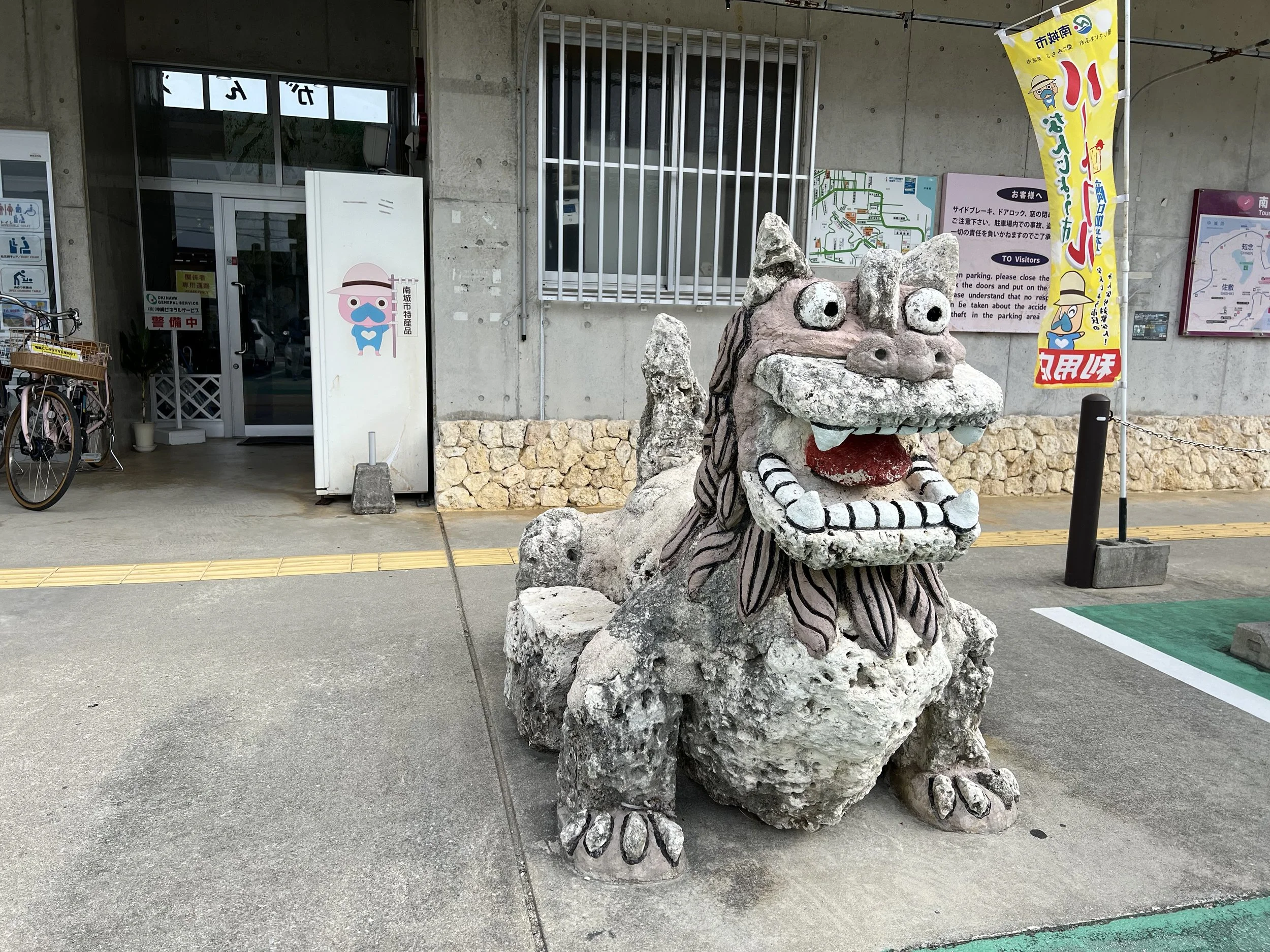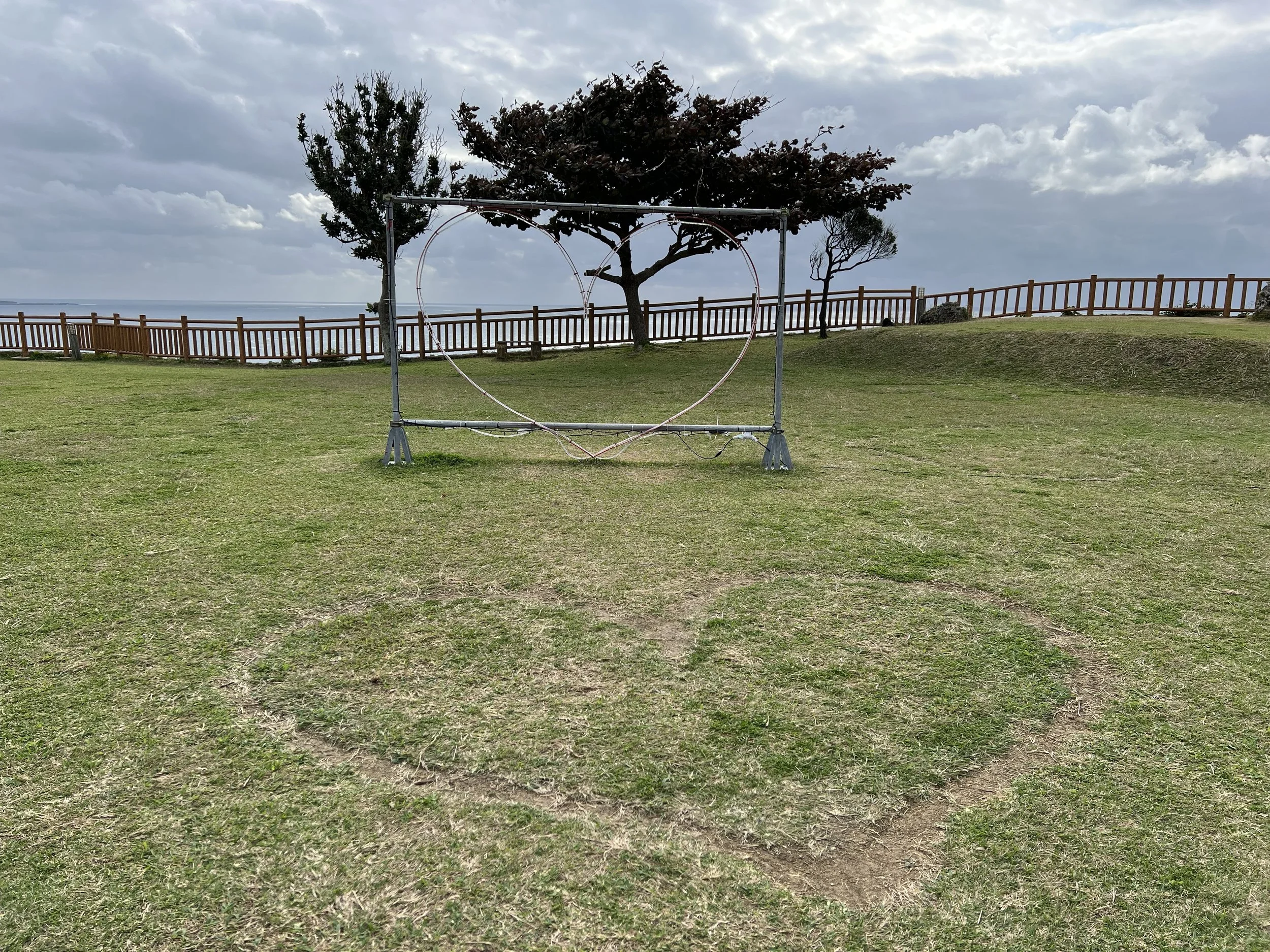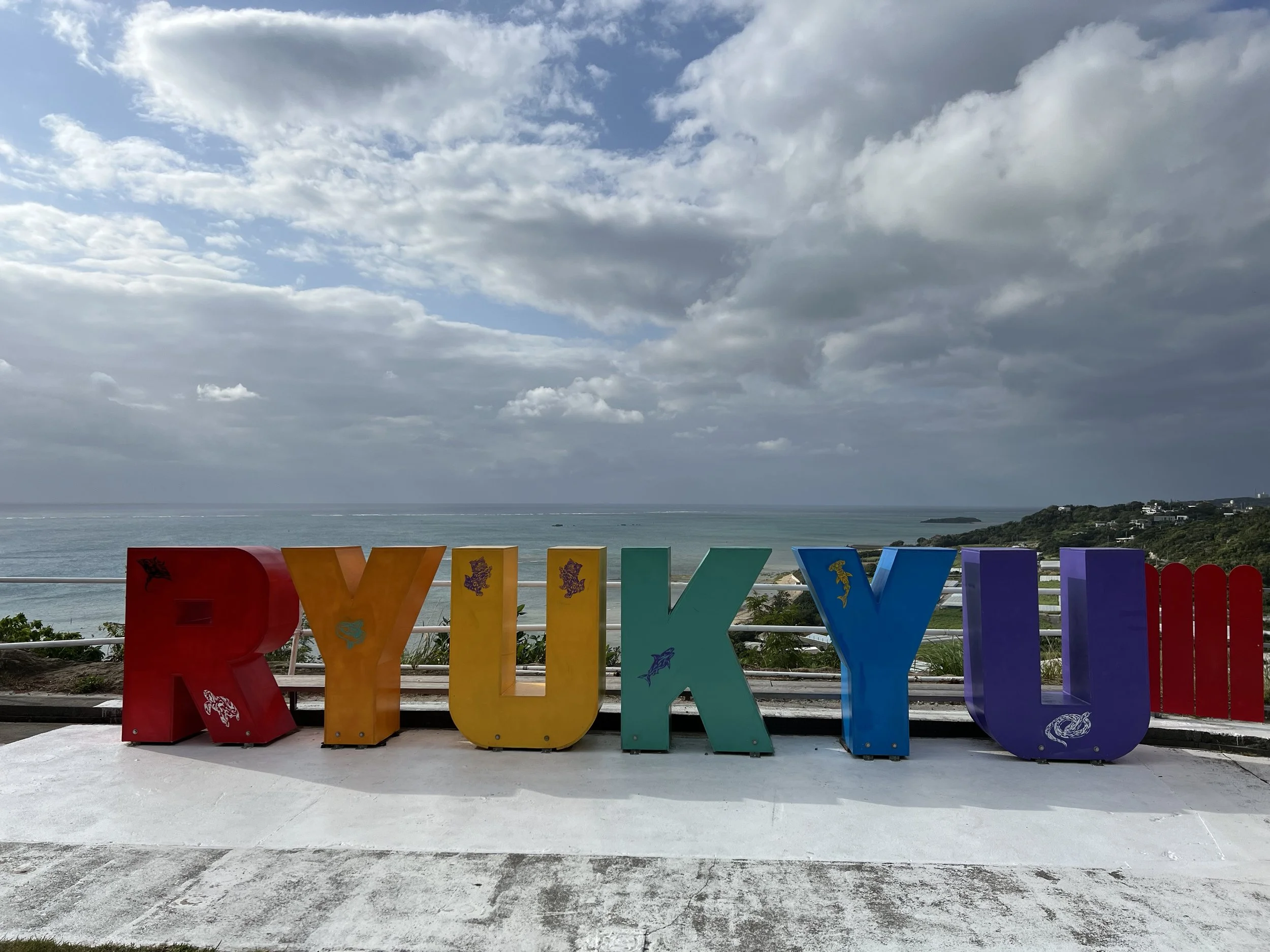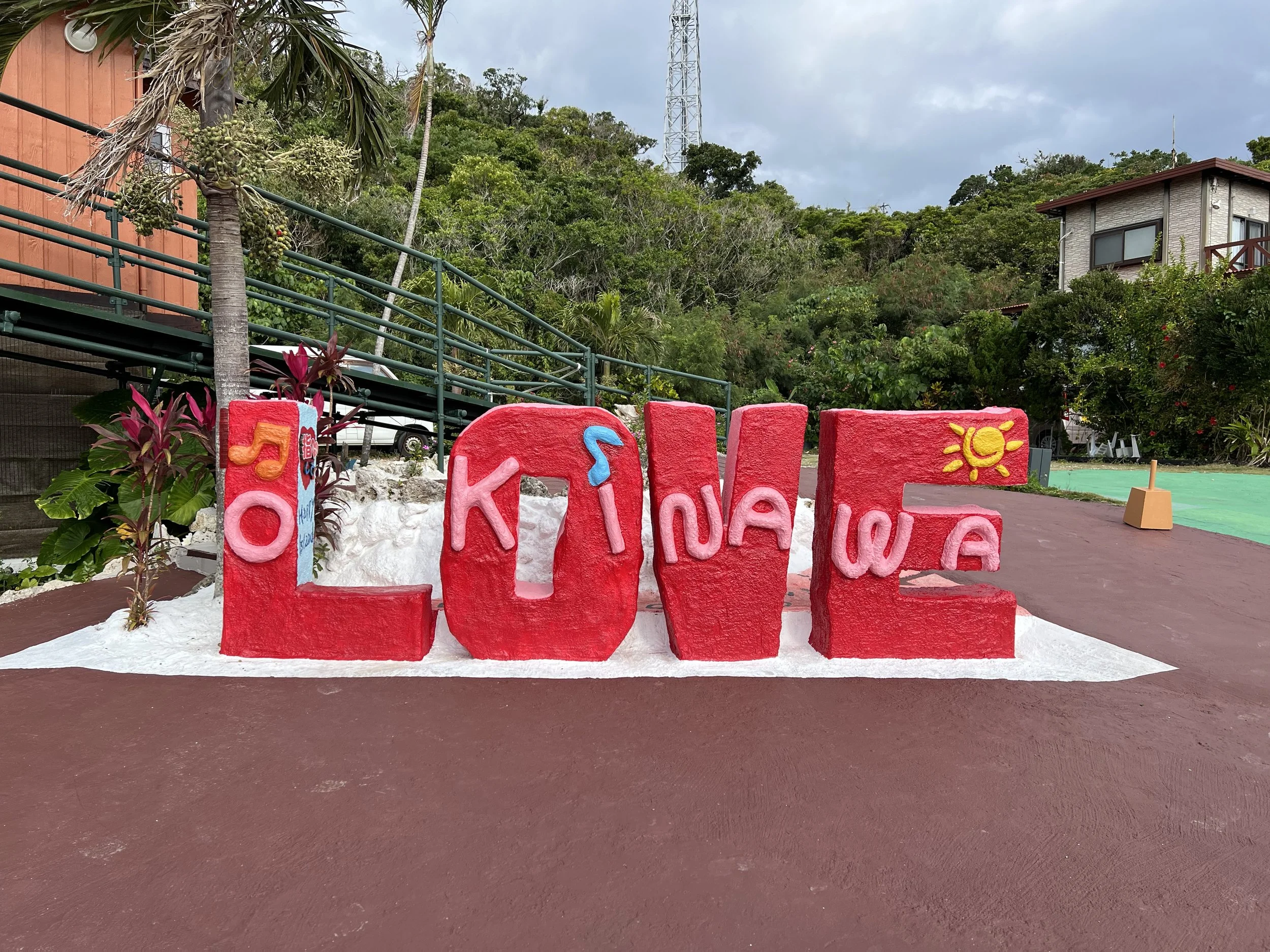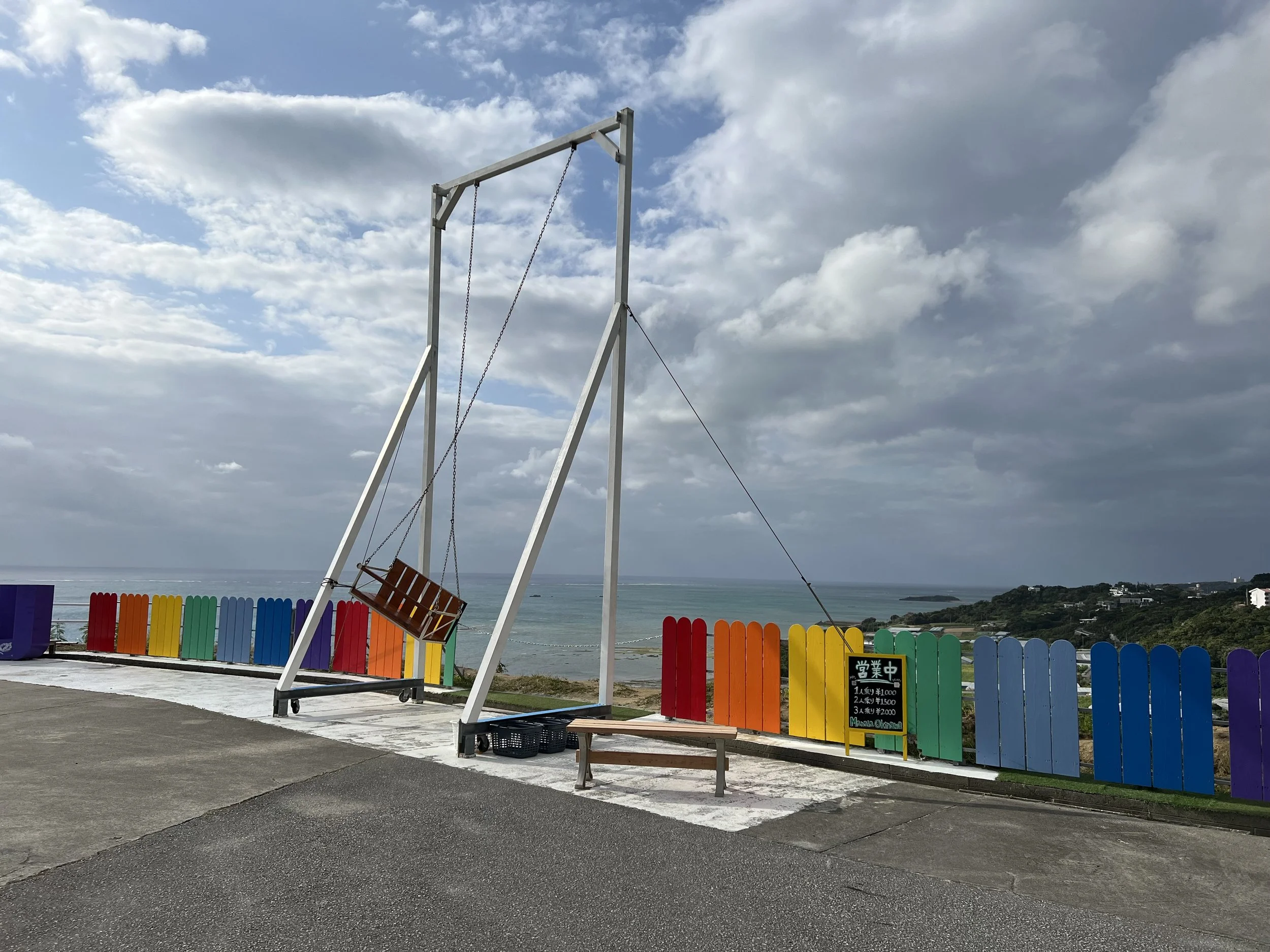 After exploring the sacred grounds, I stopped at a nearby viewpoint featuring a large swing with a Ryukyu sign. There is a fee to use the swing, but I was content just taking photos. From there, I walked a few minutes to Cape Chinen Park. The ocean views are stunning — cliffs drop dramatically into the water, and you can see the sweeping curve of the Nirai Kanai Bridge in the distance. Decorative heart installations dotted the park, adding a playful contrast to the solemnity of the sacred site.