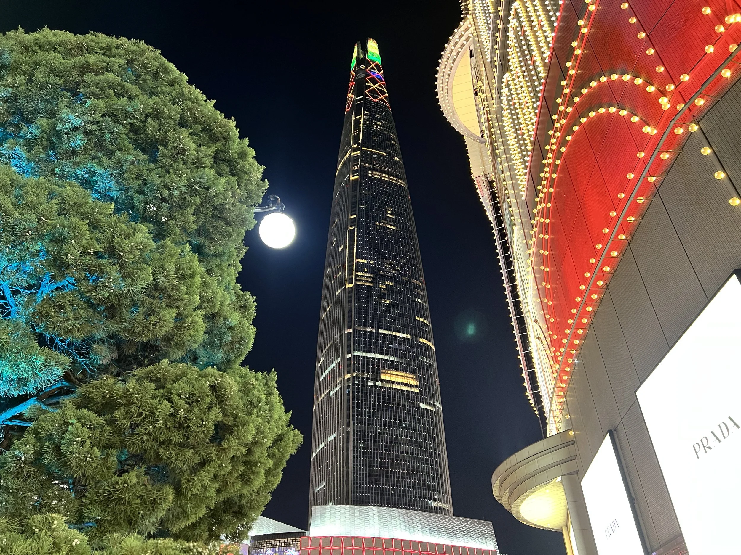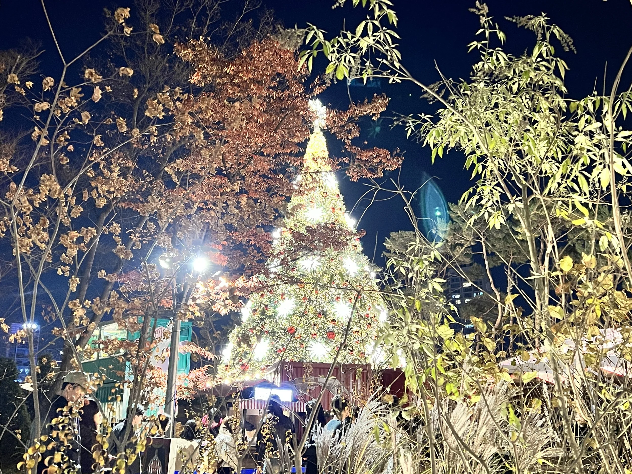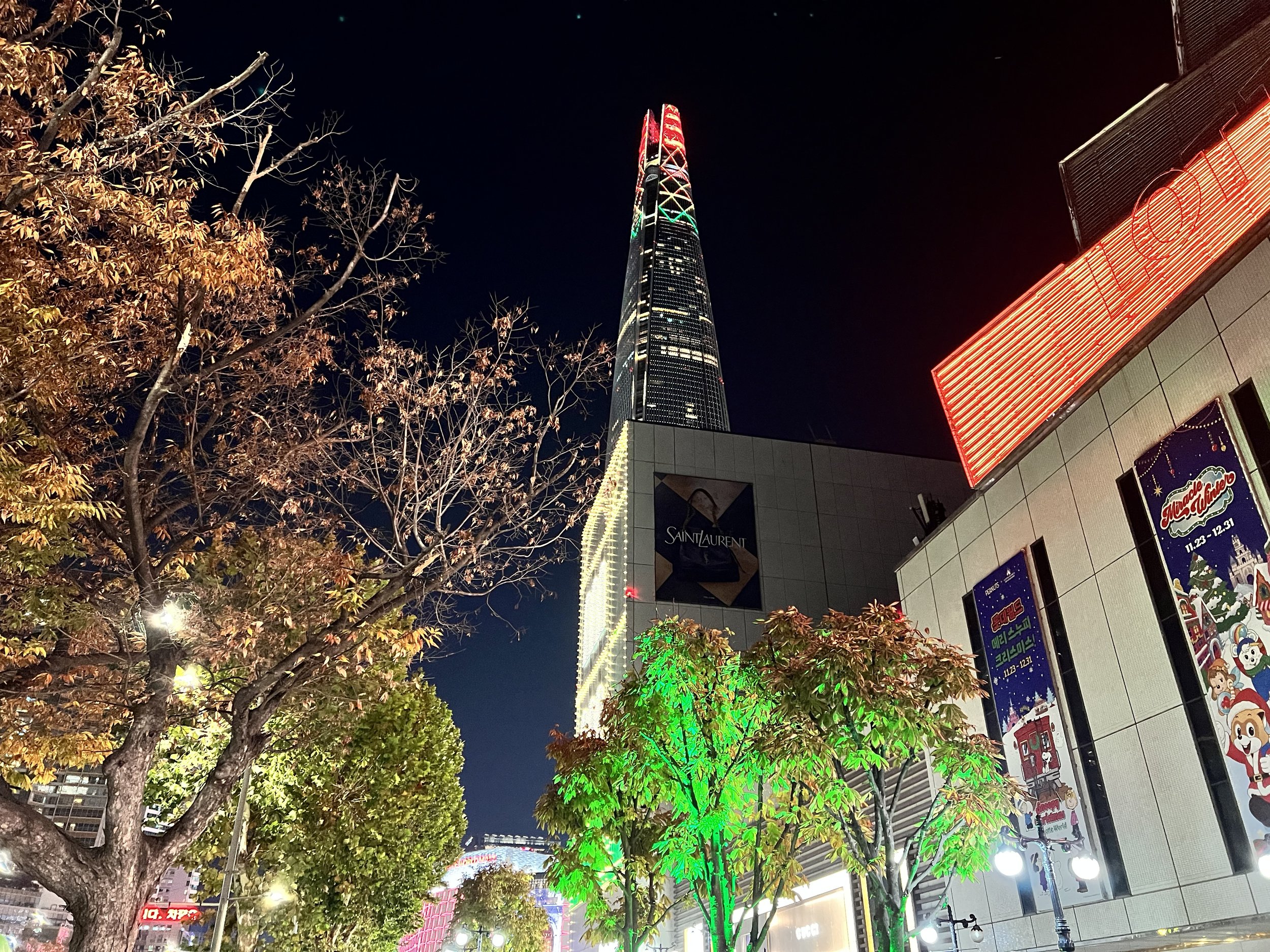 Afterwards, we took another bus towards Lotte World Tower. The building glowed in festive colours, and the surrounding area was filled with Christmas lights and decorations, so bright it almost felt like daytime. We wandered through the mall and then out to the park beside it, where more lights and food vendors added to the festive atmosphere. Despite the large crowds, it was a fun and vibrant evening.