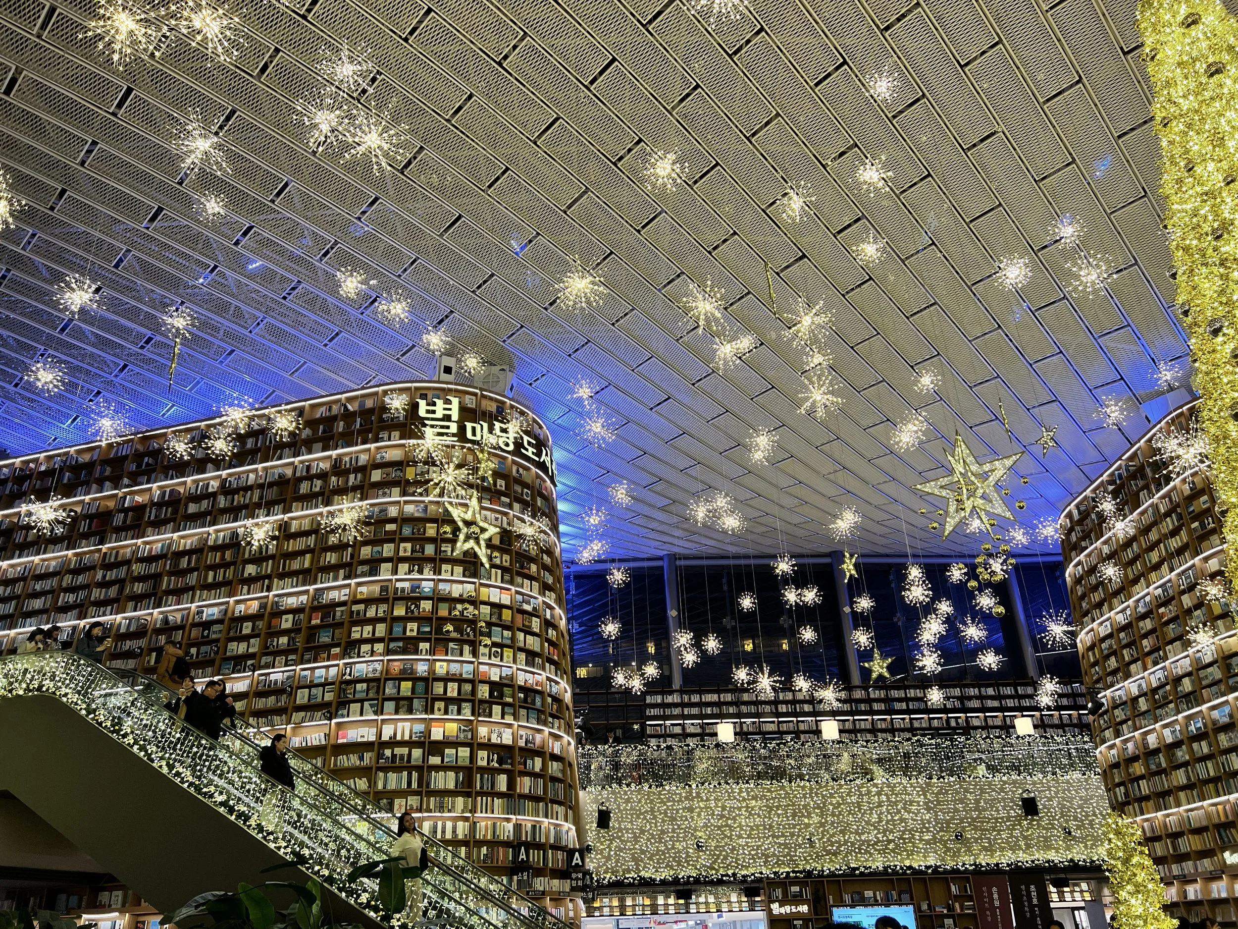 As it was Christmastime, the entire space was beautifully decorated with lights, festive displays, and a towering Christmas tree at the centre. It was busy but lively. I took the escalator up and down a few times to take in the full view and admire the design from different angles. The combination of architecture and holiday décor made the library even more magical—it was far more beautiful than I had imagined.