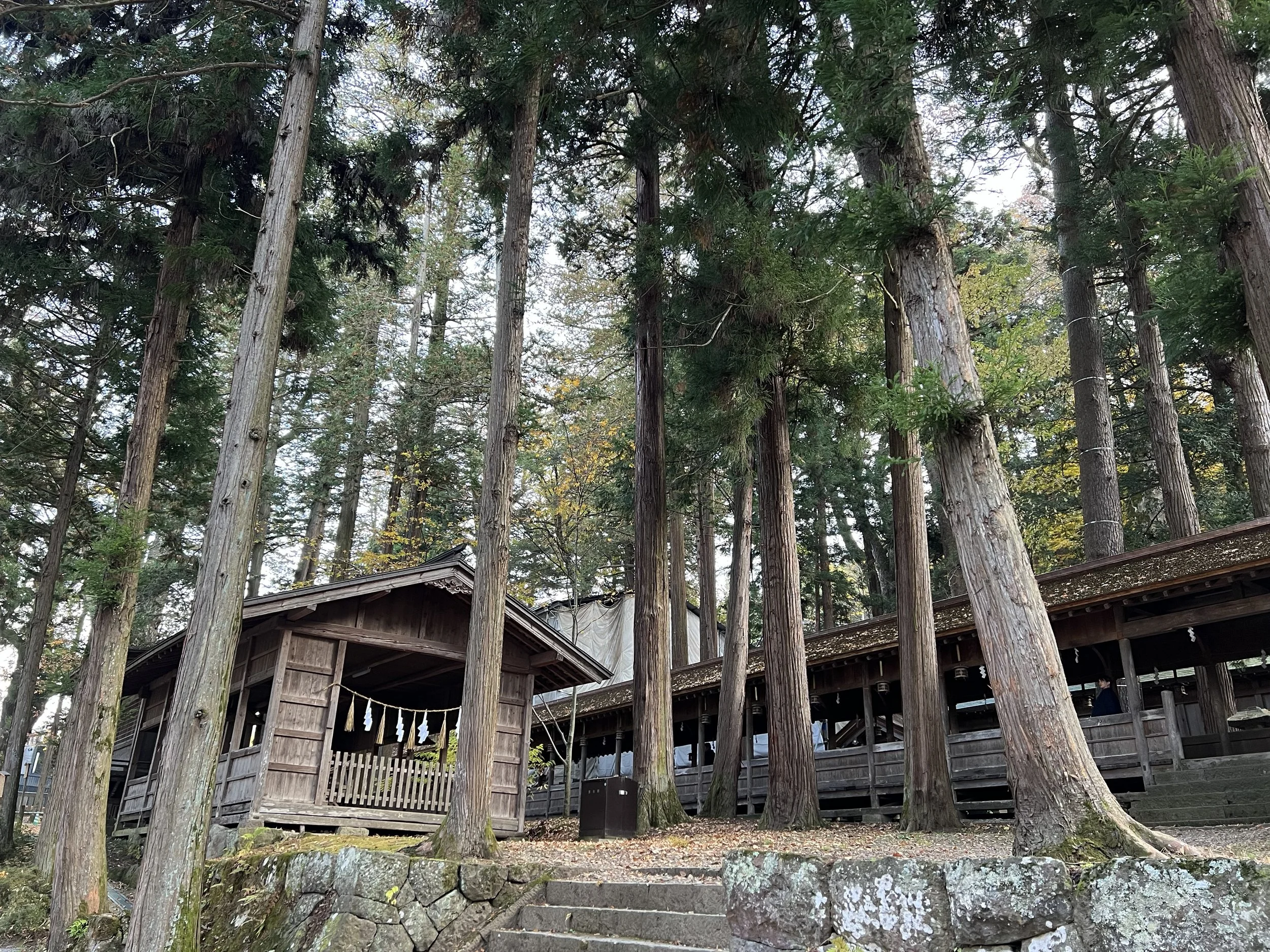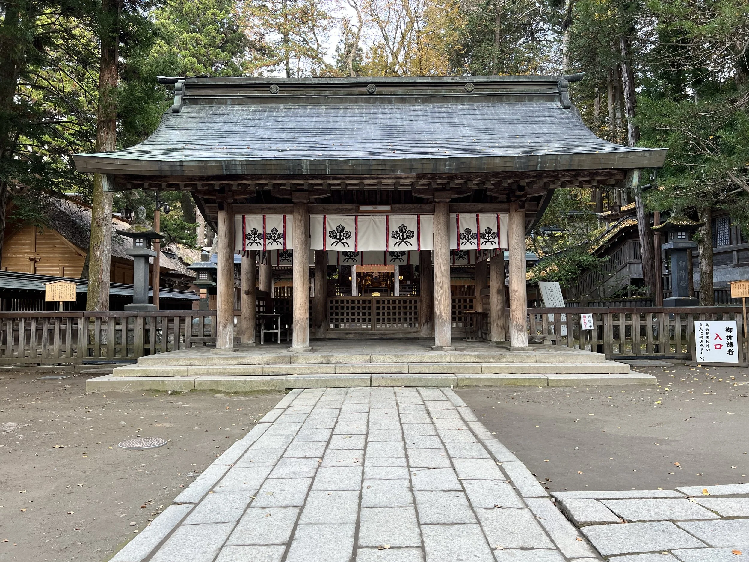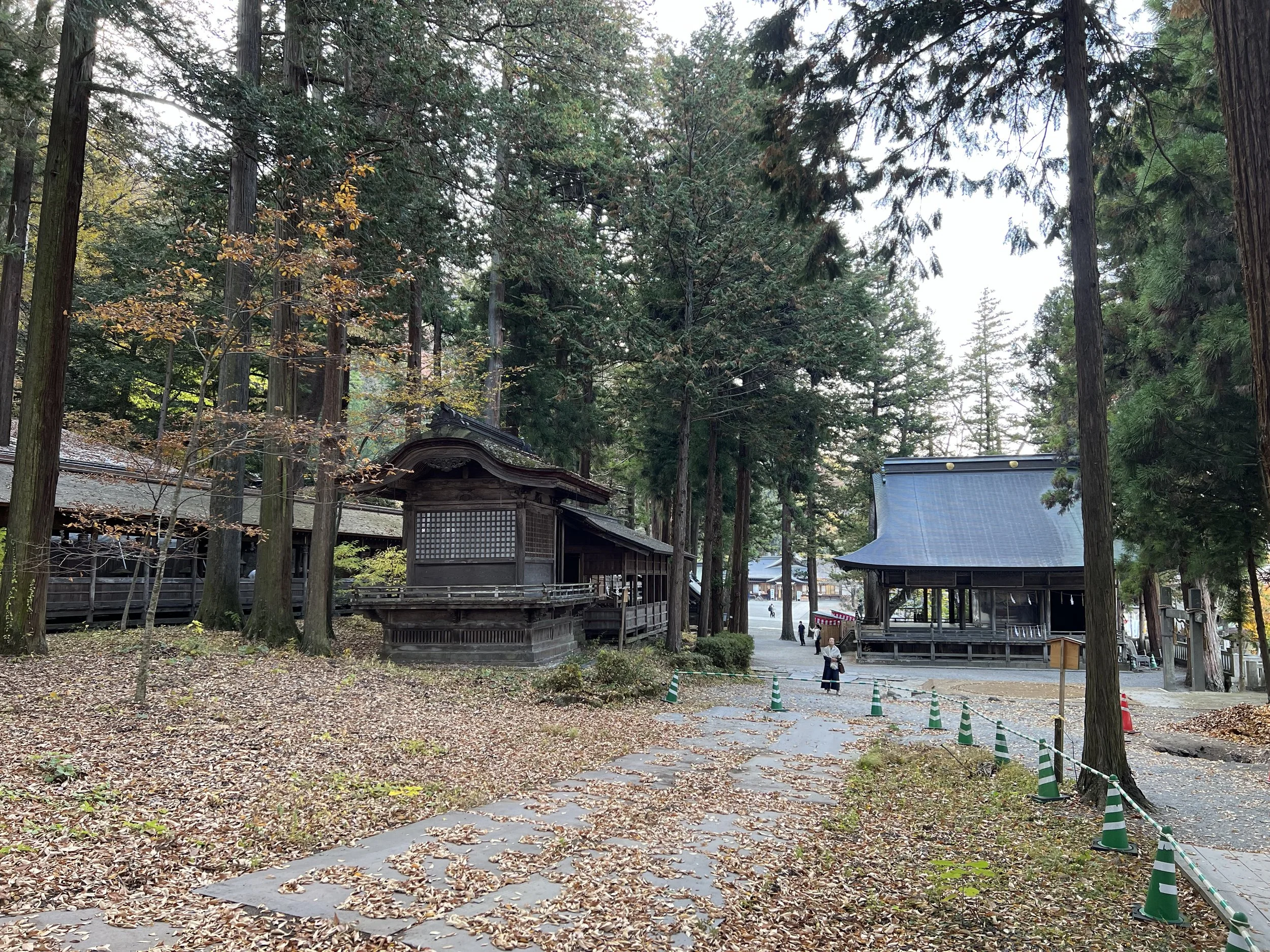 My first stop was Kamisha Maemiya. This shrine is believed to be the original site where the Suwa deity was first enshrined, and that sense of origin really comes through in its atmosphere. Compared to the other shrines, Maemiya felt the most grounded in nature. There weren’t many visitors when I arrived, which added to the stillness of the place. Interestingly, for a shrine that feels so quiet and understated, it has a fairly large parking lot—so I imagine it becomes much busier during peak seasons or festivals.