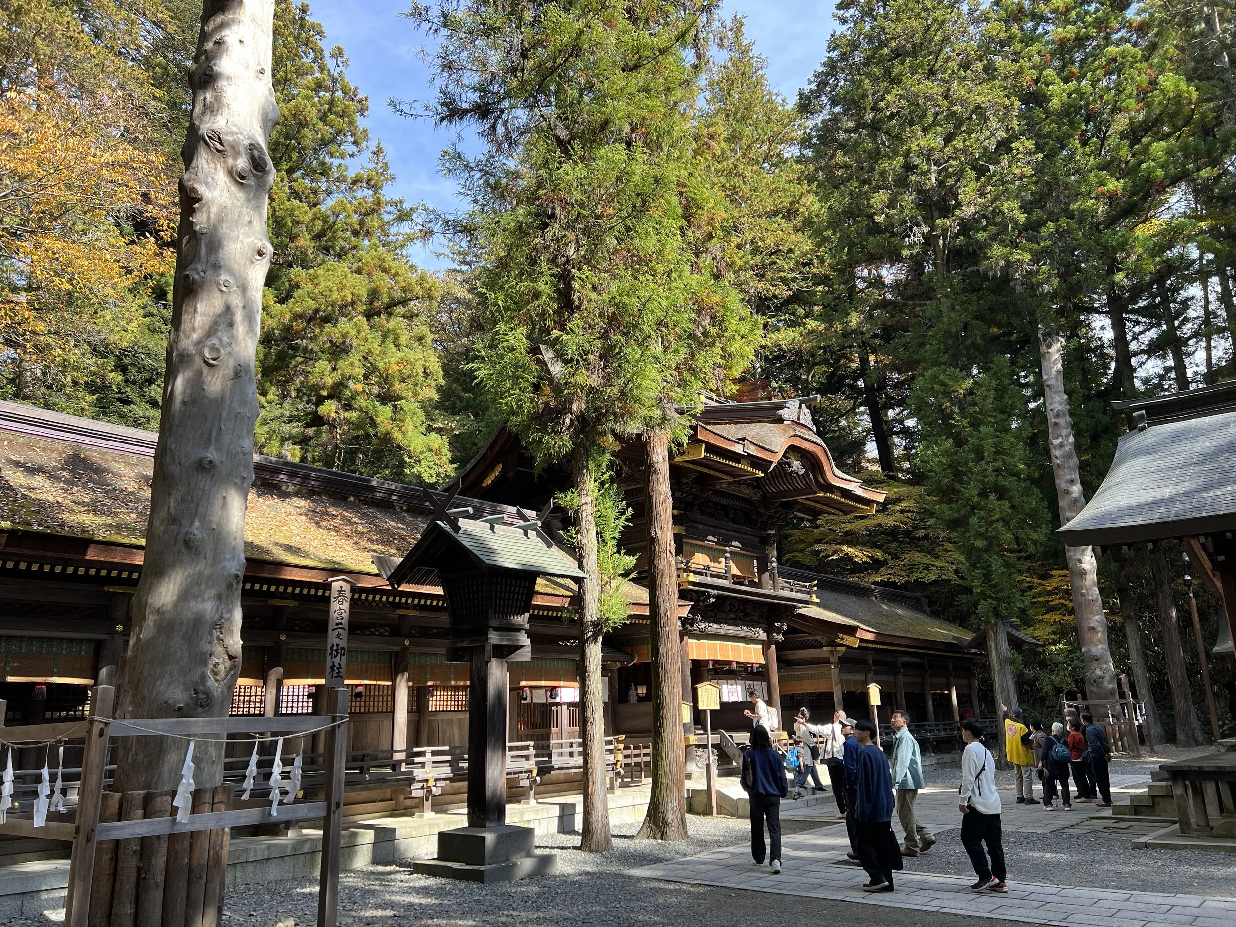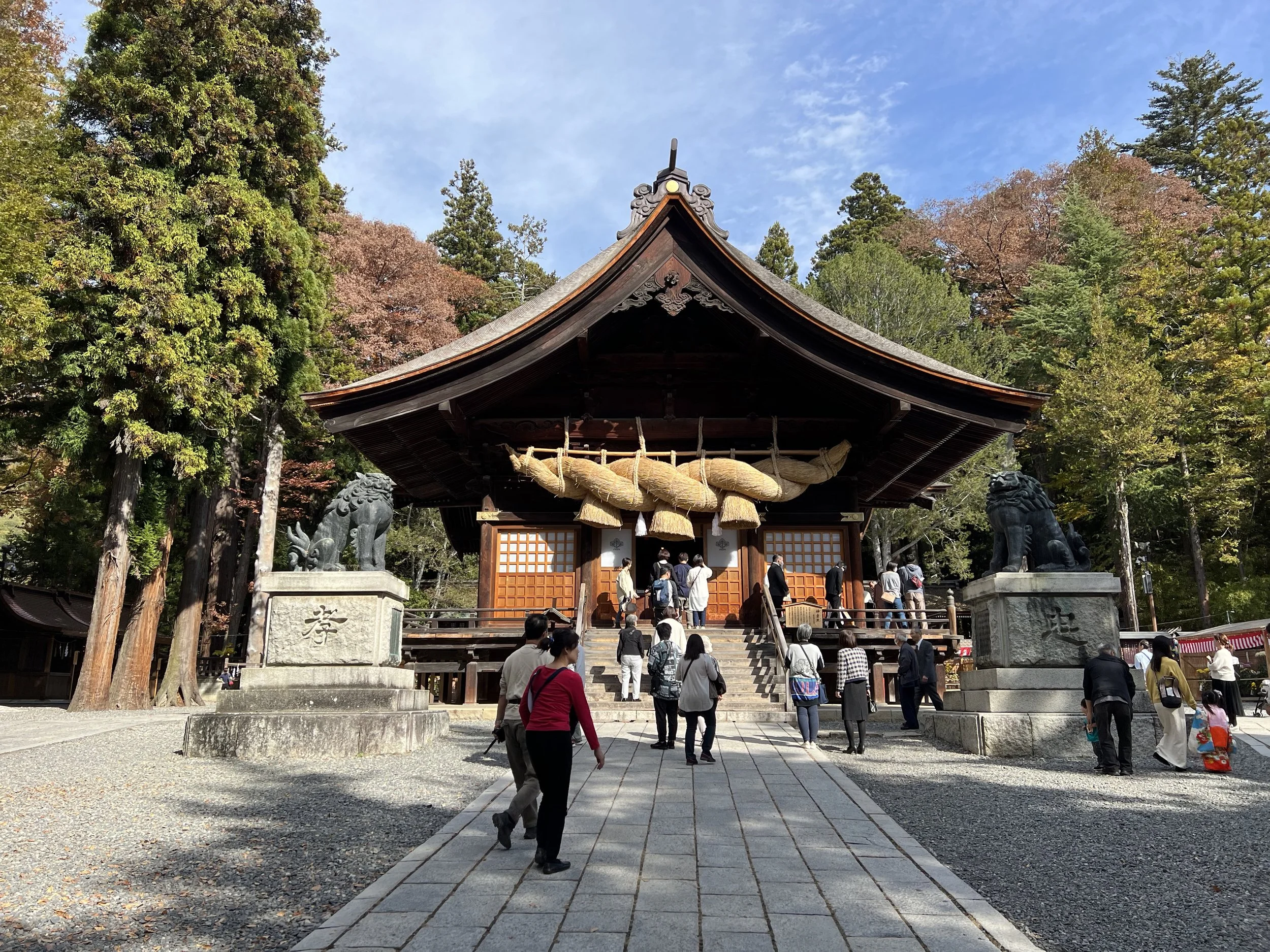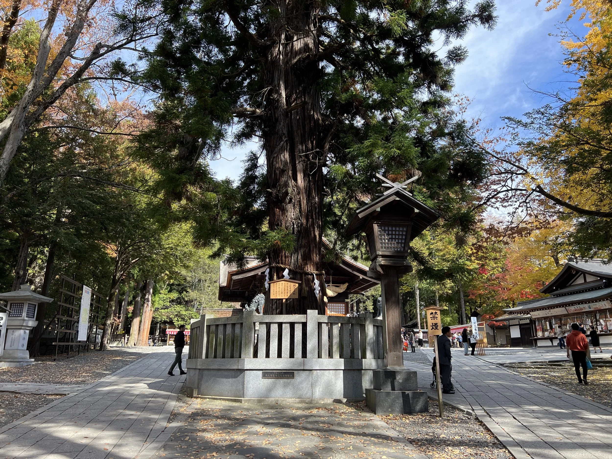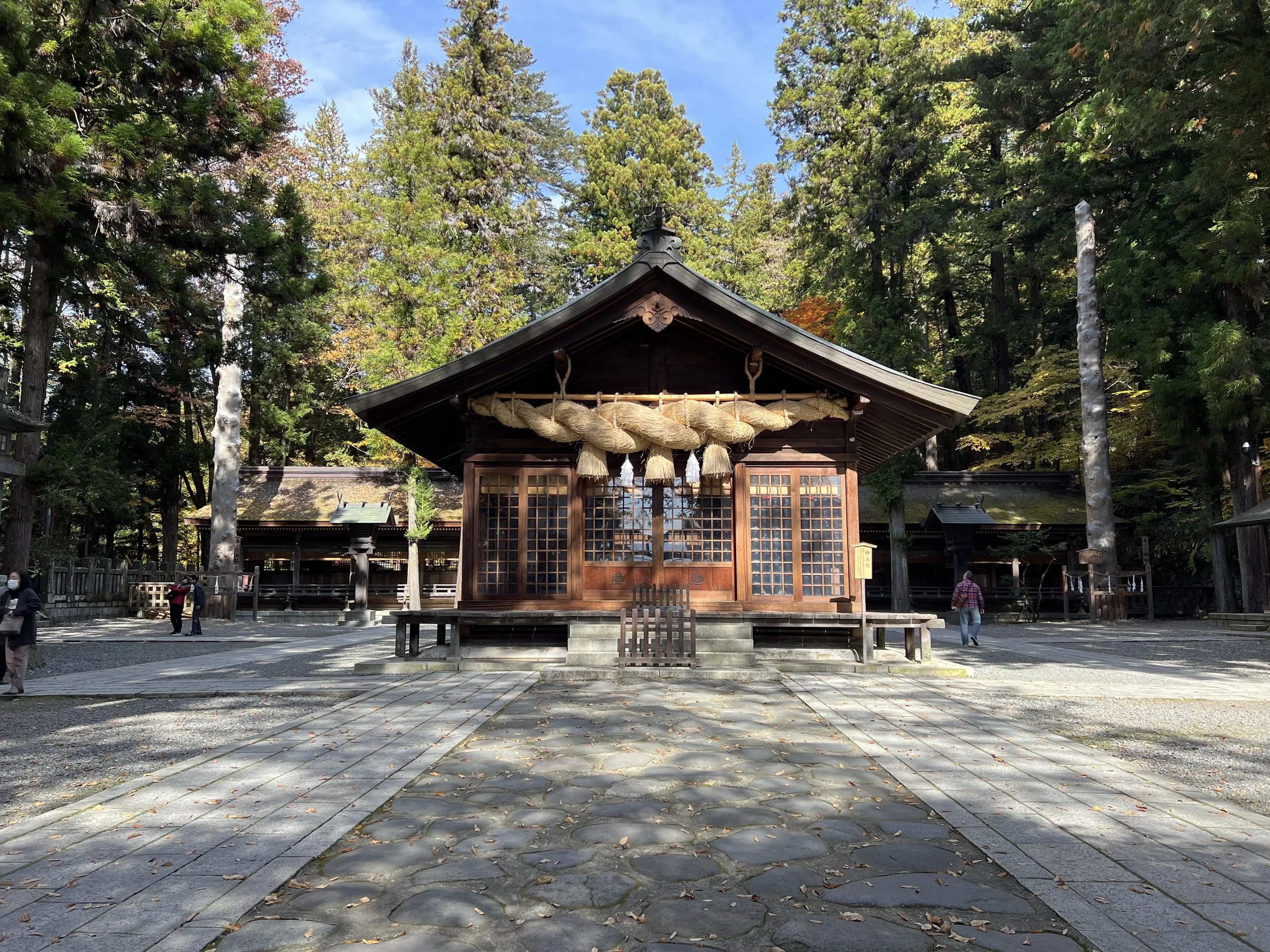 This shrine is also the most well-known of the four, largely because it houses the massive sacred logs used during the famous Onbashira Festival, held every six years. Seeing those towering logs up close gives you a sense of the scale of that tradition. I had also heard about a legend tied to an ancient tree here—one that supposedly “snores” when its branches lower. I can’t say I heard anything, but just standing among these trees, you can’t help but feel like there’s something there.